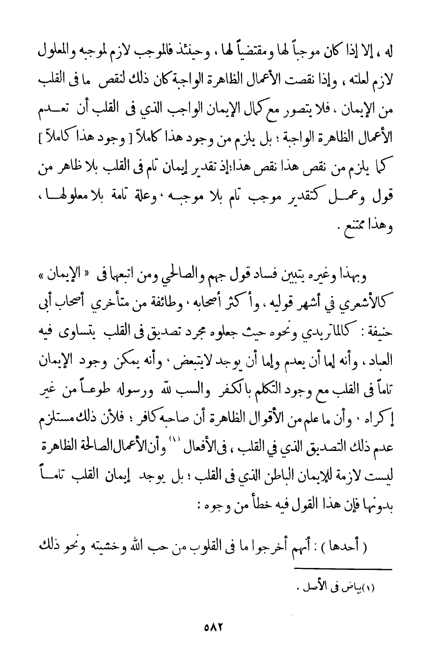 لَهُ إلَّا إذَا كَانَ مُوجِبًا لَهَا وَمُقْتَضِيًا لَهَا وَحِينَئِذٍ فَالْمُوجَبُ لَازِمٌ لِمُوجِبِهِ، وَالْمَعْلُولُ لَازِمٌ لِعِلَّتِهِ وَإِذَا نَقَصَتْ الْأَعْمَالُ الظَّاهِرَةُ الْوَاجِبَةُ كَانَ ذَلِكَ لِنَقْصِ مَا فِي الْقَلْبِ مِنْ الْإِيمَانِ فَلَا يُتَصَوَّرُ مَعَ كَمَالِ الْإِيمَانِ الْوَاجِبِ الَّذِي فِي الْقَلْبِ أَنْ تُعْدَمَ الْأَعْمَالُ الظَّاهِرَةُ الْوَاجِبَةُ؛ بَلْ يَلْزَمُ مِنْ وُجُودِ هَذَا كَامِلًا وُجُودُ هَذَا كَامِلًا، كَمَا يَلْزَمُ مِنْ نَقْصِ هَذَا نَقْصُ هَذَا؛ إذْ تَقْدِيرُ إيمَانٍ تَامٍّ فِي الْقَلْبِ بِلَا ظَاهِرٍ مِنْ قَوْلٍ وَعَمَلٍ كَتَقْدِيرِ مُوجَبٍ تَامٍّ بِلَا مُوجِبِهِ وَعِلَّةٍ تَامَّةٍ بِلَا مَعْلُولِهَا وَهَذَا مُمْتَنِعٌ. وَبِهَذَا وَغَيْرِهِ يَتَبَيَّنُ فَسَادُ قَوْلِ جَهْمٍ والصالحي وَمَنْ اتَّبَعَهُمَا فِي " الْإِيمَانِ " كَالْأَشْعَرِيِّ فِي أَشْهَرِ قَوْلَيْهِ وَأَكْثَرِ أَصْحَابِهِ وَطَائِفَةٍ مِنْ مُتَأَخِّرِي أَصْحَابِ أَبِي حَنِيفَةَ: كالماتريدي وَنَحْوِهِ حَيْثُ جَعَلُوهُ مُجَرَّدَ تَصْدِيقٍ فِي الْقَلْبِ يَتَسَاوَى فِيهِ الْعِبَادُ وَأَنَّهُ إمَّا أَنْ يُعْدَمَ، وَإِمَّا أَنْ يُوجَدَ لَا يَتَبَعَّضُ وَأَنَّهُ يُمْكِنُ وُجُودُ الْإِيمَانِ تَامًّا فِي الْقَلْبِ مَعَ وُجُودِ التَّكَلُّمِ بِالْكُفْرِ وَالسَّبِّ لِلَّهِ وَرَسُولِهِ طَوْعًا مِنْ غَيْرِ إكْرَاهٍ وَأَنَّ مَا عُلِمَ مِنْ الْأَقْوَالِ الظَّاهِرَةِ أَنَّ صَاحِبَهُ كَافِرٌ؛ فَلِأَنَّ ذَلِكَ مُسْتَلْزِمٌ عَدَمَ ذَلِكَ التَّصْدِيقِ الَّذِي فِي الْقَلْبِ، فِي الْأَفْعَالِ. . . (1) وَأَنَّ الْأَعْمَالَ الصَّالِحَةَ الظَّاهِرَةَ لَيْسَتْ لَازِمَةً لِلْإِيمَانِ الْبَاطِنِ الَّذِي فِي الْقَلْبِ؛ بَلْ يُوجَدُ إيمَانُ الْقَلْبِ تَامًّا بِدُونِهَا فَإِنَّ هَذَا الْقَوْلَ فِيهِ خَطَأٌ مِنْ وُجُوهٍ: