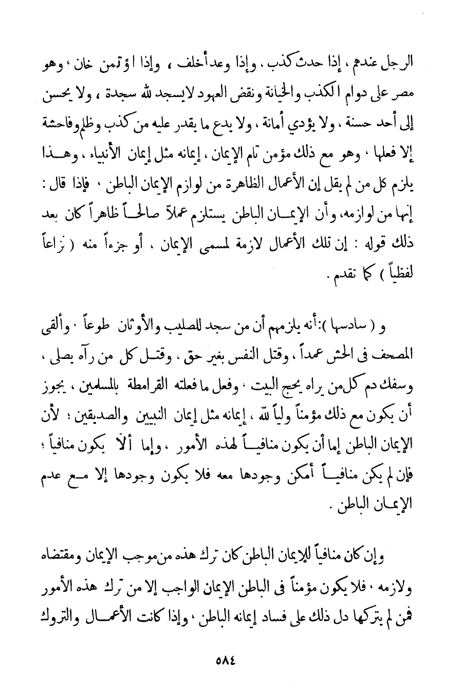 الرَّجُلُ عِنْدَهُمْ إذَا حَدَّثَ كَذَبَ وَإِذَا وَعَدَ أَخْلَفَ وَإِذَا اُؤْتُمِنَ خَانَ وَهُوَ مُصِرٌّ عَلَى دَوَامِ الْكَذِبِ وَالْخِيَانَةِ وَنَقْضِ الْعُهُودِ لَا يَسْجُدُ لِلَّهِ سَجْدَةً، وَلَا يُحْسِنُ إلَى أَحَدٍ حَسَنَةً، وَلَا يُؤَدِّي أَمَانَةً وَلَا يَدَعُ مَا يَقْدِرُ عَلَيْهِ مِنْ كَذِبٍ وَظُلْمٍ وَفَاحِشَةٍ إلَّا فَعَلَهَا وَهُوَ مَعَ ذَلِكَ مُؤْمِنٌ تَامُّ الْإِيمَانِ، إيمَانُهُ مِثْلُ إيمَانِ الْأَنْبِيَاءِ، وَهَذَا يَلْزَمُ كُلَّ مَنْ لَمْ يَقُلْ إنَّ الْأَعْمَالَ الظَّاهِرَةَ مِنْ لَوَازِمِ الْإِيمَانِ الْبَاطِنِ فَإِذَا قَالَ: إنَّهَا مِنْ لَوَازِمِهِ وَأَنَّ الْإِيمَانَ الْبَاطِنَ يَسْتَلْزِمُ عَمَلًا صَالِحًا ظَاهِرًا كَانَ بَعْدَ ذَلِكَ، قَوْلُهُ: إنَّ تِلْكَ الْأَعْمَالَ لَازِمَةٌ لِمُسَمَّى الْإِيمَانِ أَوْ جُزْءٌ مِنْهُ (نِزَاعًا لَفْظِيًّا كَمَا تَقَدَّمَ) . وَ (سَادِسُهَا) : أَنَّهُ يَلْزَمُهُمْ أَنَّ مَنْ سَجَدَ لِلصَّلِيبِ وَالْأَوْثَانِ طَوْعًا وَأَلْقَى الْمُصْحَفَ فِي الْحُشِّ عَمْدًا، وَقَتَلَ النَّفْسَ بِغَيْرِ حَقٍّ وَقَتَلَ كُلَّ مَنْ رَآهُ يُصَلِّي وَسَفَكَ دَمَ كُلِّ مَنْ يَرَاهُ يَحُجُّ الْبَيْتَ؛ وَفَعَلَ مَا فَعَلَتْهُ الْقَرَامِطَةُ بِالْمُسْلِمِينَ يَجُوزُ أَنْ يَكُونَ مَعَ ذَلِكَ مُؤْمِنًا وَلِيًّا لِلَّهِ، إيمَانُهُ مِثْلُ إيمَانِ النَّبِيِّينَ وَالصِّدِّيقِينَ؛ لِأَنَّ الْإِيمَانَ الْبَاطِنَ إمَّا أَنْ يَكُونَ مُنَافِيًا لِهَذِهِ الْأُمُورِ وَإِمَّا أَلَّا يَكُونَ مُنَافِيًا؛ فَإِنْ لَمْ يَكُنْ مُنَافِيًا أَمْكَنَ وُجُودُهَا مَعَهُ فَلَا يَكُونُ وُجُودُهَا إلَّا مَعَ عَدَمِ الْإِيمَانِ الْبَاطِنِ. وَإِنْ كَانَ مُنَافِيًا لِلْإِيمَانِ الْبَاطِنِ كَانَ تَرْكُ هَذِهِ مِنْ مُوجَبِ الْإِيمَانِ وَمُقْتَضَاهُ وَلَازِمِهِ فَلَا يَكُونُ مُؤْمِنًا فِي الْبَاطِنِ الْإِيمَانَ الْوَاجِبَ إلَّا مَنْ تَرَكَ هَذِهِ الْأُمُورَ فَمَنْ لَمْ يَتْرُكْهَا دَلَّ ذَلِكَ عَلَى فَسَادِ إيمَانِهِ الْبَاطِنِ وَإِذَا كَانَتْ الْأَعْمَالُ والتروك