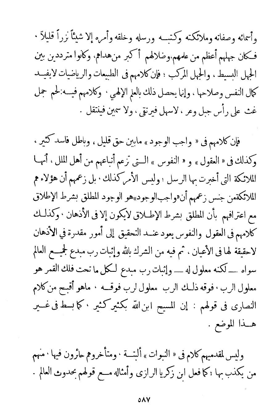 وَأَسْمَائِهِ وَصِفَاتِهِ وَمَلَائِكَتِهِ وَكُتُبِهِ وَرُسُلِهِ وَخَلْقِهِ وَأَمْرِهِ إلَّا شَيْئًا نَزْرًا قَلِيلًا فَكَانَ جَهْلُهُمْ أَعْظَمَ مِنْ عِلْمِهِمْ، وَضَلَالُهُمْ أَكْبَرَ مَنْ هُدَاهُمْ وَكَانُوا مُتَرَدِّدِينَ بَيْنَ الْجَهْلِ الْبَسِيطِ وَالْجَهْلِ الْمُرَكَّبِ؛ فَإِنَّ كَلَامَهُمْ فِي الطَّبِيعَاتِ وَالرِّيَاضِيَّاتِ لَا يُفِيدُ كَمَالَ النَّفْسِ وَصَلَاحَهَا وَإِنَّمَا يَحْصُلُ ذَلِكَ بِالْعِلْمِ الْإِلَهِيِّ وَكَلَامُهُمْ فِيهِ: لَحْمُ جَمَلٍ غَثٍّ عَلَى رَأْسِ جَبَلٍ وَعْرٍ لَا سَهْلٌ فَيُرْتَقَى وَلَا سَمِينٌ فَيُنْتَقَلُ. فَإِنَّ كَلَامَهُمْ فِي " وَاجِبِ الْوُجُودِ " مَا بَيْنَ حَقٍّ قَلِيلٍ وَبَاطِلٍ فَاسِدٍ كَثِيرٍ وَكَذَلِكَ فِي " الْعُقُولِ " وَ " النُّفُوسِ " الَّتِي تَزْعُمُ أَتْبَاعُهُمْ مِنْ أَهْلِ الْمِلَلِ أَنَّهَا الْمَلَائِكَةُ الَّتِي أَخْبَرَتْ بِهَا الرُّسُلُ؛ وَلَيْسَ الْأَمْرُ كَذَلِكَ بَلْ زَعْمُهُمْ أَنَّ هَؤُلَاءِ هُمْ الْمَلَائِكَةُ مِنْ جِنْسِ زَعْمِهِمْ أَنَّ " وَاجِبَ الْوُجُودِ " هُوَ الْوُجُودُ الْمُطْلَقُ بِشَرْطِ الْإِطْلَاقِ مَعَ اعْتِرَافِهِمْ بِأَنَّ الْمُطْلَقَ بِشَرْطِ الْإِطْلَاقِ لَا يَكُونُ إلَّا فِي الْأَذْهَانِ وَكَذَلِكَ كَلَامُهُمْ فِي الْعُقُولِ وَالنُّفُوسِ يَعُودُ عِنْدَ التَّحْقِيقِ إلَى أُمُورٍ مُقَدَّرَةٍ فِي الْأَذْهَانِ لَا حَقِيقَةَ لَهَا فِي الْأَعْيَانِ ثُمَّ فِيهِ مِنْ الشِّرْكِ بِاَللَّهِ وَإِثْبَاتِ رَبٍّ مُبْدِعٍ لِجَمِيعِ الْعَالَمِ سِوَاهُ - لَكِنَّهُ مَعْلُولٌ لَهُ - وَإِثْبَاتُ رَبٍّ مُبْدِعٍ لِكُلِّ مَا تَحْتَ فَلَكِ الْقَمَرِ هُوَ مَعْلُولُ الرَّبِّ فَوْقَهُ، ذَلِكَ الرَّبُّ مَعْلُولٌ لِرَبِّ فَوْقَهُ مَا هُوَ أَقْبَحُ مِنْ كَلَامِ النَّصَارَى فِي قَوْلِهِمْ: إنَّ الْمَسِيحَ ابْنُ اللَّهِ بِكَثِيرِ كَثِيرٍ كَمَا بُسِطَ فِي غَيْرِ هَذَا الْمَوْضِعِ. وَلَيْسَ لِمُقَدِّمِيهِمْ كَلَامٌ فِي " النُّبُوَّاتِ " أَلْبَتَّةَ وَمُتَأَخِّرُوهُمْ حَائِرُونَ فِيهَا مِنْهُمْ مَنْ يُكَذِّبُ بِهَا؛ كَمَا فَعَلَ ابْنُ زَكَرِيَّا الرَّازِي وَأَمْثَالُهُ مَعَ قَوْلِهِمْ بِحُدُوثِ الْعَالَمِ.