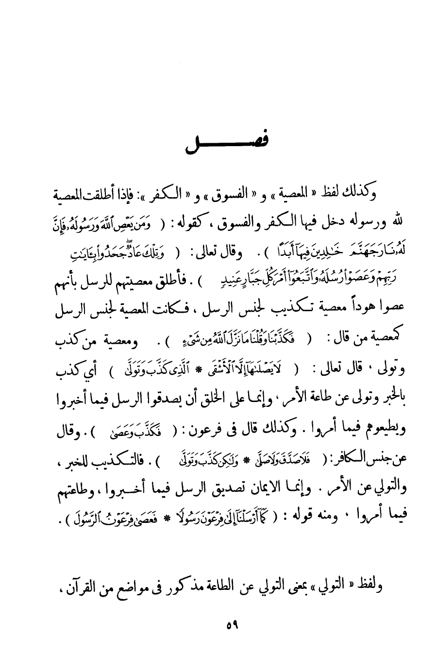 وَكَذَلِكَ لَفْظُ " الْمَعْصِيَةِ " وَ " الْفُسُوقِ " وَ " الْكُفْرِ ": فَإِذَا أُطْلِقَتْ الْمَعْصِيَةُ لِلَّهِ وَرَسُولِهِ دَخَلَ فِيهَا الْكُفْرُ وَالْفُسُوقُ كَقَوْلِهِ: {وَمَنْ يَعْصِ اللَّهَ وَرَسُولَهُ فَإِنَّ لَهُ نَارَ جَهَنَّمَ خَالِدِينَ فِيهَا أَبَدًا} . وَقَالَ تَعَالَى: {وَتِلْكَ عَادٌ جَحَدُوا بِآيَاتِ رَبِّهِمْ وَعَصَوْا رُسُلَهُ وَاتَّبَعُوا أَمْرَ كُلِّ جَبَّارٍ عَنِيدٍ} . فَأَطْلَقَ مَعْصِيَتَهُمْ لِلرُّسُلِ بِأَنَّهُمْ عَصَوْا هُودًا مَعْصِيَةَ تَكْذِيبٍ لِجِنْسِ الرُّسُلِ فَكَانَتْ الْمَعْصِيَةُ لِجِنْسِ الرُّسُلِ كَمَعْصِيَةِ مَنْ قَالَ: {فَكَذَّبْنَا وَقُلْنَا مَا نَزَّلَ اللَّهُ مِنْ شَيْءٍ} . وَمَعْصِيَةِ مَنْ كَذَّبَ وَتَوَلَّى قَالَ تَعَالَى: {لَا يَصْلَاهَا إلَّا الْأَشْقَى} {الَّذِي كَذَّبَ وَتَوَلَّى} أَيْ كَذَّبَ بِالْخَيْرِ وَتَوَلَّى عَنْ طَاعَةِ الْأَمْرِ، وَإِنَّمَا عَلَى الْخَلْقِ أَنْ يُصَدِّقُوا الرُّسُلَ فِيمَا أَخْبَرُوا وَيُطِيعُوهُمْ فِيمَا أَمَرُوا. وَكَذَلِكَ قَالَ فِي فِرْعَوْنَ: {فَكَذَّبَ وَعَصَى} . وَقَالَ عَنْ جِنْسِ الْكَافِرِ: {فَلَا صَدَّقَ وَلَا صَلَّى} {وَلَكِنْ كَذَّبَ وَتَوَلَّى} . فَالتَّكْذِيبُ لِلْخَبَرِ وَالتَّوَلِّي عَنْ الْأَمْرِ. وَإِنَّمَا الْإِيمَانُ تَصْدِيقُ الرُّسُلِ فِيمَا أَخْبَرُوا وَطَاعَتُهُمْ فِيمَا أَمَرُوا وَمِنْهُ قَوْلُهُ: {كَمَا أَرْسَلْنَا إلَى فِرْعَوْنَ رَسُولًا} {فَعَصَى فِرْعَوْنُ الرَّسُولَ} .
