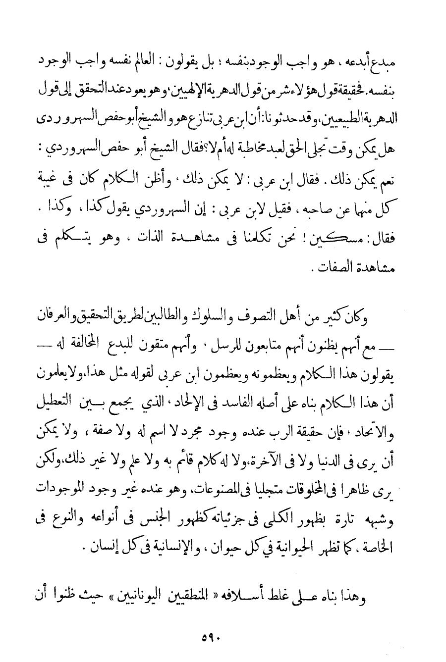 مُبْدِعٌ أَبْدَعَهُ هُوَ وَاجِبُ الْوُجُودِ بِنَفْسِهِ؛ بَلْ يَقُولُونَ: الْعَالَمُ نَفْسُهُ وَاجِبُ الْوُجُودِ بِنَفْسِهِ. فَحَقِيقَةُ قَوْلِ هَؤُلَاءِ شَرٌّ مِنْ قَوْلِ الدَّهْرِيَّةِ الإلهيين وَهُوَ يَعُودُ عِنْدَ التَّحَقُّقِ إلَى قَوْلِ الدَّهْرِيَّةِ الطَّبِيعِيِّينَ وَقَدْ حَدَّثُونَا: أَنَّ ابْنَ عَرَبِيٍّ تَنَازَعَ هُوَ وَالشَّيْخُ أَبُو حَفْصٍ السهروردي: هَلْ يُمْكِنُ وَقْتَ تَجَلِّي الْحَقِّ لِعَبْدِ مُخَاطَبَةٌ لَهُ أَمْ لَا؟ فَقَالَ الشَّيْخُ أَبُو حَفْصٍ السهروردي: نَعَمْ يُمْكِنُ ذَلِكَ. فَقَالَ ابْنُ عَرَبِيٍّ: لَا يُمْكِنُ ذَلِكَ وَأَظُنُّ الْكَلَامَ كَانَ فِي غَيْبَةِ كُلٍّ مِنْهُمَا عَنْ صَاحِبِهِ فَقِيلَ لِابْنِ عَرَبِيٍّ: إنَّ السهروردي يَقُولُ كَذَا وَكَذَا. فَقَالَ: مِسْكِينٌ نَحْنُ تَكَلَّمْنَا فِي مُشَاهَدَةِ الذَّاتِ وَهُوَ يَتَكَلَّمُ فِي مُشَاهَدَةِ الصِّفَاتِ. وَكَانَ كَثِيرٌ مِنْ أَهْلِ التَّصَوُّفِ وَالسُّلُوكِ وَالطَّالِبِينَ لِطَرِيقِ التَّحْقِيقِ وَالْعِرْفَانِ - مَعَ أَنَّهُمْ يَظُنُّونَ أَنَّهُمْ مُتَابِعُونَ لِلرُّسُلِ وَأَنَّهُمْ مُتَّقُونَ لِلْبِدَعِ الْمُخَالِفَةِ لَهُ - يَقُولُونَ هَذَا الْكَلَامَ وَيُعَظِّمُونَهُ وَيُعَظِّمُونَ ابْنَ عَرَبِيٍّ لِقَوْلِهِ مِثْلَ هَذَا وَلَا يَعْلَمُونَ أَنَّ هَذَا الْكَلَامَ بَنَاهُ عَلَى أَصْلِهِ الْفَاسِدِ فِي الْإِلْحَادِ الَّذِي يَجْمَعُ بَيْنَ التَّعْطِيلِ وَالِاتِّحَادِ؛ فَإِنَّ حَقِيقَةَ الرَّبِّ عِنْدَهُ وُجُودٌ مُجَرَّدٌ لَا اسْمٌ لَهُ وَلَا صِفَةٌ وَلَا يُمْكِنُ أَنْ يُرَى فِي الدُّنْيَا وَلَا فِي الْآخِرَةِ وَلَا لَهُ كَلَامٌ قَائِمٌ بِهِ وَلَا عِلْمٌ وَلَا غَيْرُ ذَلِكَ وَلَكِنْ يُرَى ظَاهِرًا فِي الْمَخْلُوقَاتِ مُتَجَلِّيًا فِي الْمَصْنُوعَاتِ وَهُوَ عِنْدَهُ غَيْرُ وُجُودِ الْمَوْجُودَاتِ وَشَبَهِهِ، وَتَارَةً بِظُهُورِ الْكُلِّيِّ فِي جُزْئِيَّاتِهِ كَظُهُورِ الْجِنْسِ فِي أَنْوَاعِهِ وَالنَّوْعِ فِي الْخَاصَّةِ كَمَا تَظْهَرُ الْحَيَوَانِيَّةُ فِي كُلِّ حَيَوَانٍ والإنسانية فِي كُلِّ إنْسَانٍ. وَهَذَا بَنَاهُ عَلَى غَلَطِ أَسْلَافِهِ " الْمَنْطِقِيِّينَ الْيُونَانِيِّينَ " حَيْثُ ظَنُّوا أَنَّ