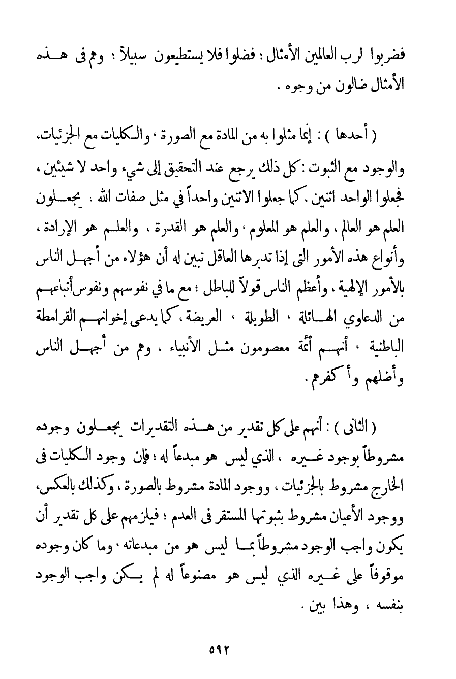أَحَدُهَا: إنَّمَا مَثَّلُوا بِهِ مِنْ الْمَادَّةِ مَعَ الصُّورَةِ وَالْكُلِّيَّاتِ مَعَ الْجُزْئِيَّاتِ وَالْوُجُودِ مَعَ الثُّبُوتِ: كُلُّ ذَلِكَ يَرْجِعُ عِنْدَ التَّحْقِيقِ إلَى شَيْءٍ وَاحِدٍ لَا شَيْئَيْنِ فَجَعَلُوا الْوَاحِدَ اثْنَيْنِ كَمَا جَعَلُوا الِاثْنَيْنِ وَاحِدًا فِي مِثْلِ صِفَاتِ اللَّهِ يَجْعَلُونَ الْعِلْمَ هُوَ الْعَالِمُ، وَالْعِلْمَ هُوَ الْمَعْلُومُ وَالْعِلْمَ هُوَ الْقُدْرَةُ، وَالْعِلْمَ هُوَ الْإِرَادَةُ وَأَنْوَاعُ هَذِهِ الْأُمُورِ الَّتِي إذَا تَدَبَّرَهَا الْعَاقِلُ تَبَيَّنَ لَهُ أَنَّ هَؤُلَاءِ مِنْ أَجْهَلِ النَّاسِ بِالْأُمُورِ الْإِلَهِيَّةِ، وَأَعْظَمِ النَّاسِ قَوْلًا لِلْبَاطِلِ؛ مَعَ مَا فِي نُفُوسِهِمْ وَنُفُوسِ أَتْبَاعِهِمْ مِنْ الدَّعَاوَى الْهَائِلَةِ الطَّوِيلَةِ الْعَرِيضَةِ كَمَا يَدَّعِي إخْوَانُهُمْ الْقَرَامِطَةُ الْبَاطِنِيَّةُ أَنَّهُمْ أَئِمَّةٌ مَعْصُومُونَ مِثْلُ الْأَنْبِيَاءِ وَهُمْ مِنْ أَجْهَلِ النَّاسِ وَأَضَلِّهِمْ وَأَكْفَرِهِمْ. (الثَّانِي) : أَنَّهُمْ عَلَى كُلِّ تَقْدِيرٍ مِنْ هَذِهِ التَّقْدِيرَاتِ يَجْعَلُونَ وُجُودَهُ مَشْرُوطًا بِوُجُودِ غَيْرِهِ الَّذِي لَيْسَ هُوَ مُبْدِعًا لَهُ؛ فَإِنَّ وُجُودَ الْكُلِّيَّاتِ فِي الْخَارِجِ مَشْرُوطٌ بِالْجُزْئِيَّاتِ، وَوُجُودَ الْمَادَّةِ مَشْرُوطٌ بِالصُّورَةِ وَكَذَلِكَ بِالْعَكْسِ، وَوُجُودَ الْأَعْيَانِ مَشْرُوطٌ بِثُبُوتِهَا الْمُسْتَقِرِّ فِي الْعَدَمِ؛ فَيَلْزَمُهُمْ عَلَى كُلِّ تَقْدِيرٍ أَنْ يَكُونَ وَاجِبُ الْوُجُودِ مَشْرُوطًا بِمَا لَيْسَ هُوَ مِنْ مُبْدِعَاتِهِ، وَمَا كَانَ وُجُودُهُ مَوْقُوفًا عَلَى غَيْرِهِ الَّذِي لَيْسَ هُوَ مَصْنُوعًا لَهُ لَمْ يَكُنْ وَاجِبَ الْوُجُودِ بِنَفْسِهِ وَهَذَا بَيِّنٌ.