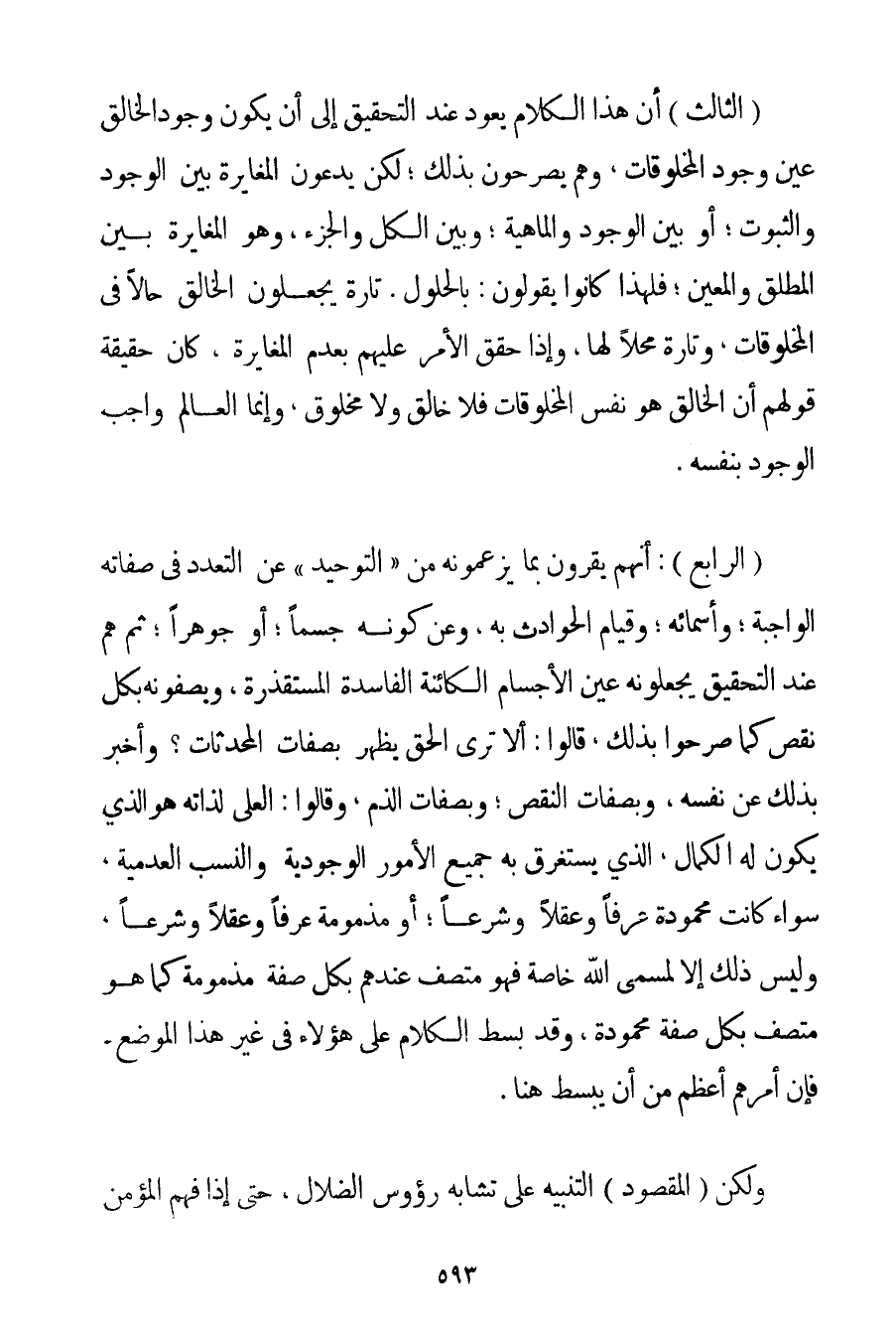 الثَّالِثُ: أَنَّ هَذَا الْكَلَامَ يَعُودُ عِنْدَ التَّحْقِيقِ إلَى أَنْ يَكُونَ وُجُودُ الْخَالِقِ عَيْنَ وُجُودِ الْمَخْلُوقَاتِ وَهُمْ يُصَرِّحُونَ بِذَلِكَ؛ لَكِنْ يَدَّعُونَ الْمُغَايَرَةَ بَيْنَ الْوُجُودِ وَالثُّبُوتِ: أَوْ بَيْنَ الْوُجُودِ وَالْمَاهِيَّةِ: وَبَيْنَ الْكُلِّ وَالْجُزْءِ، وَهُوَ الْمُغَايَرَةُ بَيْنَ الْمُطْلَقِ وَالْمُعَيَّنِ؛ فَلِهَذَا كَانُوا يَقُولُونَ: بِالْحُلُولِ. تَارَةً يَجْعَلُونَ الْخَالِقَ حَالًّا فِي الْمَخْلُوقَاتِ، وَتَارَةً مَحَلًّا لَهَا وَإِذَا حَقَّقَ الْأَمْرُ عَلَيْهِمْ بِعَدَمِ الْمُغَايَرَةِ كَانَ حَقِيقَةُ قَوْلِهِمْ أَنَّ الْخَالِقَ هُوَ نَفْسُ الْمَخْلُوقَاتِ فَلَا خَالِقَ وَلَا مَخْلُوقَ وَإِنَّمَا الْعَالَمُ وَاجِبُ الْوُجُودِ بِنَفْسِهِ.