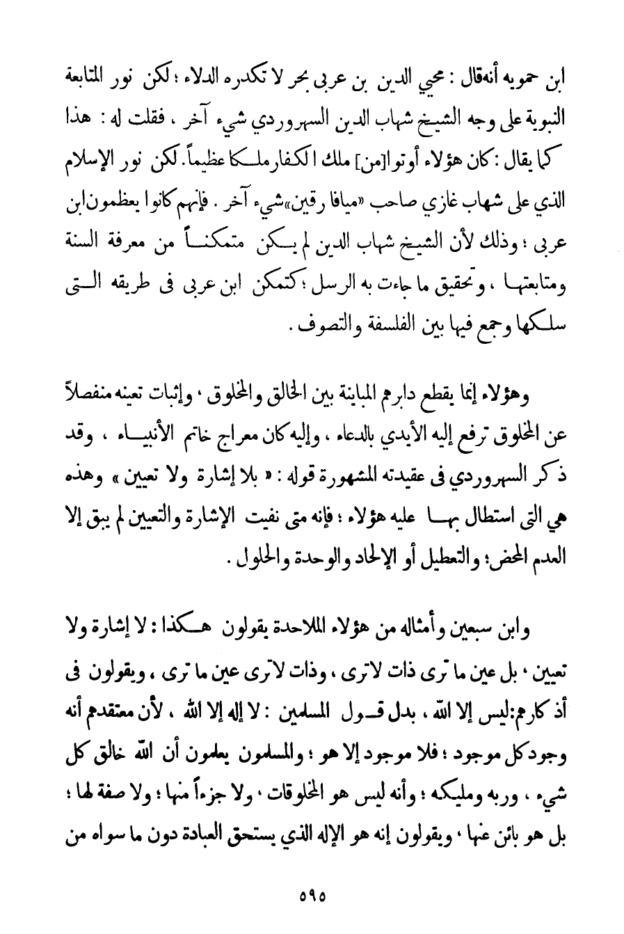 بْنِ حمويه أَنَّهُ قَالَ: مُحْيِي الدِّينِ ابْنُ عَرَبِيٍّ بَحْرٌ لَا تُكَدِّرُهُ الدِّلَاءُ؛ لَكِنَّ نُورَ الْمُتَابَعَةِ النَّبَوِيَّةِ عَلَى وَجْهِ الشَّيْخِ شِهَابِ الدِّينِ السهروردي شَيْءٌ آخَرُ فَقُلْت لَهُ: هَذَا كَمَا يُقَالُ: كَانَ هَؤُلَاءِ أُوتُوا مَنْ مُلْكِ الْكُفَّارِ مُلْكًا عَظِيمًا. لَكِنَّ نُورَ الْإِسْلَامِ الَّذِي عَلَى شِهَابِ غَازِيٍّ صَاحِبِ " ميافا رُقِّينَ " شَيْءٌ آخَرُ. فَإِنَّهُمْ كَانُوا يُعَظِّمُونَ ابْنَ عَرَبِيٍّ؛ وَذَلِكَ لِأَنَّ الشَّيْخَ شِهَابَ الدِّينِ لَمْ يَكُنْ مُتَمَكِّنًا مِنْ مَعْرِفَةِ السُّنَّةِ وَمُتَابَعَتِهَا وَتَحْقِيقِ مَا جَاءَتْ بِهِ الرُّسُلُ؛ كَتَمَكُّنِ ابْنِ عَرَبِيٍّ فِي طَرِيقِهِ الَّتِي سَلَكَهَا وَجَمَعَ فِيهَا بَيْنَ الْفَلْسَفَةِ وَالتَّصَوُّفِ. وَهَؤُلَاءِ إنَّمَا يَقْطَعُ دَابِرَهُمْ الْمُبَايَنَةُ بَيْنَ الْخَالِقِ وَالْمَخْلُوقِ وَإِثْبَاتُ تَعَيُّنِهِ مُنْفَصِلًا عَنْ الْمَخْلُوقِ تُرْفَعُ إلَيْهِ الْأَيْدِي بِالدُّعَاءِ وَإِلَيْهِ كَانَ مِعْرَاجُ خَاتَمِ الْأَنْبِيَاءِ وَقَدْ ذَكَرَ السهروردي فِي عَقِيدَتِهِ الْمَشْهُورَةِ قَوْلَهُ: " بِلَا إشَارَةٍ وَلَا تَعْيِينٍ " وَهَذِهِ هِيَ الَّتِي اسْتَطَالَ بِهَا عَلَيْهِ هَؤُلَاءِ؛ فَإِنَّهُ مَتَى نُفِيَتْ الْإِشَارَةُ وَالتَّعْيِينُ لَمْ يَبْقَ إلَّا الْعَدَمُ الْمَحْضُ؛ وَالتَّعْطِيلُ أَوْ الْإِلْحَادُ وَالْوَحْدَةُ وَالْحُلُولُ. وَابْنُ سَبْعِينَ وَأَمْثَالُهُ مِنْ هَؤُلَاءِ الْمَلَاحِدَةِ يَقُولُونَ هَكَذَا: لَا إشَارَةَ وَلَا تَعْيِينَ بَلْ عَيْنُ مَا تَرَى ذَاتٌ لَا تُرَى وَذَاتٌ لَا تُرَى عَيْنُ مَا تَرَى وَيَقُولُونَ فِي أَذْكَارِهِمْ: لَيْسَ إلَّا اللَّهُ بَدَلَ قَوْلِ الْمُسْلِمِينَ: لَا إلَهَ إلَّا اللَّهُ لِأَنَّ مُعْتَقَدَهُمْ أَنَّهُ وُجُودُ كُلِّ مَوْجُودٍ؛ فَلَا مَوْجُودَ إلَّا هُوَ؛ وَالْمُسْلِمُونَ يَعْلَمُونَ أَنَّ اللَّهَ خَالِقُ كُلِّ شَيْءٍ وَرَبُّهُ وَمَلِيكُهُ؛ وَأَنَّهُ لَيْسَ هُوَ الْمَخْلُوقَاتِ وَلَا جُزْءًا مِنْهَا؛ وَلَا صِفَةً لَهَا؛ بَلْ هُوَ بَائِنٌ عَنْهَا وَيَقُولُونَ إنَّهُ هُوَ الْإِلَهُ الَّذِي يَسْتَحِقُّ الْعِبَادَةَ دُونَ مَا سِوَاهُ مِنْ