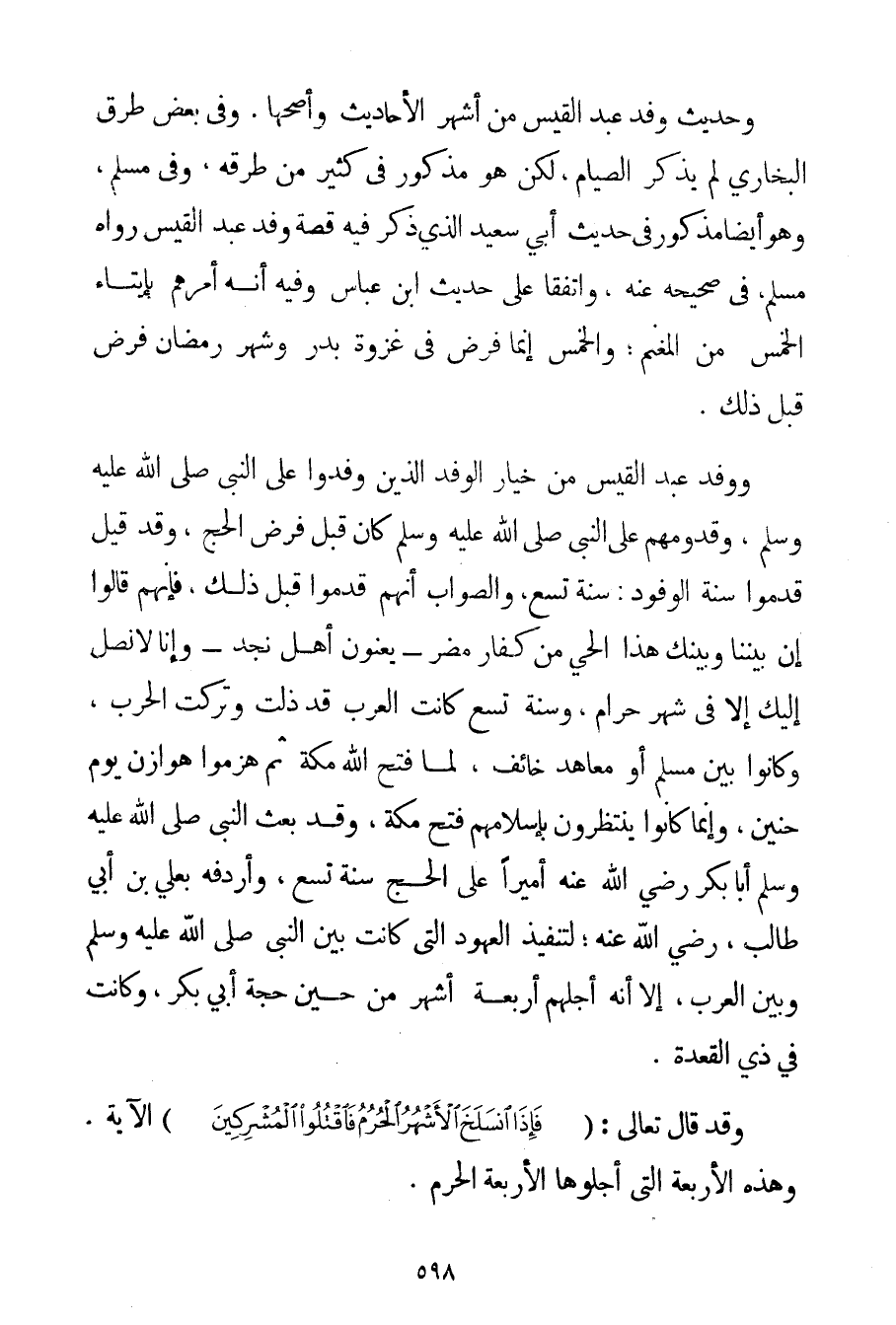 وَحَدِيثُ وَفْدِ عَبْدِ الْقَيْسِ مِنْ أَشْهَرِ الْأَحَادِيثِ وَأَصَحِّهَا. وَفِي بَعْضِ طُرُقِ الْبُخَارِيِّ لَمْ يَذْكُرْ الصِّيَامَ لَكِنْ هُوَ مَذْكُورٌ فِي كَثِيرٍ مِنْ طُرُقِهِ وَفِي مُسْلِمٍ وَهُوَ أَيْضًا مَذْكُورٌ فِي حَدِيثِ أَبِي سَعِيدٍ الَّذِي ذَكَرَ فِيهِ قِصَّةَ وَفْدِ عَبْدِ الْقَيْسِ رَوَاهُ مُسْلِمٌ فِي صَحِيحِهِ عَنْهُ وَاتَّفَقَا عَلَى حَدِيثِ ابْنِ عَبَّاسٍ وَفِيهِ أَنَّهُ أَمَرَهُمْ بِإِيتَاءِ الْخُمُسِ مِنْ الْمَغْنَمِ؛ وَالْخُمُسُ إنَّمَا فُرِضَ فِي غَزْوَةِ بَدْرٍ، وَشَهْرُ رَمَضَانَ فُرِضَ قَبْلَ ذَلِكَ. وَوَفْدُ عَبْدِ الْقَيْسِ مِنْ خِيَارِ الْوَفْدِ الَّذِينَ وَفَدُوا عَلَى النَّبِيِّ صَلَّى اللَّهُ عَلَيْهِ وَسَلَّمَ وَقُدُومُهُمْ عَلَى النَّبِيِّ صَلَّى اللَّهُ عَلَيْهِ وَسَلَّمَ كَانَ قَبْلَ فَرْضِ الْحَجِّ وَقَدْ قِيلَ قَدِمُوا سَنَةَ الْوُفُودِ: سَنَةَ تِسْعٍ وَالصَّوَابُ أَنَّهُمْ قَدِمُوا قَبْلَ ذَلِكَ فَإِنَّهُمْ قَالُوا إنَّ بَيْنَنَا وَبَيْنَك هَذَا الْحَيَّ مِنْ كُفَّارِ مُضَرَ - يَعْنُونَ أَهْلَ نَجْدٍ - وَإِنَّا لَا نَصِلُ إلَيْك إلَّا فِي شَهْرٍ حَرَامٍ وَسَنَةَ تِسْعٍ كَانَتْ الْعَرَبُ قَدْ ذَلَّتْ وَتَرَكَتْ الْحَرْبَ وَكَانُوا بَيْنَ مُسْلِمٍ أَوْ مُعَاهَدٍ خَائِفٍ لَمَّا فَتَحَ اللَّهُ مَكَّةَ ثُمَّ هَزَمُوا هَوَازِنَ يَوْمَ حنين وَإِنَّمَا كَانُوا يَنْتَظِرُونَ بِإِسْلَامِهِمْ فَتْحَ مَكَّةَ وَقَدْ بَعَثَ النَّبِيُّ صَلَّى اللَّهُ عَلَيْهِ وَسَلَّمَ أَبَا بَكْرٍ رَضِيَ اللَّهُ عَنْهُ أَمِيرًا عَلَى الْحَجِّ سَنَةَ تِسْعٍ وَأَرْدَفَهُ بِعَلِيِّ بْنِ أَبِي طَالِبٍ رَضِيَ اللَّهُ عَنْهُ لِتَنْفِيذِ الْعُهُودِ الَّتِي كَانَتْ بَيْنَ النَّبِيِّ صَلَّى اللَّهُ عَلَيْهِ وَسَلَّمَ وَبَيْنَ الْعَرَبِ إلَّا أَنَّهُ أَجَّلَهُمْ أَرْبَعَةَ أَشْهُرٍ مِنْ حِينِ حَجَّةِ أَبِي بَكْرٍ وَكَانَتْ فِي ذِي الْقِعْدَةِ. وَقَدْ قَالَ تَعَالَى: {فَإِذَا انْسَلَخَ الْأَشْهُرُ الْحُرُمُ فَاقْتُلُوا الْمُشْرِكِينَ} الْآيَةَ وَهَذِهِ الْأَرْبَعَةُ الَّتِي أَجَّلُوهَا الْأَرْبَعَةُ الْحُرُمُ.