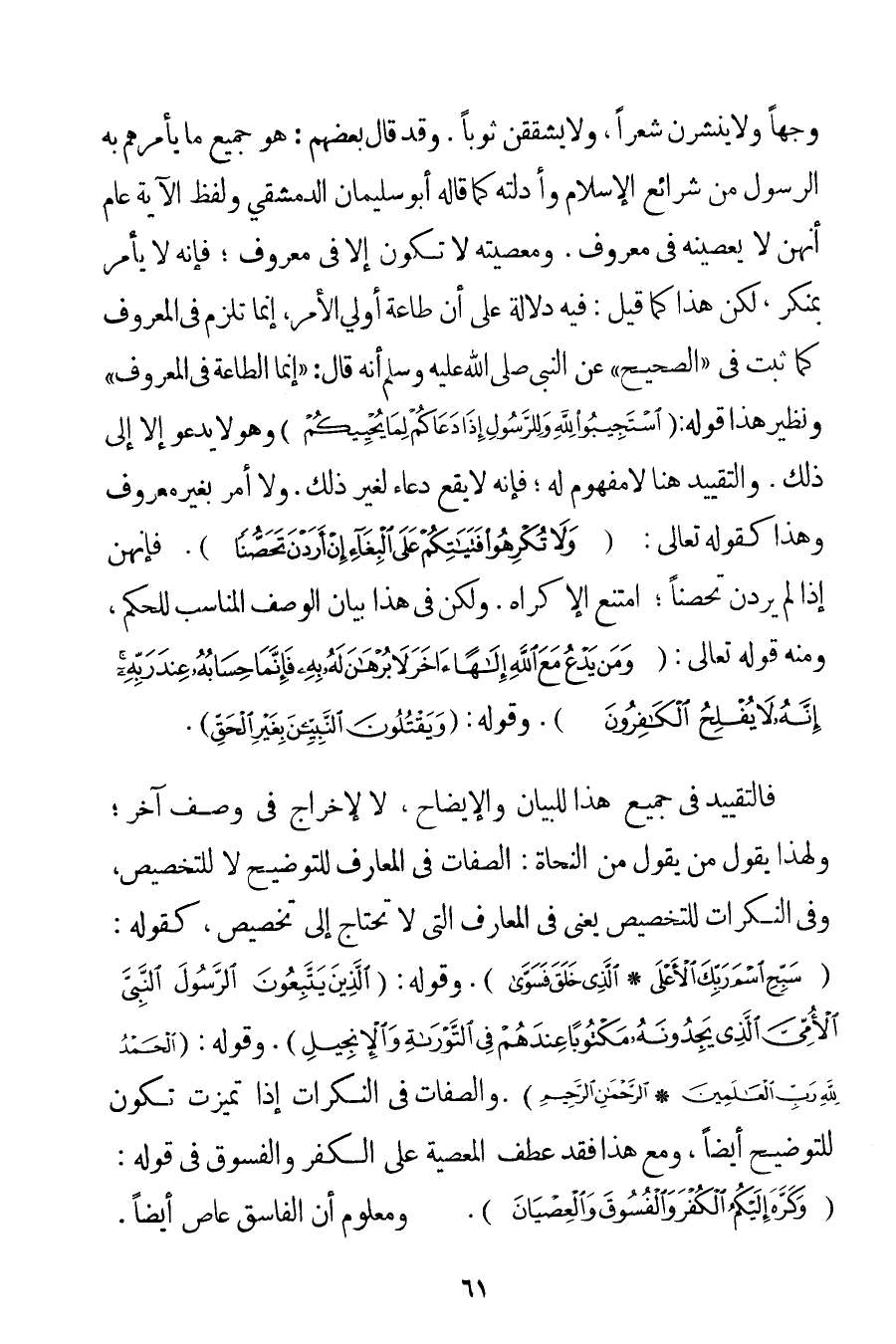 وَجْهًا وَلَا يَنْشُرْنَ شَعْرًا وَلَا يَشْقُقْنَ ثَوْبًا. وَقَدْ قَالَ بَعْضُهُمْ: هُوَ جَمِيعُ مَا يَأْمُرُهُمْ بِهِ الرَّسُولُ مِنْ شَرَائِعِ الْإِسْلَامِ وَأَدِلَّتِهِ كَمَا قَالَهُ أَبُو سُلَيْمَانَ الدِّمَشْقِيُّ، وَلَفْظُ الْآيَةِ عَامٌّ أَنَّهُنَّ لَا يَعْصِينَهُ فِي مَعْرُوفٍ. وَمَعْصِيَتُهُ لَا تَكُونُ إلَّا فِي مَعْرُوفٍ؛ فَإِنَّهُ لَا يَأْمُرُ بِمُنْكَرِ لَكِنْ هَذَا كَمَا قِيلَ: فِيهِ دَلَالَةٌ عَلَى أَنَّ طَاعَةَ أُولِي الْأَمْرِ إنَّمَا تَلْزَمُ فِي الْمَعْرُوفِ كَمَا ثَبَتَ فِي " الصَّحِيحِ " عَنْ النَّبِيِّ صَلَّى اللَّهُ عَلَيْهِ وَسَلَّمَ أَنَّهُ قَالَ: {إنَّمَا الطَّاعَةُ فِي الْمَعْرُوفِ} وَنَظِيرُ هَذَا قَوْلُهُ: {اسْتَجِيبُوا لِلَّهِ وَلِلرَّسُولِ إذَا دَعَاكُمْ لِمَا يُحْيِيكُمْ} وَهُوَ لَا يَدْعُو إلَّا إلَى ذَلِكَ. وَالتَّقْيِيدُ هُنَا لَا مَفْهُومَ لَهُ؛ فَإِنَّهُ لَا يَقَعُ دُعَاءٌ لِغَيْرِ ذَلِكَ. وَلَا أَمْرٌ بِغَيْرِ مَعْرُوفٍ وَهَذَا كَقَوْلِهِ تَعَالَى: {وَلَا تُكْرِهُوا فَتَيَاتِكُمْ عَلَى الْبِغَاءِ إنْ أَرَدْنَ تَحَصُّنًا} . فَإِنَّهُنَّ إذَا لَمْ يُرِدْنَ تَحَصُّنًا؛ امْتَنَعَ الْإِكْرَاهُ. وَلَكِنْ فِي هَذَا بَيَانُ الْوَصْفِ الْمُنَاسِبِ لِلْحُكْمِ وَمِنْهُ قَوْله تَعَالَى {وَمَنْ يَدْعُ مَعَ اللَّهِ إلَهًا آخَرَ لَا بُرْهَانَ لَهُ بِهِ فَإِنَّمَا حِسَابُهُ عِنْدَ رَبِّهِ إنَّهُ لَا يُفْلِحُ الْكَافِرُونَ} . وَقَوْلُهُ: {وَيَقْتُلُونَ النَّبِيِّينَ بِغَيْرِ الْحَقِّ} . فَالتَّقْيِيدُ فِي جَمِيعِ هَذَا لِلْبَيَانِ وَالْإِيضَاحِ لَا لِإِخْرَاجِ فِي وَصْفٍ آخَرَ؛ وَلِهَذَا يَقُولُ مَنْ يَقُولُ مِنْ النُّحَاةِ: الصِّفَاتُ فِي الْمَعَارِفِ لِلتَّوْضِيحِ لَا لِلتَّخْصِيصِ وَفِي النَّكِرَاتِ لِلتَّخْصِيصِ يَعْنِي فِي الْمَعَارِفِ الَّتِي لَا تَحْتَاجُ إلَى تَخْصِيصٍ كَقَوْلِهِ: {سَبِّحِ اسْمَ رَبِّكَ الْأَعْلَى} {الَّذِي خَلَقَ فَسَوَّى} . وَقَوْلِهِ: {الَّذِينَ يَتَّبِعُونَ الرَّسُولَ النَّبِيَّ الْأُمِّيَّ الَّذِي يَجِدُونَهُ مَكْتُوبًا عِنْدَهُمْ فِي التَّوْرَاةِ وَالْإِنْجِيلِ} . وَقَوْلِهِ: {الْحَمْدُ لِلَّهِ رَبِّ الْعَالَمِينَ} {الرَّحْمَنِ الرَّحِيمِ} . وَالصِّفَاتُ فِي النَّكِرَاتِ إذَا تَمَيَّزَتْ تَكُونُ لِلتَّوْضِيحِ أَيْضًا وَمَعَ هَذَا فَقَدْ عَطَفَ الْمَعْصِيَةَ عَلَى الْكُفْرِ وَالْفُسُوقِ فِي قَوْلِهِ: {وَكَرَّهَ إلَيْكُمُ الْكُفْرَ وَالْفُسُوقَ وَالْعِصْيَانَ} . وَمَعْلُومٌ أَنَّ الْفَاسِقَ عَاصٍ أَيْضًا.