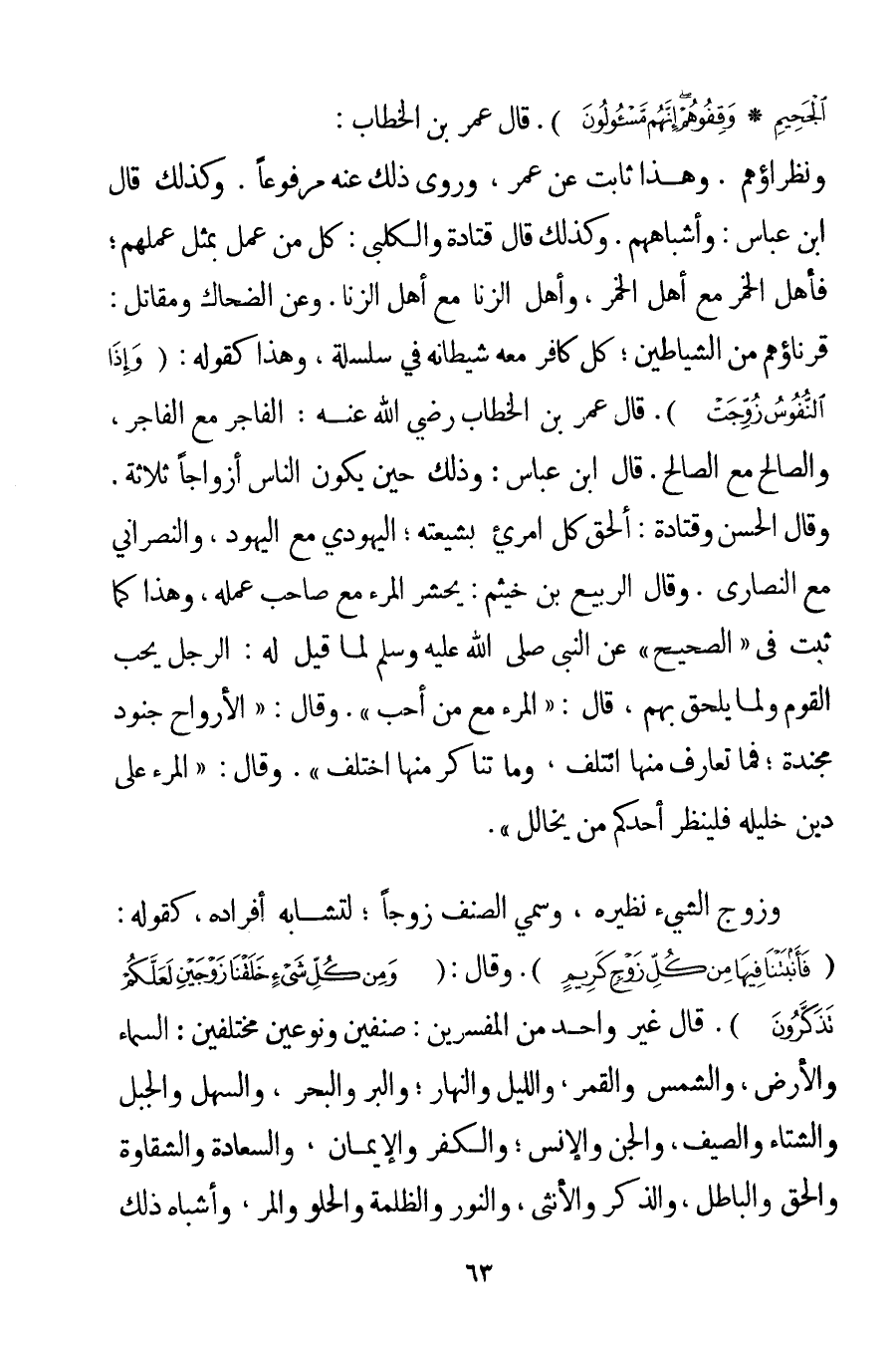 فَاهْدُوهُمْ إلَى صِرَاطِ الْجَحِيمِ} {وَقِفُوهُمْ إنَّهُمْ مَسْئُولُونَ} . قَالَ عُمَرُ بْنُ الْخَطَّابِ: وَنُظَرَاؤُهُمْ. وَهَذَا ثَابِتٌ عَنْ عُمَرَ وَرُوِيَ ذَلِكَ عَنْهُ مَرْفُوعًا. وَكَذَلِكَ قَالَ ابْنُ عَبَّاسٍ: وَأَشْبَاهُهُمْ. وَكَذَلِكَ قَالَ قتادة وَالْكَلْبِيُّ: كُلُّ مَنْ عَمِلَ بِمِثْلِ عَمَلِهِمْ؛ فَأَهْلُ الْخَمْرِ مَعَ أَهْلِ الْخَمْرِ وَأَهْلُ الزِّنَا مَعَ أَهْلِ الزِّنَا. وَعَنْ الضَّحَّاكِ وَمُقَاتِلٍ: قُرَنَاؤُهُمْ مِنْ الشَّيَاطِينِ؛ كُلُّ كَافِرٍ مَعَهُ شَيْطَانُهُ فِي سِلْسِلَةٍ وَهَذَا كَقَوْلِهِ: {وَإِذَا النُّفُوسُ زُوِّجَتْ} . قَالَ عُمَرُ بْنُ الْخَطَّابِ رَضِيَ اللَّهُ عَنْهُ الْفَاجِرُ مَعَ الْفَاجِرِ وَالصَّالِحُ مَعَ الصَّالِحِ. قَالَ ابْنُ عَبَّاسٍ: وَذَلِكَ حِين يَكُونُ النَّاسُ أَزْوَاجًا ثَلَاثَةً. وَقَالَ الْحَسَنُ وقتادة: أُلْحِقَ كُلُّ امْرِئٍ بِشِيعَتِهِ؛ الْيَهُودِيُّ مَعَ الْيَهُودِ وَالنَّصْرَانِيُّ مَعَ النَّصَارَى. وَقَالَ الرَّبِيعُ بْنُ خُثَيْم: يُحْشَرُ الْمَرْءُ مَعَ صَاحِبِ عَمَلِهِ وَهَذَا كَمَا ثَبَتَ فِي " الصَّحِيحِ " {عَنْ النَّبِيِّ صَلَّى اللَّهُ عَلَيْهِ وَسَلَّمَ لَمَّا قِيلَ لَهُ: الرَّجُلُ يُحِبُّ الْقَوْمَ وَلَمَّا يَلْحَقْ بِهِمْ قَالَ: الْمَرْءُ مَعَ مَنْ أَحَبَّ} . وَقَالَ: {الْأَرْوَاحُ جُنُودٌ مُجَنَّدَةٌ؛ فَمَا تَعَارَفَ مِنْهَا ائْتَلَفَ وَمَا تَنَاكَرَ مِنْهَا اخْتَلَفَ} . وَقَالَ: {الْمَرْءُ عَلَى دِينِ خَلِيلِهِ فَلْيَنْظُرْ أَحَدُكُمْ مَنْ يُخَالِلْ} . وَزَوْجُ الشَّيْءِ نَظِيرُهُ وَسُمِّيَ الصِّنْفُ زَوْجًا؛ لِتَشَابُهِ أَفْرَادِهِ كَقَوْلِهِ: {أَنْبَتْنَا فِيهَا مِنْ كُلِّ زَوْجٍ كَرِيمٍ} . وَقَالَ: {وَمِنْ كُلِّ شَيْءٍ خَلَقْنَا زَوْجَيْنِ لَعَلَّكُمْ تَذَكَّرُونَ} . قَالَ غَيْرُ وَاحِدٍ مِنْ الْمُفَسِّرِينَ: صِنْفَيْنِ وَنَوْعَيْنِ مُخْتَلِفَيْنِ: السَّمَاءُ وَالْأَرْضُ وَالشَّمْسُ وَالْقَمَرُ وَاللَّيْلُ وَالنَّهَارُ؛ وَالْبَرُّ وَالْبَحْرُ وَالسَّهْلُ وَالْجَبَلُ وَالشِّتَاءُ وَالصَّيْفُ وَالْجِنُّ وَالْإِنْسُ؛ وَالْكُفْرُ وَالْإِيمَانُ وَالسَّعَادَةُ وَالشَّقَاوَةُ وَالْحَقُّ وَالْبَاطِلُ وَالذَّكَرُ وَالْأُنْثَى وَالنُّورُ وَالظُّلْمَةُ وَالْحُلْوُ وَالْمُرُّ وَأَشْبَاهُ ذَلِكَ
