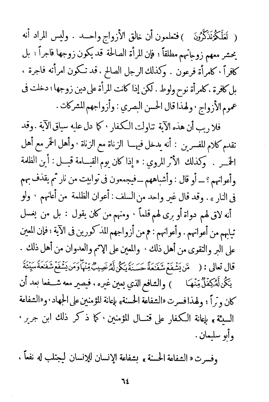 {لَعَلَّكُمْ تَذَكَّرُونَ} فَتَعْلَمُونَ أَنَّ خَالِقَ الْأَزْوَاجِ وَاحِدٌ. وَلَيْسَ الْمُرَادُ أَنَّهُ يَحْشُرُ مَعَهُمْ زَوْجَاتِهِمْ مُطْلَقًا؛ فَإِنَّ الْمَرْأَةَ الصَّالِحَةَ قَدْ يَكُونُ زَوْجُهَا فَاجِرًا؛ بَلْ كَافِرًا كَامْرَأَةِ فِرْعَوْنَ. وَكَذَلِكَ الرَّجُلُ الصَّالِحُ قَدْ تَكُونُ امْرَأَتُهُ فَاجِرَةً بَلْ كَافِرَةً كَامْرَأَةِ نُوحٍ وَلُوطٍ. لَكِنْ إذَا كَانَتْ الْمَرْأَةُ عَلَى دِينِ زَوْجِهَا؛ دَخَلَتْ فِي عُمُومِ الْأَزْوَاجِ وَلِهَذَا قَالَ الْحَسَنُ الْبَصْرِيُّ: وَأَزْوَاجُهُمْ الْمُشْرِكَاتُ. فَلَا رَيْبَ أَنَّ هَذِهِ الْآيَةَ تَنَاوَلَتْ الْكُفَّارَ كَمَا دَلَّ عَلَيْهِ سِيَاقُ الْآيَةِ. وَقَدْ تَقَدَّمَ كَلَامُ الْمُفَسِّرِينَ: أَنَّهُ يَدْخُلُ فِيهَا الزُّنَاةُ مَعَ الزُّنَاةِ، وَأَهْلُ الْخَمْرِ مَعَ أَهْلِ الْخَمْرِ. وَكَذَلِكَ الْأَثَرُ الْمَرْوِيُّ: {إذَا كَانَ يَوْمُ الْقِيَامَةِ قِيلَ: أَيْنَ الظَّلَمَةُ وَأَعْوَانُهُمْ؟ - أَوْ قَالَ: وَأَشْبَاهُهُمْ - فَيُجْمَعُونَ فِي تَوَابِيتَ مِنْ نَارٍ ثُمَّ يُقْذَفُ بِهِمْ فِي النَّارِ} . وَقَدْ قَالَ غَيْرُ وَاحِدٍ مِنْ السَّلَفِ: أَعْوَانُ الظَّلَمَةِ مَنْ أَعَانَهُمْ وَلَوْ أَنَّهُ لَاقَ لَهُمْ دَوَاةً أَوْ بَرَى لَهُمْ قَلَمًا وَمِنْهُمْ مَنْ كَانَ يَقُولُ: بَلْ مَنْ يَغْسِلُ ثِيَابَهُمْ مِنْ أَعْوَانِهِمْ. وَأَعْوَانُهُمْ: هُمْ مِنْ أَزْوَاجِهِمْ الْمَذْكُورِينَ فِي الْآيَةِ. فَإِنَّ الْمُعِينَ عَلَى الْبِرِّ وَالتَّقْوَى مِنْ أَهْلِ ذَلِكَ، وَالْمُعِينَ عَلَى الْإِثْمِ وَالْعُدْوَانِ مِنْ أَهْلِ ذَلِكَ. قَالَ تَعَالَى: {مَنْ يَشْفَعْ شَفَاعَةً حَسَنَةً يَكُنْ لَهُ نَصِيبٌ مِنْهَا وَمَنْ يَشْفَعْ شَفَاعَةً سَيِّئَةً يَكُنْ لَهُ كِفْلٌ مِنْهَا} وَالشَّافِعُ الَّذِي يُعِينُ غَيْرَهُ فَيَصِيرُ مَعَهُ شَفْعًا بَعْدَ أَنْ كَانَ وِتْرًا؛ وَلِهَذَا فُسِّرَتْ " الشَّفَاعَةُ الْحَسَنَةُ " بِإِعَانَةِ الْمُؤْمِنِينَ عَلَى الْجِهَادِ وَ " الشَّفَاعَةُ السَّيِّئَةُ " بِإِعَانَةِ الْكُفَّارِ عَلَى قِتَالِ الْمُؤْمِنِينَ كَمَا ذَكَرَ ذَلِكَ ابْنُ جَرِيرٍ وَأَبُو سُلَيْمَانَ. وَفُسِّرَتْ " الشَّفَاعَةُ الْحَسَنَةُ " بِشَفَاعَةِ الْإِنْسَانِ لِلْإِنْسَانِ لِيَجْتَلِبَ لَهُ نَفْعًا