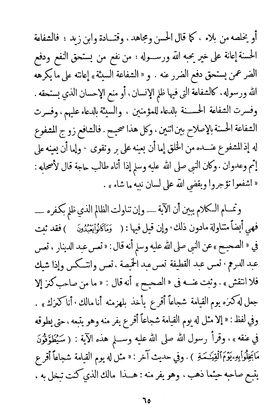 أَوْ يُخَلِّصَهُ مِنْ بَلَاءٍ كَمَا قَالَ الْحَسَنُ وَمُجَاهِدٌ وقتادة وَابْنُ زَيْدٍ؛ فَالشَّفَاعَةُ الْحَسَنَةُ إعَانَةٌ عَلَى خَيْرٍ يُحِبُّهُ اللَّهُ وَرَسُولُهُ؛ مِنْ نَفْعِ مَنْ يَسْتَحِقُّ النَّفْعَ وَدَفْعِ الضُّرِّ عَمَّنْ يَسْتَحِقُّ دَفْعَ الضَّرَرِ عَنْهُ. وَ " الشَّفَاعَةُ السَّيِّئَةُ " إعَانَتُهُ عَلَى مَا يَكْرَهُهُ اللَّهُ وَرَسُولُهُ كَالشَّفَاعَةِ الَّتِي فِيهَا ظُلْمُ الْإِنْسَانِ أَوْ مَنْعُ الْإِحْسَانِ الَّذِي يَسْتَحِقُّهُ. وَفُسِّرَتْ الشَّفَاعَةُ الْحَسَنَةُ بِالدُّعَاءِ لِلْمُؤْمِنِينَ وَالسَّيِّئَةُ بِالدُّعَاءِ عَلَيْهِمْ، وَفُسِّرَتْ الشَّفَاعَةُ الْحَسَنَةُ بِالْإِصْلَاحِ بَيْنَ اثْنَيْنِ وَكُلُّ هَذَا صَحِيحٌ. فَالشَّافِعُ زَوْجُ الْمَشْفُوعِ لَهُ إذْ الْمَشْفُوعُ عِنْدَهُ مِنْ الْخُلُقِ إمَّا أَنْ يُعِينَهُ عَلَى بِرٍّ وَتَقْوَى وَإِمَّا أَنْ يُعِينَهُ عَلَى إثْمٍ وَعُدْوَانٍ. وَكَانَ {النَّبِيُّ صَلَّى اللَّهُ عَلَيْهِ وَسَلَّمَ إذَا أَتَاهُ طَالِبُ حَاجَةٍ قَالَ لِأَصْحَابِهِ: اشْفَعُوا تُؤْجَرُوا وَيَقْضِي اللَّهُ عَلَى لِسَانِ نَبِيِّهِ مَا شَاءَ} . وَتَمَامُ الْكَلَامِ يُبَيِّنُ أَنَّ الْآيَةَ - وَإِنْ تَنَاوَلَتْ الظَّالِمَ الَّذِي ظَلَمَ بِكُفْرِهِ - فَهِيَ أَيْضًا مُتَنَاوِلَةٌ مَا دُونَ ذَلِكَ وَإِنْ قِيلَ فِيهَا: {وَمَا كَانُوا يَعْبُدُونَ} فَقَدْ ثَبَتَ فِي " الصَّحِيحِ " عَنْ النَّبِيِّ صَلَّى اللَّهُ عَلَيْهِ وَسَلَّمَ أَنَّهُ قَالَ: {تَعِسَ عَبْدُ الدِّينَارِ تَعِسَ عَبْدُ الدِّرْهَمِ تَعِسَ عَبْدُ الْقَطِيفَةِ تَعِسَ عَبْدُ الْخَمِيصَةِ تَعِسَ وَانْتَكَسَ وَإِذَا شِيكَ فَلَا انْتَقَشَ} . وَثَبَتَ عَنْهُ فِي " الصَّحِيحِ " أَنَّهُ قَالَ: {مَا مِنْ صَاحِبِ كَنْزٍ إلَّا جُعِلَ لَهُ كَنْزُهُ يَوْمَ الْقِيَامَةِ شُجَاعًا أَقْرَعَ يَأْخُذُ بِلِهْزِمَتِهِ أَنَا مَالُك أَنَا كَنْزُك. وَفِي لَفْظٍ: إلَّا مُثِّلَ لَهُ يَوْمَ الْقِيَامَةِ شُجَاعًا أَقْرَعَ يَفِرُّ مِنْهُ وَهُوَ يَتْبَعُهُ حَتَّى يُطَوِّقَهُ فِي عُنُقِهِ وَقَرَأَ رَسُولُ اللَّهِ صَلَّى اللَّهُ عَلَيْهِ وَسَلَّمَ هَذِهِ الْآيَةَ: {سَيُطَوَّقُونَ مَا بَخِلُوا بِهِ يَوْمَ الْقِيَامَةِ} } . وَفِي حَدِيثٍ آخَرَ: {مُثِّلَ لَهُ يَوْمَ الْقِيَامَةِ شُجَاعًا أَقْرَعَ يَتْبَعُ صَاحِبَهُ حَيْثُمَا ذَهَبَ وَهُوَ يَفِرُّ مِنْهُ: هَذَا مَالُك الَّذِي كُنْت تَبْخَلُ بِهِ