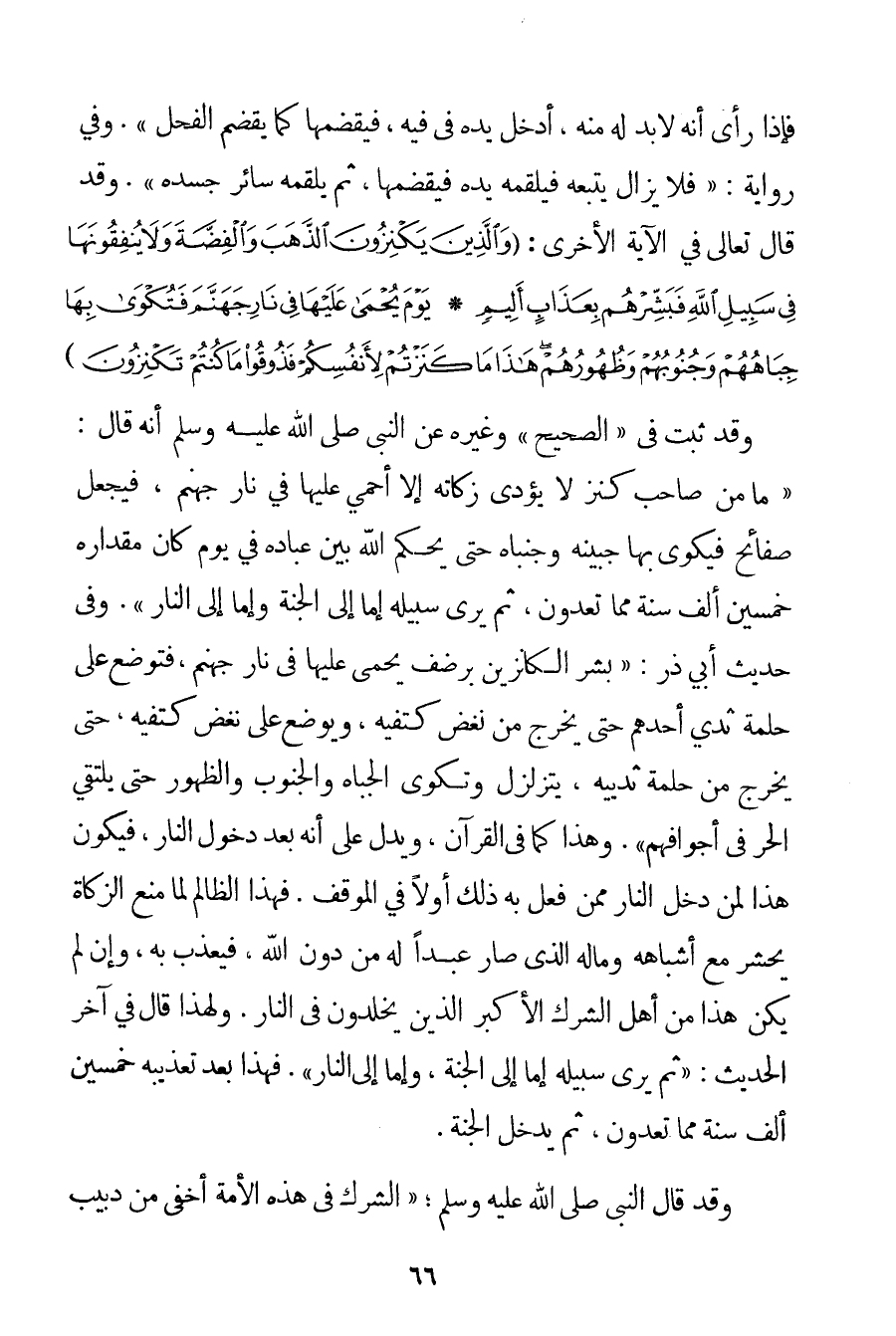 فَإِذَا رَأَى أَنَّهُ لَا بُدَّ لَهُ مِنْهُ أَدْخَلَ يَدَهُ فِي فِيهِ فَيَقْضِمُهَا كَمَا يَقْضِمُ الْفَحْلُ} . وَفِي رِوَايَةٍ: {فَلَا يَزَالُ يَتْبَعُهُ فَيُلْقِمُهُ يَدَهُ فَيَقْضِمُهَا ثُمَّ يُلْقِمُهُ سَائِرَ جَسَدِهِ} . وَقَدْ قَالَ تَعَالَى فِي الْآيَةِ الْأُخْرَى: {وَالَّذِينَ يَكْنِزُونَ الذَّهَبَ وَالْفِضَّةَ وَلَا يُنْفِقُونَهَا فِي سَبِيلِ اللَّهِ فَبَشِّرْهُمْ بِعَذَابٍ أَلِيمٍ} {يَوْمَ يُحْمَى عَلَيْهَا فِي نَارِ جَهَنَّمَ فَتُكْوَى بِهَا جِبَاهُهُمْ وَجُنُوبُهُمْ وَظُهُورُهُمْ هَذَا مَا كَنَزْتُمْ لِأَنْفُسِكُمْ فَذُوقُوا مَا كُنْتُمْ تَكْنِزُونَ} وَقَدْ ثَبَتَ فِي " الصَّحِيحِ " وَغَيْرِهِ عَنْ النَّبِيِّ صَلَّى اللَّهُ عَلَيْهِ وَسَلَّمَ أَنَّهُ قَالَ: {مَا مِنْ صَاحِبِ كَنْزٍ لَا يُؤَدِّي زَكَاتَهُ إلَّا أُحْمِيَ عَلَيْهَا فِي نَارِ جَهَنَّمَ فَيُجْعَلُ صَفَائِحَ فَيُكْوَى بِهَا جَبِينُهُ وَجَنْبَاهُ حَتَّى يَحْكُمَ اللَّهُ بَيْنَ عِبَادِهِ فِي يَوْمٍ كَانَ مِقْدَارُهُ خَمْسِينَ أَلْفَ سَنَةٍ مِمَّا تَعُدُّونَ ثُمَّ يَرَى سَبِيلَهُ إمَّا إلَى الْجَنَّةِ وَإِمَّا إلَى النَّارِ} . وَفِي حَدِيثِ أَبِي ذَرٍّ: {بَشِّرْ الْكَانِزِينَ بِرَضْفِ يُحْمَى عَلَيْهَا فِي نَارِ جَهَنَّمَ فَتُوضَعُ عَلَى حَلَمَةِ ثَدْيِ أَحَدِهِمْ حَتَّى يَخْرُجَ مَنْ نُغْضِ كَتِفَيْهِ، وَيُوضَعُ عَلَى نُغْضِ كَتِفَيْهِ حَتَّى يَخْرُجَ مِنْ حَلَمَةِ ثَدْيَيْهِ يَتَزَلْزَلُ وَتَكْوِي الْجِبَاهَ وَالْجُنُوبَ وَالظُّهُورَ حَتَّى يَلْتَقِيَ الْحَرُّ فِي أَجْوَافِهِمْ} . وَهَذَا كَمَا فِي الْقُرْآنِ وَيَدُلُّ عَلَى أَنَّهُ بَعْدَ دُخُولِ النَّارِ فَيَكُونُ هَذَا لِمَنْ دَخَلَ النَّارَ مِمَّنْ فُعِلَ بِهِ ذَلِكَ أَوَّلًا فِي الْمَوْقِفِ. فَهَذَا الظَّالِمُ لَمَّا مَنَعَ الزَّكَاةَ يُحْشَرُ مَعَ أَشْبَاهِهِ وَمَالِهِ الَّذِي صَارَ عَبْدًا لَهُ مِنْ دُونِ اللَّهِ فَيُعَذَّبُ بِهِ وَإِنْ لَمْ يَكُنْ هَذَا مِنْ أَهْلِ الشِّرْكِ الْأَكْبَرِ الَّذِينَ يُخَلَّدُونَ فِي النَّارِ. وَلِهَذَا قَالَ فِي آخِرِ الْحَدِيثِ: {ثُمَّ يَرَى سَبِيلَهُ إمَّا إلَى الْجَنَّةِ وَإِمَّا إلَى النَّارِ} . فَهَذَا بَعْدَ تَعْذِيبِهِ خَمْسِينَ أَلْفَ سَنَةٍ مِمَّا تَعُدُّونَ ثُمَّ يَدْخُلُ الْجَنَّةَ. وَقَدْ {قَالَ النَّبِيُّ صَلَّى اللَّهُ عَلَيْهِ وَسَلَّمَ الشِّرْكُ فِي هَذِهِ الْأُمَّةِ أَخْفَى مِنْ دَبِيبِ
