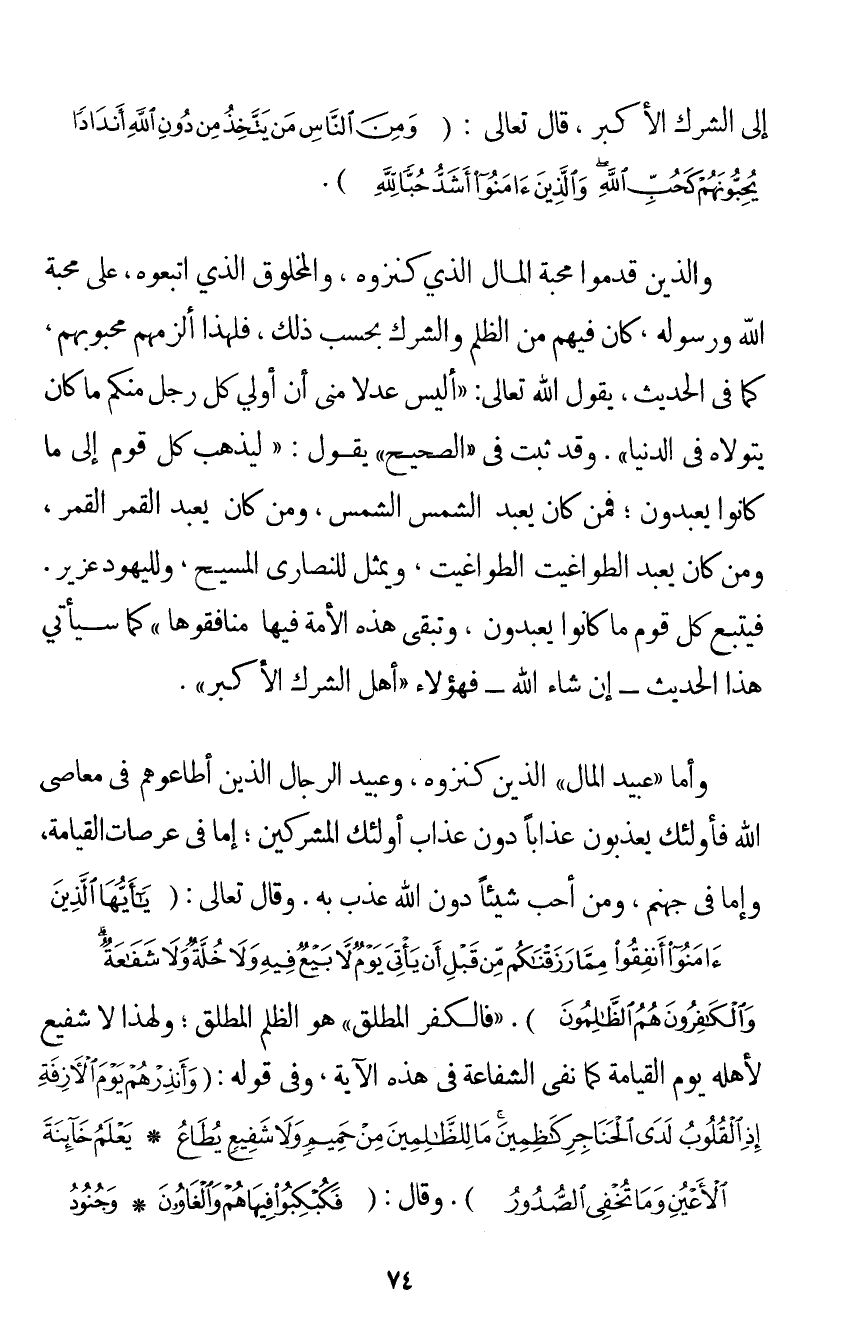 إلَى الشِّرْكِ الْأَكْبَرِ قَالَ تَعَالَى: {وَمِنَ النَّاسِ مَنْ يَتَّخِذُ مِنْ دُونِ اللَّهِ أَنْدَادًا يُحِبُّونَهُمْ كَحُبِّ اللَّهِ وَالَّذِينَ آمَنُوا أَشَدُّ حُبًّا لِلَّهِ} . وَاَلَّذِينَ قَدَّمُوا مَحَبَّةَ الْمَالِ الَّذِي كَنَزُوهُ وَالْمَخْلُوقَ الَّذِي اتَّبَعُوهُ عَلَى مَحَبَّةِ اللَّهِ وَرَسُولِهِ كَانَ فِيهِمْ مِنْ الظُّلْمِ وَالشِّرْكِ بِحَسَبِ ذَلِكَ فَلِهَذَا أَلْزَمَهُمْ مَحْبُوبَهُمْ كَمَا فِي الْحَدِيثِ يَقُولُ اللَّهُ تَعَالَى: {أَلَيْسَ عَدْلًا مِنِّي أَنْ أُوَلِّيَ كُلَّ رَجُلٍ مِنْكُمْ مَا كَانَ يَتَوَلَّاهُ فِي الدُّنْيَا} . وَقَدْ ثَبَتَ فِي " الصَّحِيحِ " يَقُولُ: {لِيَذْهَبْ كُلُّ قَوْمٍ إلَى مَا كَانُوا يَعْبُدُونَ؛ فَمَنْ كَانَ يَعْبُدُ الشَّمْسَ الشَّمْسَ وَمَنْ كَانَ يَعْبُدُ الْقَمَرَ الْقَمَرَ وَمَنْ كَانَ يَعْبُدُ الطَّوَاغِيتَ الطَّوَاغِيتَ وَيُمَثَّلُ لِلنَّصَارَى الْمَسِيحُ وَلِلْيَهُودِ عُزَيْرٌ. فَيَتَّبِعُ كُلُّ قَوْمٍ مَا كَانُوا يَعْبُدُونَ وَتَبْقَى هَذِهِ الْأُمَّةُ فِيهَا مُنَافِقُوهَا} كَمَا سَيَأْتِي هَذَا الْحَدِيثُ - إنْ شَاءَ اللَّهُ - فَهَؤُلَاءِ " أَهْلُ الشِّرْكِ الْأَكْبَرِ ". وَأَمَّا " عَبِيدُ الْمَالِ " الَّذِينَ كَنَزُوهُ وَعَبِيدُ الرِّجَالِ الَّذِينَ أَطَاعُوهُمْ فِي مَعَاصِي اللَّهِ فَأُولَئِكَ يُعَذَّبُونَ عَذَابًا دُونَ عَذَابِ أُولَئِكَ الْمُشْرِكِينَ؛ إمَّا فِي عَرَصَاتِ الْقِيَامَةِ وَإِمَّا فِي جَهَنَّمَ وَمَنْ أَحَبَّ شَيْئًا دُونَ اللَّهِ عُذِّبَ بِهِ. وَقَالَ تَعَالَى: {يَا أَيُّهَا الَّذِينَ آمَنُوا أَنْفِقُوا مِمَّا رَزَقْنَاكُمْ مِنْ قَبْلِ أَنْ يَأْتِيَ يَوْمٌ لَا بَيْعٌ فِيهِ وَلَا خُلَّةٌ وَلَا شَفَاعَةٌ وَالْكَافِرُونَ هُمُ الظَّالِمُونَ} . " فَالْكُفْرُ الْمُطْلَقُ " هُوَ الظُّلْمُ الْمُطْلَقُ؛ وَلِهَذَا لَا شَفِيعَ لِأَهْلِهِ يَوْمَ الْقِيَامَةِ كَمَا نَفَى الشَّفَاعَةَ فِي هَذِهِ الْآيَةِ وَفِي قَوْلِهِ: {وَأَنْذِرْهُمْ يَوْمَ الْآزِفَةِ إذِ الْقُلُوبُ لَدَى الْحَنَاجِرِ كَاظِمِينَ مَا لِلظَّالِمِينَ مِنْ حَمِيمٍ وَلَا شَفِيعٍ يُطَاعُ} {يَعْلَمُ خَائِنَةَ الْأَعْيُنِ وَمَا تُخْفِي الصُّدُورُ} . وَقَالَ: {فَكُبْكِبُوا فِيهَا هُمْ وَالْغَاوُونَ} {وَجُنُودُ