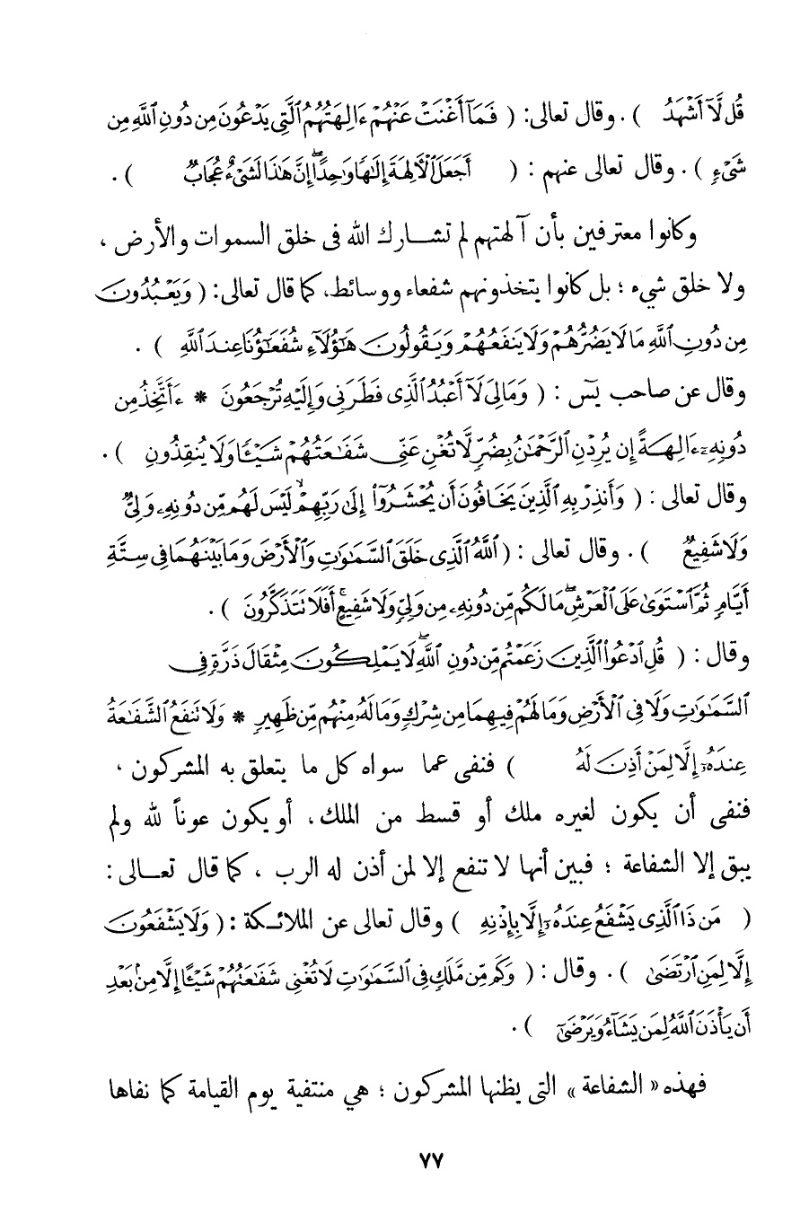 قُلْ لَا أَشْهَدُ} . وَقَالَ تَعَالَى: {فَمَا أَغْنَتْ عَنْهُمْ آلِهَتُهُمُ الَّتِي يَدْعُونَ مِنْ دُونِ اللَّهِ مِنْ شَيْءٍ} . وَقَالَ تَعَالَى عَنْهُمْ: {أَجَعَلَ الْآلِهَةَ إلَهًا وَاحِدًا إنَّ هَذَا لَشَيْءٌ عُجَابٌ} . وَكَانُوا مُعْتَرِفِينَ بِأَنَّ آلِهَتَهُمْ لَمْ تُشَارِكْ اللَّهَ فِي خَلْقِ السَّمَوَاتِ وَالْأَرْضِ وَلَا خَلْقِ شَيْءٍ؛ بَلْ كَانُوا يَتَّخِذُونَهُمْ شُفَعَاءَ وَوَسَائِطَ كَمَا قَالَ تَعَالَى: {وَيَعْبُدُونَ مِنْ دُونِ اللَّهِ مَا لَا يَضُرُّهُمْ وَلَا يَنْفَعُهُمْ وَيَقُولُونَ هَؤُلَاءِ شُفَعَاؤُنَا عِنْدَ اللَّهِ} . وَقَالَ عَنْ صَاحِبِ يس: {وَمَا لِيَ لَا أَعْبُدُ الَّذِي فَطَرَنِي وَإِلَيْهِ تُرْجَعُونَ} {أَأَتَّخِذُ مِنْ دُونِهِ آلِهَةً إنْ يُرِدْنِ الرَّحْمَنُ بِضُرٍّ لَا تُغْنِ عَنِّي شَفَاعَتُهُمْ شَيْئًا وَلَا يُنْقِذُونِ} . وَقَالَ تَعَالَى: {وَأَنْذِرْ بِهِ الَّذِينَ يَخَافُونَ أَنْ يُحْشَرُوا إلَى رَبِّهِمْ لَيْسَ لَهُمْ مِنْ دُونِهِ وَلِيٌّ وَلَا شَفِيعٌ} . وَقَالَ تَعَالَى: {اللَّهُ الَّذِي خَلَقَ السَّمَاوَاتِ وَالْأَرْضَ وَمَا بَيْنَهُمَا فِي سِتَّةِ أَيَّامٍ ثُمَّ اسْتَوَى عَلَى الْعَرْشِ مَا لَكُمْ مِنْ دُونِهِ مِنْ وَلِيٍّ وَلَا شَفِيعٍ أَفَلَا تَتَذَكَّرُونَ} . وَقَالَ: {قُلِ ادْعُوا الَّذِينَ زَعَمْتُمْ مِنْ دُونِ اللَّهِ لَا يَمْلِكُونَ مِثْقَالَ ذَرَّةٍ فِي السَّمَاوَاتِ وَلَا فِي الْأَرْضِ وَمَا لَهُمْ فِيهِمَا مِنْ شِرْكٍ وَمَا لَهُ مِنْهُمْ مِنْ ظَهِيرٍ} {وَلَا تَنْفَعُ الشَّفَاعَةُ عِنْدَهُ إلَّا لِمَنْ أَذِنَ لَهُ} فَنَفَى عَمَّا سِوَاهُ كُلَّ مَا يَتَعَلَّقُ بِهِ الْمُشْرِكُونَ فَنَفَى أَنْ يَكُونَ لِغَيْرِهِ مُلْكٌ أَوْ قِسْطٌ مِنْ الْمُلْكِ أَوْ يَكُونَ عَوْنًا لِلَّهِ وَلَمْ يَبْقَ إلَّا الشَّفَاعَةُ؛ فَبَيَّنَ أَنَّهَا لَا تَنْفَعُ إلَّا لِمَنْ أَذِنَ لَهُ الرَّبُّ كَمَا قَالَ تَعَالَى: {مَنْ ذَا الَّذِي يَشْفَعُ عِنْدَهُ إلَّا بِإِذْنِهِ} وَقَالَ تَعَالَى عَنْ الْمَلَائِكَةِ: {وَلَا يَشْفَعُونَ إلَّا لِمَنِ ارْتَضَى} . وَقَالَ: {وَكَمْ مِنْ مَلَكٍ فِي السَّمَاوَاتِ لَا تُغْنِي شَفَاعَتُهُمْ شَيْئًا إلَّا مِنْ بَعْدِ أَنْ يَأْذَنَ اللَّهُ لِمَنْ يَشَاءُ وَيَرْضَى} . فَهَذِهِ " الشَّفَاعَةُ " الَّتِي يَظُنُّهَا الْمُشْرِكُونَ؛ هِيَ مُنْتَفِيَةٌ يَوْمَ الْقِيَامَةِ كَمَا نَفَاهَا