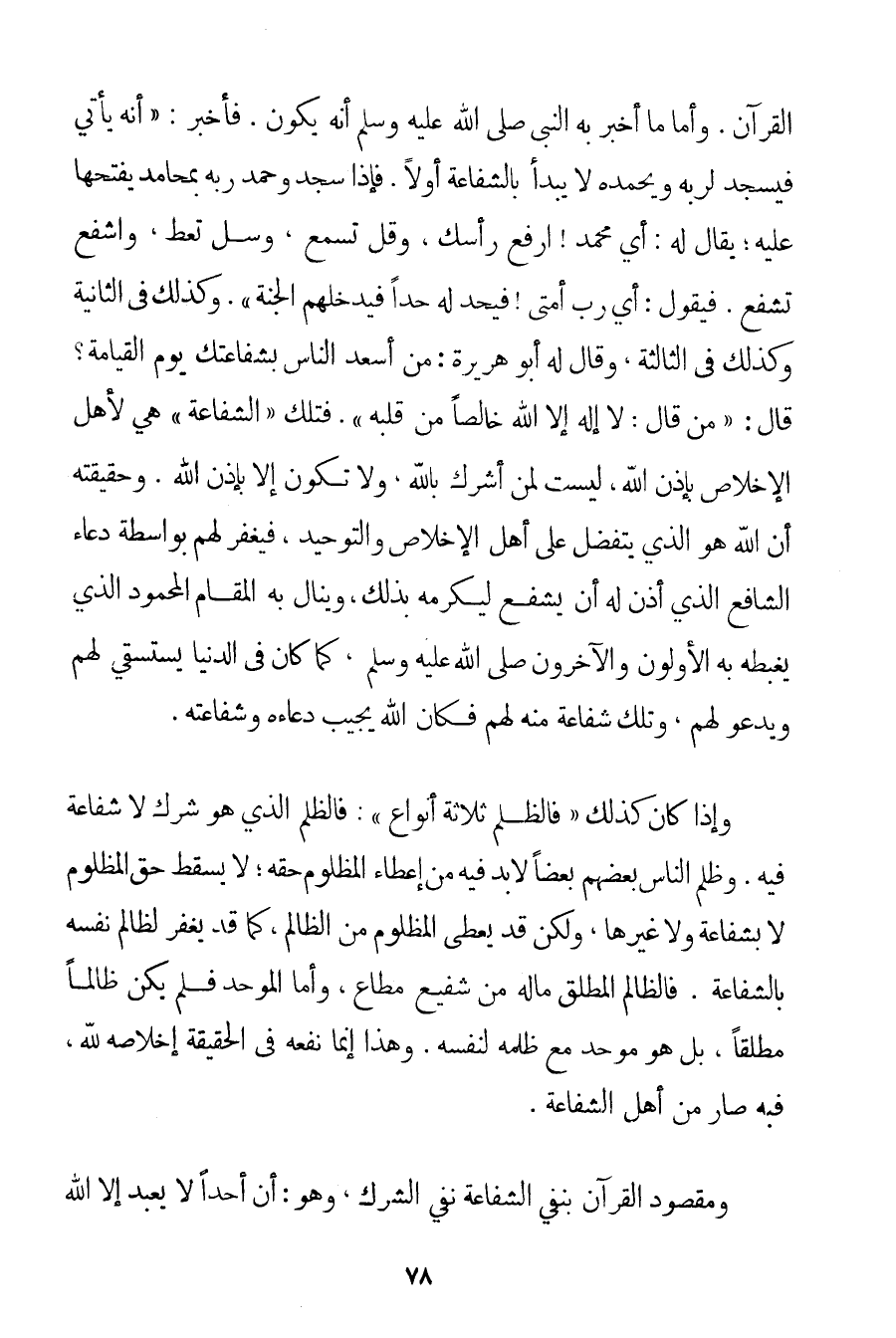 الْقُرْآنُ. وَأَمَّا مَا أَخْبَرَ بِهِ النَّبِيُّ صَلَّى اللَّهُ عَلَيْهِ وَسَلَّمَ أَنَّهُ يَكُونُ. فَأَخْبَرَ: {أَنَّهُ يَأْتِي فَيَسْجُدُ لِرَبِّهِ وَيَحْمَدُهُ لَا يَبْدَأُ بِالشَّفَاعَةِ أَوَّلًا. فَإِذَا سَجَدَ وَحَمِدَ رَبَّهُ بِمَحَامِدَ يَفْتَحُهَا عَلَيْهِ؛ يُقَالُ لَهُ: أَيْ مُحَمَّدُ ارْفَعْ رَأْسَك وَقُلْ تُسْمَعْ وَسَلْ تُعْطَ وَاشْفَعْ تُشَفَّعْ. فَيَقُولُ: أَيْ رَبِّ أُمَّتِي فَيَحُدُّ لَهُ حَدًّا فَيُدْخِلُهُمْ الْجَنَّةَ. وَكَذَلِكَ فِي الثَّانِيَةِ وَكَذَلِكَ فِي الثَّالِثَةِ وَقَالَ لَهُ أَبُو هُرَيْرَةَ: مَنْ أَسْعَدُ النَّاسِ بِشَفَاعَتِك يَوْمَ الْقِيَامَةِ؟ قَالَ: مَنْ قَالَ: لَا إلَهَ إلَّا اللَّهُ خَالِصًا مِنْ قَلْبِهِ} . فَتِلْكَ " الشَّفَاعَةُ " هِيَ لِأَهْلِ الْإِخْلَاصِ بِإِذْنِ اللَّهِ لَيْسَتْ لِمَنْ أَشْرَكَ بِاَللَّهِ وَلَا تَكُونُ إلَّا بِإِذْنِ اللَّهِ. وَحَقِيقَتُهُ أَنَّ اللَّهَ هُوَ الَّذِي يَتَفَضَّلُ عَلَى أَهْلِ الْإِخْلَاصِ وَالتَّوْحِيدِ فَيَغْفِرُ لَهُمْ بِوَاسِطَةِ دُعَاءِ الشَّافِعِ الَّذِي أَذِنَ لَهُ أَنْ يَشْفَعَ لِيُكْرِمَهُ بِذَلِكَ وَيَنَالَ بِهِ الْمَقَامَ الْمَحْمُودَ الَّذِي يَغْبِطُهُ بِهِ الْأَوَّلُونَ والآخرون صَلَّى اللَّهُ عَلَيْهِ وَسَلَّمَ كَمَا كَانَ فِي الدُّنْيَا يَسْتَسْقِي لَهُمْ وَيَدْعُو لَهُمْ وَتِلْكَ شَفَاعَةٌ مِنْهُ لَهُمْ فَكَانَ اللَّهُ يُجِيبُ دُعَاءَهُ وَشَفَاعَتَهُ. وَإِذَا كَانَ كَذَلِكَ " فَالظُّلْمُ ثَلَاثَةُ أَنْوَاعٍ ": فَالظُّلْمُ الَّذِي هُوَ شِرْكٌ لَا شَفَاعَةَ فِيهِ. وَظُلْمُ النَّاسِ بَعْضِهِمْ بَعْضًا لَا بُدَّ فِيهِ مِنْ إعْطَاءِ الْمَظْلُومِ حَقَّهُ؛ لَا يَسْقُطُ حَقُّ الْمَظْلُومِ لَا بِشَفَاعَةِ وَلَا غَيْرِهَا وَلَكِنْ قَدْ يُعْطَى الْمَظْلُومُ مِنْ الظَّالِمِ كَمَا قَدْ يُغْفَرُ لِظَالِمِ نَفْسِهِ بِالشَّفَاعَةِ. فَالظَّالِمُ الْمُطْلَقُ مَا لَهُ مِنْ شَفِيعٍ مُطَاعٍ وَأَمَّا الْمُوَحِّدُ فَلَمْ يَكُنْ ظَالِمًا مُطْلَقًا بَلْ هُوَ مُوَحِّدٌ مَعَ ظُلْمِهِ لِنَفْسِهِ. وَهَذَا إنَّمَا نَفَعَهُ فِي الْحَقِيقَةِ إخْلَاصُهُ لِلَّهِ فَبِهِ صَارَ مِنْ أَهْل الشَّفَاعَةِ. وَمَقْصُودُ الْقُرْآنِ يَنْفِي الشَّفَاعَةَ نَفْيَ الشِّرْكِ وَهُوَ: أَنَّ أَحَدًا لَا يَعْبُدُ إلَّا اللَّهَ