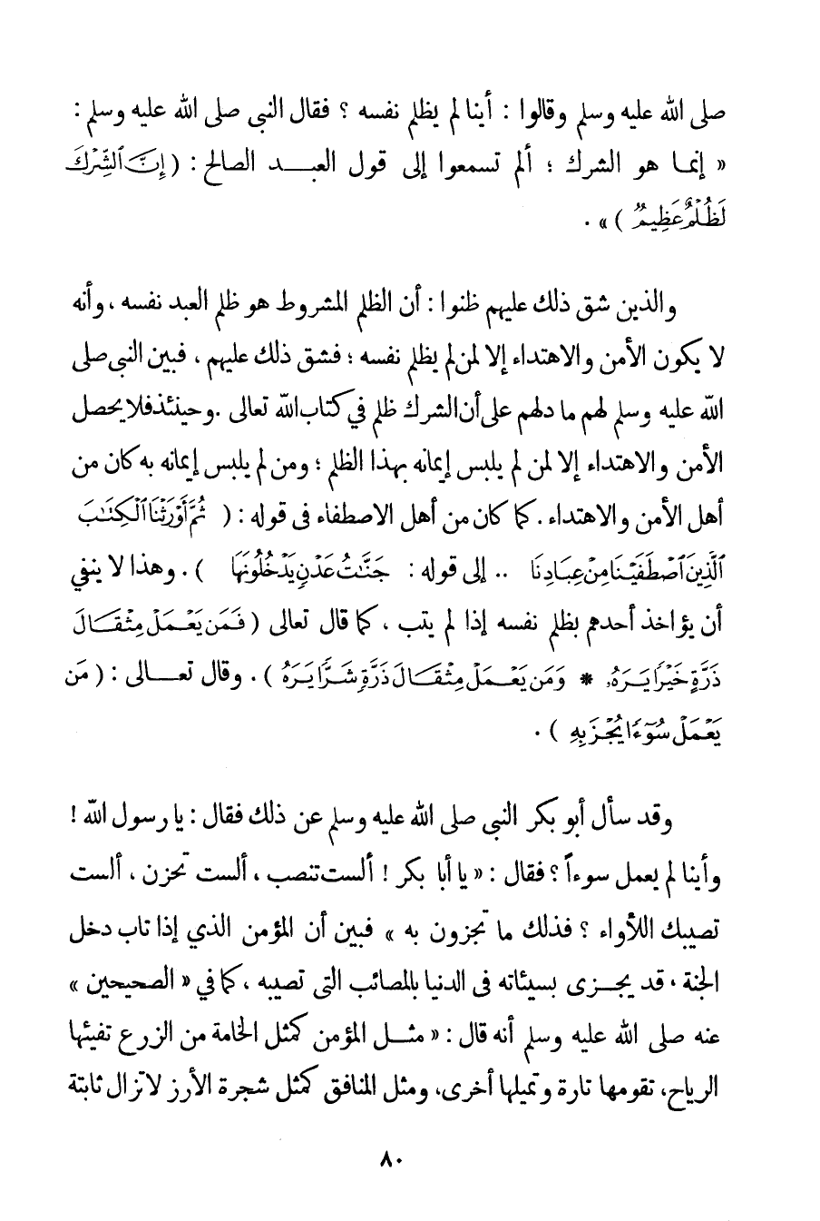 صَلَّى اللَّهُ عَلَيْهِ وَسَلَّمَ وَقَالُوا: أَيُّنَا لَمْ يَظْلِمْ نَفْسَهُ؟ فَقَالَ النَّبِيُّ صَلَّى اللَّهُ عَلَيْهِ وَسَلَّمَ إنَّمَا هُوَ الشِّرْكُ؛ أَلَمْ تَسْمَعُوا إلَى قَوْلِ الْعَبْدِ الصَّالِحِ: {إنَّ الشِّرْكَ لَظُلْمٌ عَظِيمٌ} } . وَاَلَّذِينَ شَقَّ ذَلِكَ عَلَيْهِمْ ظَنُّوا: أَنَّ الظُّلْمَ الْمَشْرُوطَ هُوَ ظُلْمُ الْعَبْدِ نَفْسَهُ وَأَنَّهُ لَا يَكُونُ الْأَمْنُ وَالِاهْتِدَاءُ إلَّا لِمَنْ لَمْ يَظْلِمْ نَفْسَهُ؛ فَشَقَّ ذَلِكَ عَلَيْهِمْ فَبَيَّنَ النَّبِيُّ صَلَّى اللَّهُ عَلَيْهِ وَسَلَّمَ لَهُمْ مَا دَلَّهُمْ عَلَى أَنَّ الشِّرْكَ ظُلْمٌ فِي كِتَابِ اللَّهِ تَعَالَى. وَحِينَئِذٍ فَلَا يَحْصُلُ الْأَمْنُ وَالِاهْتِدَاءُ إلَّا لِمَنْ لَمْ يُلْبِسْ إيمَانَهُ بِهَذَا الظُّلْمِ؛ وَمَنْ لَمْ يُلْبِسْ إيمَانَهُ بِهِ كَانَ مِنْ أَهْلِ الْأَمْنِ وَالِاهْتِدَاءِ. كَمَا كَانَ مِنْ أَهْلِ الِاصْطِفَاءِ فِي قَوْلِهِ: {ثُمَّ أَوْرَثْنَا الْكِتَابَ الَّذِينَ اصْطَفَيْنَا مِنْ عِبَادِنَا} إلَى قَوْلِهِ {جَنَّاتُ عَدْنٍ يَدْخُلُونَهَا} . وَهَذَا لَا يَنْفِي أَنْ يُؤَاخَذَ أَحَدُهُمْ بِظُلْمِ نَفْسِهِ إذَا لَمْ يَتُبْ كَمَا قَالَ تَعَالَى {فَمَنْ يَعْمَلْ مِثْقَالَ ذَرَّةٍ خَيْرًا يَرَهُ وَمَنْ يَعْمَلْ مِثْقَالَ ذَرَّةٍ شَرًّا يَرَهُ} . وَقَالَ تَعَالَى: {مَنْ يَعْمَلْ سُوءًا يُجْزَ بِهِ} . وَقَدْ {سَأَلَ أَبُو بَكْرٍ النَّبِيَّ صَلَّى اللَّهُ عَلَيْهِ وَسَلَّمَ عَنْ ذَلِكَ فَقَالَ: يَا رَسُولَ اللَّهِ وَأَيُّنَا لَمْ يَعْمَلْ سُوءًا؟ فَقَالَ: يَا أَبَا بَكْرٍ أَلَسْت تَنْصَبُ أَلَسْت تَحْزَنُ أَلَسْت تُصِيبُك اللَّأْوَاءُ؟ فَذَلِكَ مَا تُجْزَوْنَ بِهِ} فَبَيَّنَ أَنَّ الْمُؤْمِنَ الَّذِي إذَا تَابَ دَخَلَ الْجَنَّةَ قَدْ يُجْزَى بِسَيِّئَاتِهِ فِي الدُّنْيَا بِالْمَصَائِبِ الَّتِي تُصِيبُهُ كَمَا فِي " الصَّحِيحَيْنِ " عَنْهُ صَلَّى اللَّهُ عَلَيْهِ وَسَلَّمَ أَنَّهُ قَالَ: {مَثَلُ الْمُؤْمِنِ كَمَثَلِ الْخَامَةِ مِنْ الزَّرْعِ تُفَيِّئُهَا الرِّيَاحُ تُقَوِّمُهَا تَارَةً وَتُمِيلُهَا أُخْرَى وَمَثَلُ الْمُنَافِقِ كَمَثَلِ شَجَرَةِ الْأَرْزِ لَا تَزَالُ ثَابِتَةً