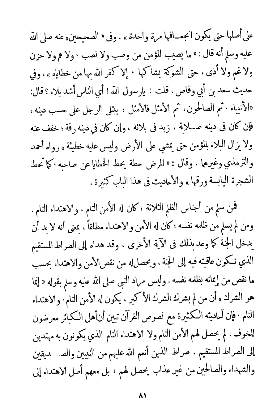 عَلَى أَصْلِهَا حَتَّى يَكُونَ انْجِعَافُهَا مَرَّةً وَاحِدَةً} . وَفِي " الصَّحِيحَيْنِ " عَنْهُ صَلَّى اللَّهُ عَلَيْهِ وَسَلَّمَ أَنَّهُ قَالَ: {مَا يُصِيبُ الْمُؤْمِنَ مِنْ وَصَبٍ وَلَا نَصَبٍ وَلَا هَمٍّ وَلَا حُزْنٍ وَلَا غَمٍّ وَلَا أَذًى حَتَّى الشَّوْكَةِ يشاكها إلَّا كَفَّرَ اللَّهُ بِهَا مِنْ خَطَايَاهُ} وَفِي حَدِيثِ {سَعْدِ بْنِ أَبِي وَقَّاصٍ قُلْت: يَا رَسُولَ اللَّهِ أَيُّ النَّاسِ أَشَدُّ بَلَاءً؟ قَالَ: الْأَنْبِيَاءُ ثُمَّ الصَّالِحُونَ ثُمَّ الْأَمْثَلُ فَالْأَمْثَلُ؛ يُبْتَلَى الرَّجُلُ عَلَى حَسَبِ دِينِهِ فَإِنْ كَانَ فِي دِينِهِ صَلَابَةٌ زِيدَ فِي بَلَائِهِ وَإِنْ كَانَ فِي دِينِهِ رِقَّةٌ؛ خُفِّفَ عَنْهُ وَلَا يَزَالُ الْبَلَاءُ بِالْمُؤْمِنِ حَتَّى يَمْشِيَ عَلَى الْأَرْضِ وَلَيْسَ عَلَيْهِ خَطِيئَةٌ} رَوَاهُ أَحْمَد وَالتِّرْمِذِي وَغَيْرُهُمَا. وَقَالَ: {الْمَرَضُ حِطَّةٌ يَحُطُّ الْخَطَايَا عَنْ صَاحِبِهِ كَمَا تَحُطُّ الشَّجَرَةُ الْيَابِسَةُ وَرَقَهَا} وَالْأَحَادِيثُ فِي هَذَا الْبَابِ كَثِيرَةٌ. فَمَنْ سَلِمَ مِنْ أَجْنَاسِ الظُّلْمِ الثَّلَاثَةِ؛ كَانَ لَهُ الْأَمْنُ التَّامُّ وَالِاهْتِدَاءُ التَّامُّ. وَمَنْ لَمْ يَسْلَمْ مِنْ ظُلْمِهِ نَفْسَهُ؛ كَانَ لَهُ الْأَمْنُ وَالِاهْتِدَاءُ مُطْلَقًا بِمَعْنَى أَنَّهُ لَا بُدَّ أَنْ يَدْخُلَ الْجَنَّةَ كَمَا وَعَدَ بِذَلِكَ فِي الْآيَةِ الْأُخْرَى وَقَدْ هَدَاهُ إلَى الصِّرَاطِ الْمُسْتَقِيمِ الَّذِي تَكُونُ عَاقِبَتُهُ فِيهِ إلَى الْجَنَّةِ وَيَحْصُلُ لَهُ مِنْ نَقْصِ الْأَمْنِ وَالِاهْتِدَاءِ بِحَسَبِ مَا نَقَصَ مِنْ إيمَانِهِ بِظُلْمِهِ نَفْسَهُ. وَلَيْسَ مُرَادُ النَّبِيِّ صَلَّى اللَّهُ عَلَيْهِ وَسَلَّمَ بِقَوْلِهِ {إنَّمَا هُوَ الشِّرْكُ} أَنَّ مَنْ لَمْ يُشْرِكْ الشِّرْكَ الْأَكْبَرَ يَكُونُ لَهُ الْأَمْنُ التَّامُّ وَالِاهْتِدَاءُ التَّامُّ. فَإِنَّ أَحَادِيثَهُ الْكَثِيرَةَ مَعَ نُصُوصِ الْقُرْآنِ تُبَيِّنُ أَنَّ أَهْلَ الْكَبَائِرِ مُعَرَّضُونَ لِلْخَوْفِ لَمْ يَحْصُلْ لَهُمْ الْأَمْنُ التَّامُّ وَلَا الِاهْتِدَاءُ التَّامُّ الَّذِي يَكُونُونَ بِهِ مُهْتَدِينَ إلَى الصِّرَاطِ الْمُسْتَقِيمِ صِرَاطِ الَّذِينَ أَنْعَمَ اللَّهُ عَلَيْهِمْ مِنْ النَّبِيِّينَ وَالصِّدِّيقِينَ وَالشُّهَدَاءِ وَالصَّالِحِينَ مِنْ غَيْرِ عَذَابٍ يَحْصُلُ لَهُمْ؛ بَلْ مَعَهُمْ أَصْلُ الِاهْتِدَاءِ إلَى