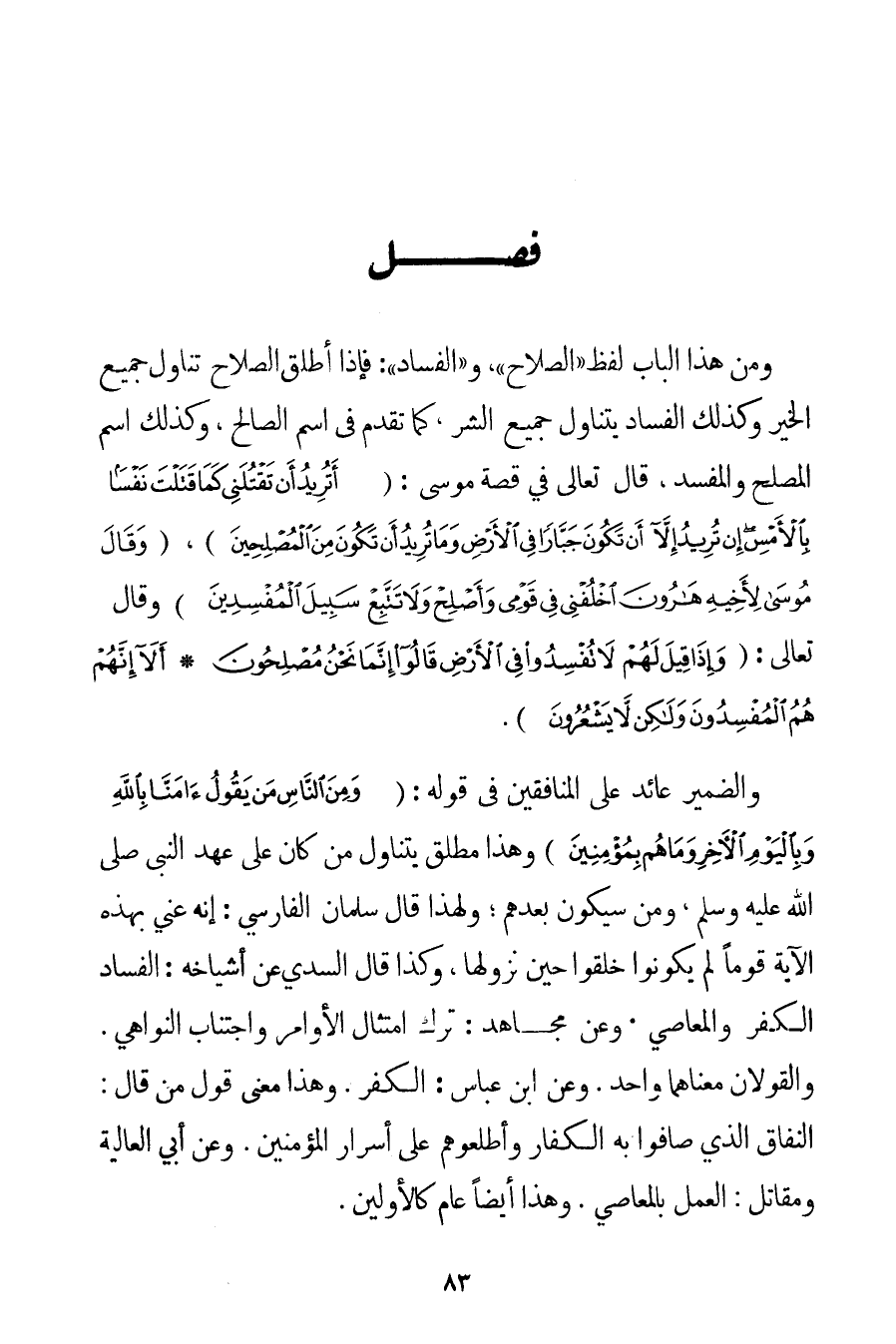 وَمِنْ هَذَا الْبَابِ لَفْظُ " الصَّلَاحِ " وَ " الْفَسَادِ ": فَإِذَا أُطْلِقَ الصَّلَاحُ تَنَاوَلَ جَمِيعَ الْخَيْرِ وَكَذَلِكَ الْفَسَادُ يَتَنَاوَلُ جَمِيعَ الشَّرِّ كَمَا تَقَدَّمَ فِي اسْمِ الصَّالِحِ وَكَذَلِكَ اسْمُ الْمُصْلِحِ وَالْمُفْسِدِ قَالَ تَعَالَى فِي قِصَّةِ مُوسَى: {أَتُرِيدُ أَنْ تَقْتُلَنِي كَمَا قَتَلْتَ نَفْسًا بِالْأَمْسِ إنْ تُرِيدُ إلَّا أَنْ تَكُونَ جَبَّارًا فِي الْأَرْضِ وَمَا تُرِيدُ أَنْ تَكُونَ مِنَ الْمُصْلِحِينَ} {وَقَالَ مُوسَى لِأَخِيهِ هَارُونَ اخْلُفْنِي فِي قَوْمِي وَأَصْلِحْ وَلَا تَتَّبِعْ سَبِيلَ الْمُفْسِدِينَ} وَقَالَ تَعَالَى: {وَإِذَا قِيلَ لَهُمْ لَا تُفْسِدُوا فِي الْأَرْضِ قَالُوا إنَّمَا نَحْنُ مُصْلِحُونَ} {أَلَا إنَّهُمْ هُمُ الْمُفْسِدُونَ وَلَكِنْ لَا يَشْعُرُونَ} . وَالضَّمِيرُ عَائِدٌ عَلَى الْمُنَافِقِينَ فِي قَوْلِهِ: {وَمِنَ النَّاسِ مَنْ يَقُولُ آمَنَّا بِاللَّهِ وَبِالْيَوْمِ الْآخِرِ وَمَا هُمْ بِمُؤْمِنِينَ} وَهَذَا مُطْلَقٌ يَتَنَاوَلُ مَنْ كَانَ عَلَى عَهْدِ النَّبِيِّ صَلَّى اللَّهُ عَلَيْهِ وَسَلَّمَ وَمَنْ سَيَكُونُ بَعْدَهُمْ؛ وَلِهَذَا قَالَ سَلْمَانُ الْفَارِسِيُّ: إنَّهُ عَنَى بِهَذِهِ الْآيَةِ قَوْمًا لَمْ يَكُونُوا خُلِقُوا حِينَ نُزُولِهَا وَكَذَا قَالَ السدي عَنْ أَشْيَاخِهِ: الْفَسَادُ الْكُفْرُ وَالْمَعَاصِي. وَعَنْ مُجَاهِدٍ: تَرْكُ امْتِثَالِ الْأَوَامِرِ وَاجْتِنَابِ النَّوَاهِي. وَالْقَوْلَانِ مَعْنَاهُمَا وَاحِدٌ. وَعَنْ ابْنِ عَبَّاسٍ: الْكُفْرُ. وَهَذَا مَعْنَى قَوْلِ مَنْ قَالَ: النِّفَاقُ الَّذِي صَافُوا بِهِ الْكُفَّارَ وَأَطْلَعُوهُمْ عَلَى أَسْرَارِ الْمُؤْمِنِينَ. وَعَنْ أَبِي الْعَالِيَةِ وَمُقَاتِلٍ: الْعَمَلُ بِالْمَعَاصِي. وَهَذَا أَيْضًا عَامٌّ كَالْأَوَّلَيْنِ.