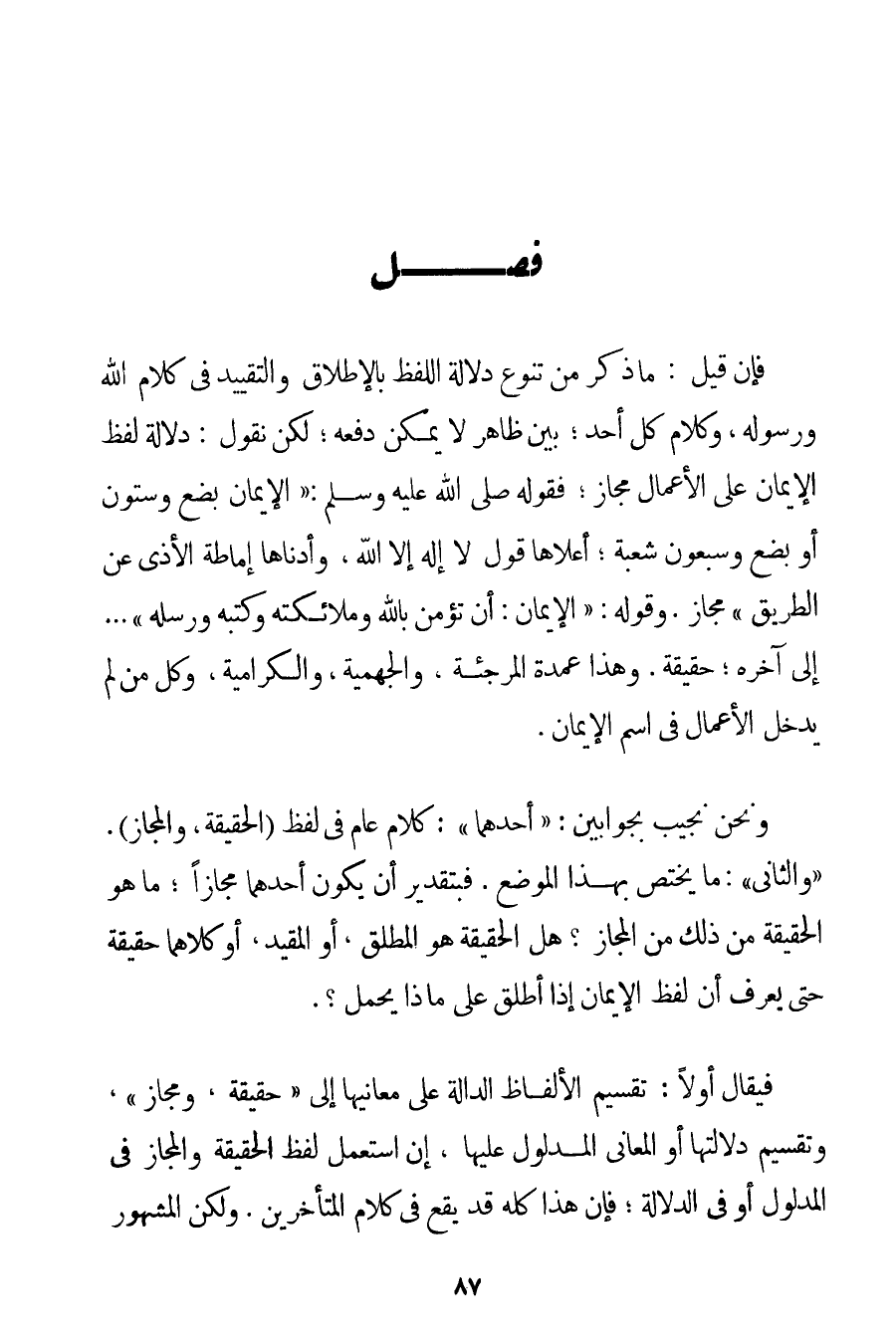 فَإِنْ قِيلَ: مَا ذَكَرَ مِنْ تَنَوُّعِ دَلَالَةِ اللَّفْظِ بِالْإِطْلَاقِ وَالتَّقْيِيدِ فِي كَلَامِ اللَّهِ وَرَسُولِهِ وَكَلَامِ كُلِّ أَحَدٍ؛ بَيِّنٌ ظَاهِرٌ لَا يُمْكِنُ دَفْعُهُ؛ لَكِنْ نَقُولُ: دَلَالَةُ لَفْظِ الْإِيمَانِ عَلَى الْأَعْمَالِ مَجَازٌ؛ فَقَوْلُهُ صَلَّى اللَّهُ عَلَيْهِ وَسَلَّمَ " {الْإِيمَانُ بِضْعٌ وَسِتُّونَ أَوْ بِضْعٌ وَسَبْعُونَ شُعْبَةً؛ أَعْلَاهَا قَوْلُ لَا إلَهَ إلَّا اللَّهُ وَأَدْنَاهَا إمَاطَةُ الْأَذَى عَنْ الطَّرِيقِ} " مَجَازٌ. وَقَوْلُهُ: " {الْإِيمَانُ: أَنْ تُؤْمِنَ بِاَللَّهِ وَمَلَائِكَتِهِ وَكُتُبِهِ وَرُسُلِهِ} " إلَى آخِرِهِ؛ حَقِيقَةٌ. وَهَذَا عُمْدَةُ الْمُرْجِئَةِ وَالْجَهْمِيَّة والكَرَّامِيَة وَكُلُّ مَنْ لَمْ يُدْخِلْ الْأَعْمَالَ فِي اسْمِ الْإِيمَانِ. وَنَحْنُ نُجِيبُ بِجَوَابَيْنِ: " أَحَدُهُمَا ": كَلَامٌ عَامٌّ فِي لَفْظِ (الْحَقِيقَةِ وَالْمَجَازِ) . " وَالثَّانِي ": مَا يَخْتَصُّ بِهَذَا الْمَوْضِعِ. فَبِتَقْدِيرِ أَنْ يَكُونَ أَحَدُهُمَا مَجَازًا؛ مَا هُوَ الْحَقِيقَةُ مِنْ ذَلِكَ مِنْ الْمَجَازِ؟ هَلْ الْحَقِيقَةُ هُوَ الْمُطْلَقُ أَوْ الْمُقَيَّدُ أَوْ كِلَاهُمَا حَقِيقَةٌ حَتَّى يُعْرَفَ أَنَّ لَفْظَ الْإِيمَانِ إذَا أُطْلِقَ عَلَى مَاذَا يُحْمَلُ؟ . فَيُقَالُ أَوَّلًا: تَقْسِيمُ الْأَلْفَاظِ الدَّالَّةِ عَلَى مَعَانِيهَا إلَى " حَقِيقَةٍ وَمَجَازٍ " وَتَقْسِيمُ دَلَالَتِهَا أَوْ الْمَعَانِي الْمَدْلُولِ عَلَيْهَا إنْ اُسْتُعْمِلَ لَفْظُ الْحَقِيقَةِ وَالْمَجَازِ فِي الْمَدْلُولِ أَوْ فِي الدَّلَالَةِ؛ فَإِنَّ هَذَا كُلَّهُ قَدْ يَقَعُ فِي كَلَامِ الْمُتَأَخِّرِينَ. وَلَكِنَّ الْمَشْهُورَ