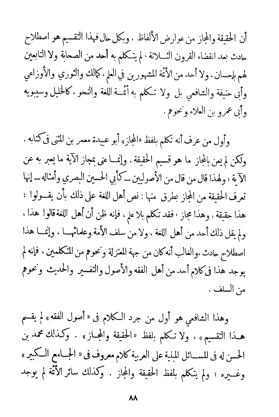 أَنَّ الْحَقِيقَةَ وَالْمَجَازَ مِنْ عَوَارِضِ الْأَلْفَاظِ وَبِكُلِّ حَالٍ فَهَذَا التَّقْسِيمُ هُوَ اصْطِلَاحٌ حَادِثٌ بَعْدَ انْقِضَاءِ الْقُرُونِ الثَّلَاثَةِ لَمْ يَتَكَلَّمْ بِهِ أَحَدٌ مِنْ الصَّحَابَةِ وَلَا التَّابِعِينَ لَهُمْ بِإِحْسَانِ وَلَا أَحَدٌ مِنْ الْأَئِمَّةِ الْمَشْهُورِينَ فِي الْعِلْمِ كَمَالِكِ وَالثَّوْرِيِّ وَالْأَوْزَاعِي وَأَبِي حَنِيفَةَ وَالشَّافِعِيِّ بَلْ وَلَا تَكَلَّمَ بِهِ أَئِمَّةُ اللُّغَةِ وَالنَّحْوِ كَالْخَلِيلِ وَسِيبَوَيْهِ وَأَبِي عَمْرِو بْنِ الْعَلَاءِ وَنَحْوِهِمْ. [وَأَوَّلُ مَنْ عُرِفَ أَنَّهُ تَكَلَّمَ بِلَفْظِ " الْمَجَازِ " أَبُو عُبَيْدَةَ مَعْمَرُ بْنُ الْمُثَنَّى فِي كِتَابِهِ. وَلَكِنْ لَمْ يَعْنِ بِالْمَجَازِ مَا هُوَ قَسِيمُ الْحَقِيقَةِ] (*) . وَإِنَّمَا عَنَى بِمَجَازِ الْآيَةِ مَا يُعَبَّرُ بِهِ عَنْ الْآيَةِ؛ وَلِهَذَا قَالَ مَنْ قَالَ مِنْ الْأُصُولِيِّينَ - كَأَبِي الْحُسَيْنِ الْبَصْرِيِّ وَأَمْثَالِهِ - إنَّمَا تُعْرَفُ الْحَقِيقَةُ مِنْ الْمَجَازِ بِطُرُقِ مِنْهَا: نَصُّ أَهْلِ اللُّغَةِ عَلَى ذَلِكَ بِأَنْ يَقُولُوا: هَذَا حَقِيقَةٌ وَهَذَا مَجَازٌ، فَقَدْ تَكَلَّمَ بِلَا عِلْمٍ، فَإِنَّهُ ظَنَّ أَنَّ أَهْلَ اللُّغَةِ قَالُوا هَذَا وَلَمْ يَقُلْ ذَلِكَ أَحَدٌ مِنْ أَهْلِ اللُّغَةِ وَلَا مِنْ سَلَفِ الْأُمَّةِ وَعُلَمَائِهَا وَإِنَّمَا هَذَا اصْطِلَاحٌ حَادِثٌ وَالْغَالِبُ أَنَّهُ كَانَ مِنْ جِهَةِ الْمُعْتَزِلَةِ وَنَحْوِهِمْ مِنْ الْمُتَكَلِّمِينَ فَإِنَّهُ لَمْ يُوجَدْ هَذَا فِي كَلَامِ أَحَدٍ مِنْ أَهْلِ الْفِقْهِ وَالْأُصُولِ وَالتَّفْسِيرِ وَالْحَدِيثِ وَنَحْوِهِمْ مِنْ السَّلَفِ. وَهَذَا الشَّافِعِيُّ هُوَ أَوَّلُ مَنْ جَرَّدَ الْكَلَامَ فِي " أُصُولِ الْفِقْهِ " لَمْ يُقَسِّمْ هَذَا التَّقْسِيمَ " وَلَا تَكَلَّمَ بِلَفْظِ " الْحَقِيقَةِ وَالْمَجَازِ ". وَكَذَلِكَ مُحَمَّدُ بْنُ الْحَسَنِ لَهُ فِي الْمَسَائِلِ الْمَبْنِيَّةِ عَلَى الْعَرَبِيَّةِ كَلَامٌ مَعْرُوفٌ فِي " الْجَامِعِ الْكَبِيرِ " وَغَيْرِهِ؛ وَلَمْ يَتَكَلَّمْ بِلَفْظِ الْحَقِيقَةِ وَالْمَجَازِ. وَكَذَلِكَ سَائِرُ الْأَئِمَّةِ لَمْ يُوجَدْ