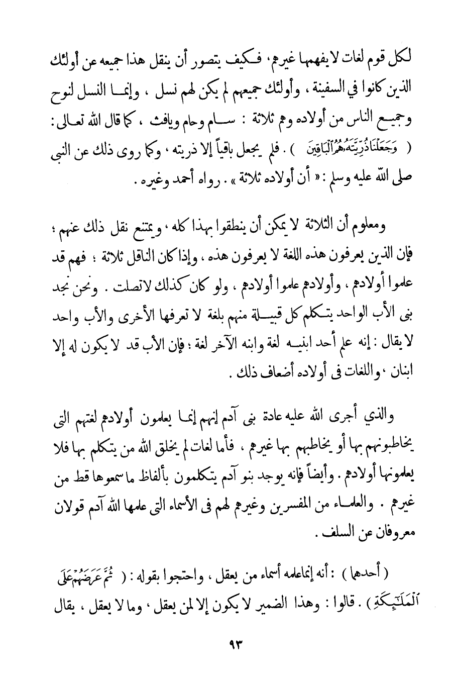 لِكُلِّ قَوْمٍ لُغَاتٌ لَا يَفْهَمُهَا غَيْرُهُمْ فَكَيْفَ يُتَصَوَّرُ أَنْ يُنْقَلَ هَذَا جَمِيعُهُ عَنْ أُولَئِكَ الَّذِينَ كَانُوا فِي السَّفِينَةِ وَأُولَئِكَ جَمِيعُهُمْ لَمْ يَكُنْ لَهُمْ نَسْلٌ وَإِنَّمَا النَّسْلُ لِنُوحِ وَجَمِيعُ النَّاسِ مِنْ أَوْلَادِهِ وَهُمْ ثَلَاثَةٌ: سَامُ وحام ويافث كَمَا قَالَ اللَّهُ تَعَالَى: {وَجَعَلْنَا ذُرِّيَّتَهُ هُمُ الْبَاقِينَ} . فَلَمْ يَجْعَلْ بَاقِيًا إلَّا ذُرِّيَّتَهُ وَكَمَا رُوِيَ ذَلِكَ عَنْ النَّبِيِّ صَلَّى اللَّهُ عَلَيْهِ وَسَلَّمَ " أَنَّ أَوْلَادَهُ ثَلَاثَةٌ ". رَوَاهُ أَحْمَد وَغَيْرُهُ. وَمَعْلُومٌ أَنَّ الثَّلَاثَةَ لَا يُمْكِنُ أَنْ يَنْطِقُوا بِهَذَا كُلِّهِ وَيَمْتَنِعُ نَقْلُ ذَلِكَ عَنْهُمْ؛ فَإِنَّ الَّذِينَ يَعْرِفُونَ هَذِهِ اللُّغَةَ لَا يَعْرِفُونَ هَذِهِ، وَإِذَا كَانَ النَّاقِلُ ثَلَاثَةً؛ فَهُمْ قَدْ عَلِمُوا أَوْلَادَهُمْ، وَأَوْلَادُهُمْ عَلِمُوا أَوْلَادَهُمْ، وَلَوْ كَانَ كَذَلِكَ لَاتَّصَلَتْ. وَنَحْنُ نَجِدُ بَنِي الْأَبِ الْوَاحِدِ يَتَكَلَّمُ كُلُّ قَبِيلَةٍ مِنْهُمْ بِلُغَةِ لَا تَعْرِفُهَا الْأُخْرَى وَالْأَبُ وَاحِدٌ، لَا يُقَالُ: إنَّهُ عَلَّمَ أَحَدَ ابْنَيْهِ لُغَةً وَابْنَهُ الْآخَرَ لُغَةً؛ فَإِنَّ الْأَبَ قَدْ لَا يَكُونُ لَهُ إلَّا ابْنَانِ وَاللُّغَاتُ فِي أَوْلَادِهِ أَضْعَافُ ذَلِكَ. وَاَلَّذِي أَجْرَى اللَّهُ عَلَيْهِ عَادَةَ بَنِي آدَمَ أَنَّهُمْ إنَّمَا يُعَلِّمُونَ أَوْلَادَهُمْ لُغَتَهُمْ الَّتِي يُخَاطِبُونَهُمْ بِهَا أَوْ يُخَاطِبُهُمْ بِهَا غَيْرُهُمْ فَأَمَّا لُغَاتٌ لَمْ يَخْلُقْ اللَّهُ مَنْ يَتَكَلَّمُ بِهَا فَلَا يُعَلِّمُونَهَا أَوْلَادَهُمْ. وَأَيْضًا فَإِنَّهُ يُوجَدُ بَنُو آدَمَ يَتَكَلَّمُونَ بِأَلْفَاظِ مَا سَمِعُوهَا قَطُّ مِنْ غَيْرِهِمْ. وَالْعُلَمَاءُ مِنْ الْمُفَسِّرِينَ وَغَيْرِهِمْ لَهُمْ فِي الْأَسْمَاءِ الَّتِي عَلَّمَهَا اللَّهُ آدَمَ قَوْلَانِ مَعْرُوفَانِ عَنْ السَّلَفِ. (أَحَدُهُمَا) : أَنَّهُ إنَّمَا عَلَّمَهُ أَسْمَاءَ مَنْ يَعْقِلُ وَاحْتَجُّوا بِقَوْلِهِ: {ثُمَّ عَرَضَهُمْ عَلَى الْمَلَائِكَةِ} . قَالُوا: وَهَذَا الضَّمِيرُ لَا يَكُونُ إلَّا لِمَنْ يَعْقِلُ، وَمَا لَا يَعْقِلُ يُقَالُ