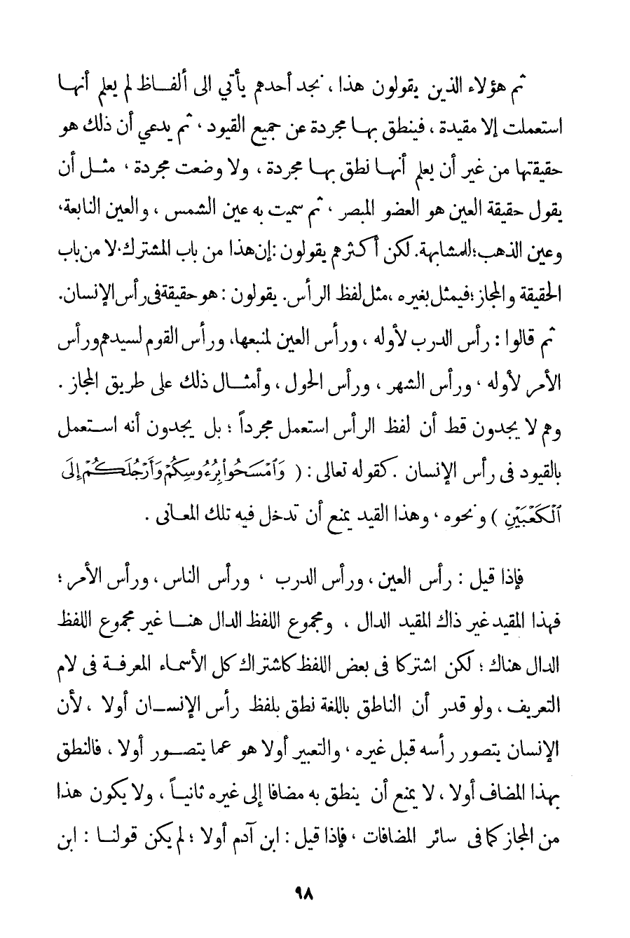 ثُمَّ هَؤُلَاءِ الَّذِينَ يَقُولُونَ هَذَا، نَجِدُ أَحَدَهُمْ يَأْتِي إلَى أَلْفَاظٍ لَمْ يَعْلَمْ أَنَّهَا اُسْتُعْمِلَتْ إلَّا مُقَيَّدَةً فَيَنْطِقُ بِهَا مُجَرَّدَةً عَنْ جَمِيعِ الْقُيُودِ ثُمَّ يَدَّعِي أَنَّ ذَلِكَ هُوَ حَقِيقَتُهَا مِنْ غَيْرِ أَنْ يَعْلَمَ أَنَّهَا نُطِقَ بِهَا مُجَرَّدَةً وَلَا وُضِعَتْ مُجَرَّدَةً، مِثْلُ أَنْ يَقُولَ حَقِيقَةُ الْعَيْنِ هُوَ الْعُضْوُ الْمُبْصِرُ ثُمَّ سُمِّيَتْ بِهِ عَيْنُ الشَّمْسِ وَالْعَيْنُ النَّابِعَةُ وَعَيْنُ الذَّهَبِ؛ لِلْمُشَابَهَةِ. لَكِنَّ أَكْثَرَهُمْ يَقُولُونَ: إنَّ هَذَا مِنْ بَابِ الْمُشْتَرَكِ لَا مِنْ بَابِ الْحَقِيقَةِ وَالْمَجَازِ؛ فَيُمَثِّلُ بِغَيْرِهِ مِثْلَ لَفْظِ الرَّأْسِ. يَقُولُونَ: هُوَ حَقِيقَةٌ فِي رَأْسِ الْإِنْسَانِ. ثُمَّ قَالُوا: رَأْسُ الدَّرْبِ لِأَوَّلِهِ وَرَأْسُ الْعَيْنِ لِمَنْبَعِهَا وَرَأْسُ الْقَوْمِ لِسَيِّدِهِمْ وَرَأْسُ الْأَمْرِ لِأَوَّلِهِ وَرَأْسُ الشَّهْرِ وَرَأْسُ الْحَوْلِ وَأَمْثَالُ ذَلِكَ عَلَى طَرِيقِ الْمَجَازِ. وَهُمْ لَا يَجِدُونَ قَطُّ أَنَّ لَفْظَ الرَّأْسِ اُسْتُعْمِلَ مُجَرَّدًا؛ بَلْ يَجِدُونَ أَنَّهُ اُسْتُعْمِلَ بِالْقُيُودِ فِي رَأْسِ الْإِنْسَانِ. كَقَوْلِهِ تَعَالَى: {وَامْسَحُوا بِرُءُوسِكُمْ وَأَرْجُلَكُمْ إلَى الْكَعْبَيْنِ} وَنَحْوِهِ وَهَذَا الْقَيْدُ يَمْنَعُ أَنْ تَدْخُلَ فِيهِ تِلْكَ الْمَعَانِي. فَإِذَا قِيلَ: رَأْسُ الْعَيْنِ وَرَأْسُ الدَّرْبِ وَرَأْسُ النَّاسِ وَرَأْسُ الْأَمْرِ؛ فَهَذَا الْمُقَيِّدُ غَيْرُ ذَاكَ الْمُقَيِّدِ الدَّالِّ، وَمَجْمُوعُ اللَّفْظِ الدَّالِّ هُنَا غَيْرُ مَجْمُوعِ اللَّفْظِ الدَّالِّ هُنَاكَ؛ لَكِنْ اشْتَرَكَا فِي بَعْضِ اللَّفْظِ كَاشْتِرَاكِ كُلِّ الْأَسْمَاءِ الْمُعَرَّفَةِ فِي لَامِ التَّعْرِيفِ، وَلَوْ قُدِّرَ أَنَّ النَّاطِقَ بِاللُّغَةِ نَطَقَ بِلَفْظِ رَأْسِ الْإِنْسَانِ أَوَّلًا؛ لِأَنَّ الْإِنْسَانَ يُتَصَوَّرُ رَأْسُهُ قَبْلَ غَيْرِهِ، وَالتَّعْبِيرُ أَوَّلًا هُوَ عَمَّا يُتَصَوَّرُ أَوَّلًا، فَالنُّطْقُ بِهَذَا الْمُضَافِ أَوَّلًا لَا يَمْنَعُ أَنْ يُنْطَقَ بِهِ مُضَافًا إلَى غَيْرِهِ ثَانِيًا، وَلَا يَكُونُ هَذَا مِنْ الْمَجَازِ كَمَا فِي سَائِرِ الْمُضَافَاتِ فَإِذَا قِيلَ: ابْنُ آدَمَ أَوَّلًا؛ لَمْ يَكُنْ قَوْلُنَا: ابْنُ