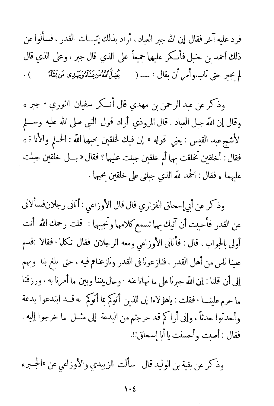 فَرَدَّ عَلَيْهِ آخَرُ فَقَالَ إنَّ اللَّهَ جَبَرَ الْعِبَادَ أَرَادَ بِذَلِكَ إثْبَاتَ الْقَدَرِ فَسَأَلُوا عَنْ ذَلِكَ أَحْمَدَ بْنَ حَنْبَلٍ فَأَنْكَرَ عَلَيْهِمَا جَمِيعًا عَلَى الَّذِي قَالَ جَبَرَ وَعَلَى الَّذِي قَالَ لَمْ يُجْبِرْ حَتَّى تَابَ وَأَمَرَ أَنْ يُقَالَ: - {يُضِلُّ اللَّهُ مَنْ يَشَاءُ وَيَهْدِي مَنْ يَشَاءُ} . وَذَكَرَ عَنْ عَبْدِ الرَّحْمَنِ بْنِ مَهْدِيٍّ قَالَ أَنْكَرَ سُفْيَانُ الثَّوْرِيُّ " جَبَرَ " وَقَالَ إنَّ اللَّهَ جَبَلَ الْعِبَادَ. قَالَ المروذي أَرَادَ قَوْلَ النَّبِيِّ صَلَّى اللَّهُ عَلَيْهِ وَسَلَّمَ لِأَشَجِّ عَبْدِ الْقَيْسِ: يَعْنِي قَوْلَهُ {إنَّ فِيك لَخُلُقَيْنِ يُحِبُّهُمَا اللَّهُ: الْحِلْمُ وَالْأَنَاةُ فَقَالَ: أَخُلُقَيْنِ تَخَلَّقْت بِهِمَا أَمْ خُلُقَيْنِ جُبِلْت عَلَيْهِمَا؟ فَقَالَ بَلْ خُلُقَيْنِ جُبِلْت عَلَيْهِمَا فَقَالَ: الْحَمْدُ لِلَّهِ الَّذِي جَبَلَنِي عَلَى خُلُقَيْنِ يُحِبُّهُمَا} . وَذَكَرَ عَنْ أَبِي إسْحَاقَ الفزاري قَالَ قَالَ الأوزاعي: أَتَانِي رَجُلَانِ فَسَأَلَانِي عَنْ الْقَدَرِ فَأَحْبَبْت أَنْ آتِيَك بِهِمَا تَسْمَعُ كَلَامَهُمَا وَتُجِيبُهُمَا: قُلْت رَحِمَك اللَّهُ أَنْتَ أَوْلَى بِالْجَوَابِ قَالَ: فَأَتَانِي الأوزاعي وَمَعَهُ الرَّجُلَانِ فَقَالَ تَكَلَّمَا فَقَالَا: قَدِمَ عَلَيْنَا نَاسٌ مِنْ أَهْلِ الْقَدَرِ فَنَازَعُونَا فِي الْقَدَرِ وَنَازَعْنَاهُمْ فِيهِ حَتَّى بَلَغَ بِنَا وَبِهِمْ إلَى أَنْ قُلْنَا: إنَّ اللَّهَ جَبَرَنَا عَلَى مَا نَهَانَا عَنْهُ وَحَالَ بَيْنَنَا وَبَيْنَ مَا أَمَرَنَا بِهِ وَرَزَقَنَا مَا حَرَّمَ عَلَيْنَا فَقُلْت: يَا هَؤُلَاءِ إنَّ الَّذِينَ أَتَوْكُمْ بِمَا أَتَوْكُمْ بِهِ قَدْ ابْتَدَعُوا بِدْعَةً وَأَحْدَثُوا حَدَثًا وَإِنِّي أَرَاكُمْ قَدْ خَرَجْتُمْ مِنْ الْبِدْعَةِ إلَى مِثْلِ مَا خَرَجُوا إلَيْهِ. فَقَالَ: أَصَبْت وَأَحْسَنْت يَا أَبَا إسْحَاقَ. وَذَكَرَ عَنْ بَقِيَّةَ بْنِ الْوَلِيدِ قَالَ سَأَلْت الزُّبَيْدِيَّ وَالْأَوْزَاعِي عَنْ " الْجَبْرِ "