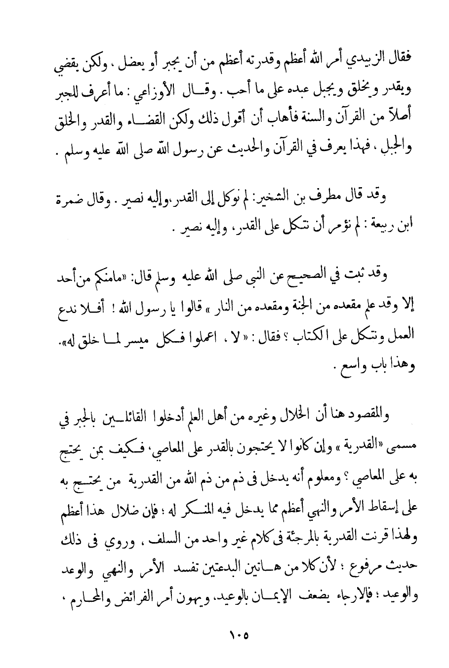 فَقَالَ الزُّبَيْدِيُّ أَمْرُ اللَّهِ أَعْظَمُ وَقُدْرَتُهُ أَعْظَمُ مِنْ أَنْ يُجْبِرَ أَوْ يُعْضِلَ وَلَكِنْ يَقْضِيَ وَيُقَدِّرَ وَيَخْلُقَ وَيُجْبِلَ عَبْدَهُ عَلَى مَا أَحَبَّ. وَقَالَ الأوزاعي: مَا أَعْرِفُ لِلْجَبْرِ أَصْلًا مِنْ الْقُرْآنِ وَالسُّنَّةِ فَأَهَابُ أَنْ أَقُولَ ذَلِكَ وَلَكِنَّ الْقَضَاءَ وَالْقَدَرَ وَالْخَلْقَ وَالْجَبْلَ فَهَذَا يُعْرَفُ فِي الْقُرْآنِ وَالْحَدِيثِ عَنْ رَسُولِ اللَّهِ صَلَّى اللَّهُ عَلَيْهِ وَسَلَّمَ. وَقَدْ قَالَ مُطَرِّفُ بْنُ الشخير: لَمْ نُوكَلْ إلَى الْقَدَرِ وَإِلَيْهِ نَصِيرُ. وَقَالَ ضَمْرَةُ بْنُ رَبِيعَةَ: لَمْ نُؤْمَرْ أَنْ نَتَّكِلَ عَلَى الْقَدَرِ وَإِلَيْهِ نَصِيرُ. وَقَدْ ثَبَتَ فِي الصَّحِيحِ عَنْ النَّبِيِّ صَلَّى اللَّهُ عَلَيْهِ وَسَلَّمَ قَالَ: {مَا مِنْكُمْ مِنْ أَحَدٍ إلَّا وَقَدْ عَلِمَ مَقْعَدَهُ مِنْ الْجَنَّةِ وَمَقْعَدَهُ مِنْ النَّارِ قَالُوا يَا رَسُولَ اللَّهِ أَفَلَا نَدَعُ الْعَمَلَ وَنَتَّكِلُ عَلَى الْكِتَابِ؟ فَقَالَ: لَا اعْمَلُوا فَكُلٌّ مُيَسَّرٌ لِمَا خُلِقَ لَهُ} . وَهَذَا بَابٌ وَاسِعٌ. وَالْمَقْصُودُ هُنَا أَنَّ الْخَلَّالَ وَغَيْرَهُ مِنْ أَهْلِ الْعِلْمِ أَدْخَلُوا الْقَائِلِينَ بِالْجَبْرِ فِي مُسَمَّى " الْقَدَرِيَّةِ " وَإِنْ كَانُوا لَا يَحْتَجُّونَ بِالْقَدَرِ عَلَى الْمَعَاصِي فَكَيْفَ بِمَنْ يَحْتَجُّ بِهِ عَلَى الْمَعَاصِي؟ وَمَعْلُومٌ أَنَّهُ يَدْخُلُ فِي ذَمِّ مَنْ ذَمَّ اللَّهُ مِنْ الْقَدَرِيَّةِ مَنْ يَحْتَجُّ بِهِ عَلَى إسْقَاطِ الْأَمْرِ وَالنَّهْيِ أَعْظَمُ مِمَّا يَدْخُلُ فِيهِ الْمُنْكِرُ لَهُ؛ فَإِنَّ ضَلَالَ هَذَا أَعْظَمُ وَلِهَذَا قُرِنَتْ الْقَدَرِيَّةُ بِالْمُرْجِئَةِ فِي كَلَامِ غَيْرِ وَاحِدٍ مِنْ السَّلَفِ وَرُوِيَ فِي ذَلِكَ حَدِيثٌ مَرْفُوعٌ؛ لِأَنَّ كُلًّا مِنْ هَاتَيْنِ الْبِدْعَتَيْنِ تُفْسِدُ الْأَمْرَ وَالنَّهْيَ وَالْوَعْدَ وَالْوَعِيدَ؛ فَالْإِرْجَاءُ يُضْعِفُ الْإِيمَانَ بِالْوَعِيدِ وَيُهَوِّنُ أَمْرَ الْفَرَائِضِ وَالْمَحَارِمِ