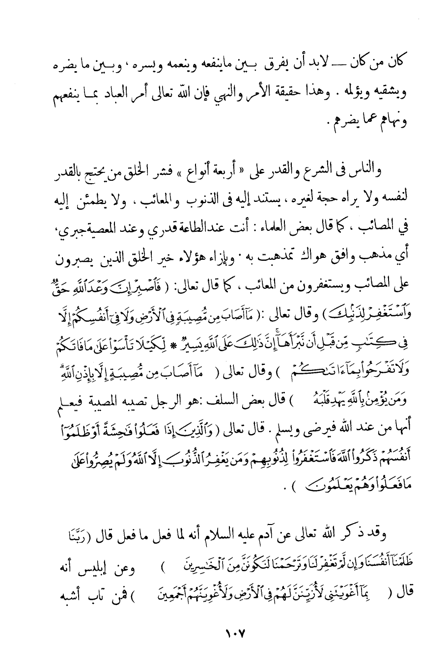 وَالنَّاسُ فِي الشَّرْعِ وَالْقَدَرِ عَلَى " أَرْبَعَةِ أَنْوَاعٍ " فَشَرُّ الْخَلْقِ مَنْ يَحْتَجُّ بِالْقَدَرِ لِنَفْسِهِ وَلَا يَرَاهُ حُجَّةً لِغَيْرِهِ يَسْتَنِدُ إلَيْهِ فِي الذُّنُوبِ والمعائب وَلَا يَطْمَئِنُّ إلَيْهِ فِي الْمَصَائِبِ كَمَا قَالَ بَعْضُ الْعُلَمَاءِ: أَنْتَ عِنْدَ الطَّاعَةِ قَدَرِيٌّ وَعِنْدَ الْمَعْصِيَةِ جَبْرِيٌّ أَيُّ مَذْهَبٍ وَافَقَ هَوَاك تَمَذْهَبْت بِهِ. وَبِإِزَاءِ هَؤُلَاءِ خَيْرُ الْخَلْقِ الَّذِينَ يَصْبِرُونَ عَلَى الْمَصَائِبِ وَيَسْتَغْفِرُونَ مِنْ المعائب كَمَا قَالَ تَعَالَى: {فَاصْبِرْ إنَّ وَعْدَ اللَّهِ حَقٌّ وَاسْتَغْفِرْ لِذَنْبِكَ} وَقَالَ تَعَالَى: {مَا أَصَابَ مِنْ مُصِيبَةٍ فِي الْأَرْضِ وَلَا فِي أَنْفُسِكُمْ إلَّا فِي كِتَابٍ مِنْ قَبْلِ أَنْ نَبْرَأَهَا إنَّ ذَلِكَ عَلَى اللَّهِ يَسِيرٌ} {لِكَيْ لَا تَأْسَوْا عَلَى مَا فَاتَكُمْ وَلَا تَفْرَحُوا بِمَا آتَاكُمْ} وَقَالَ تَعَالَى {مَا أَصَابَ مِنْ مُصِيبَةٍ إلَّا بِإِذْنِ اللَّهِ وَمَنْ يُؤْمِنْ بِاللَّهِ يَهْدِ قَلْبَهُ} قَالَ بَعْضُ السَّلَفِ: هُوَ الرَّجُلُ تُصِيبُهُ الْمُصِيبَةُ فَيَعْلَمُ أَنَّهَا مِنْ عِنْدِ اللَّهِ فَيَرْضَى وَيُسَلِّمُ. قَالَ تَعَالَى {وَالَّذِينَ إذَا فَعَلُوا فَاحِشَةً أَوْ ظَلَمُوا أَنْفُسَهُمْ ذَكَرُوا اللَّهَ فَاسْتَغْفَرُوا لِذُنُوبِهِمْ وَمَنْ يَغْفِرُ الذُّنُوبَ إلَّا اللَّهُ وَلَمْ يُصِرُّوا عَلَى مَا فَعَلُوا وَهُمْ يَعْلَمُونَ} . وَقَدْ ذَكَرَ اللَّهُ تَعَالَى عَنْ آدَمَ عَلَيْهِ السَّلَامُ أَنَّهُ لَمَّا فَعَلَ مَا فَعَلَ قَالَ {رَبَّنَا ظَلَمْنَا أَنْفُسَنَا وَإِنْ لَمْ تَغْفِرْ لَنَا وَتَرْحَمْنَا لَنَكُونَنَّ مِنَ الْخَاسِرِينَ} وَعَنْ إبْلِيسَ أَنَّهُ قَالَ {بِمَا أَغْوَيْتَنِي لَأُزَيِّنَنَّ لَهُمْ فِي الْأَرْضِ وَلَأُغْوِيَنَّهُمْ أَجْمَعِينَ} فَمَنْ تَابَ أَشْبَهَ