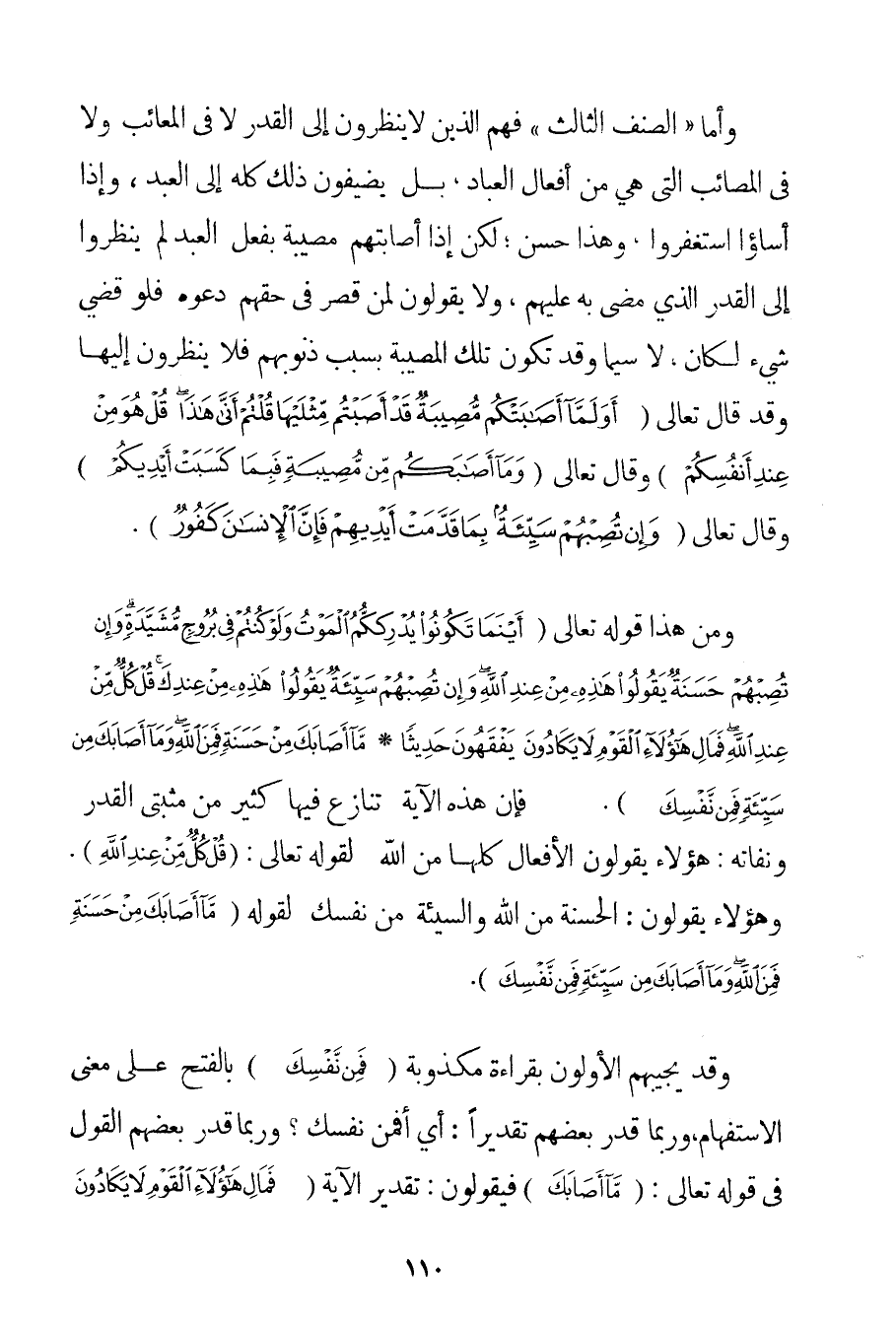 وَأَمَّا " الصِّنْفُ الثَّالِثُ " فَهُمْ الَّذِينَ لَا يَنْظُرُونَ إلَى الْقَدَرِ لَا فِي المعائب وَلَا فِي الْمَصَائِبِ الَّتِي هِيَ مِنْ أَفْعَالِ الْعِبَادِ بَلْ يُضِيفُونَ ذَلِكَ كُلَّهُ إلَى الْعَبْدِ وَإِذَا أَسَاءُوا اسْتَغْفَرُوا وَهَذَا حَسَنٌ؛ لَكِنْ إذَا أَصَابَتْهُمْ مُصِيبَةٌ بِفِعْلِ الْعَبْدِ لَمْ يَنْظُرُوا إلَى الْقَدَرِ الَّذِي مَضَى بِهِ عَلَيْهِمْ وَلَا يَقُولُونَ لِمَنْ قَصَّرَ فِي حَقِّهِمْ دَعُوهُ فَلَوْ قُضِيَ شَيْءٌ لَكَانَ لَا سِيَّمَا وَقَدْ تَكُونُ تِلْكَ الْمُصِيبَةُ بِسَبَبِ ذُنُوبِهِمْ فَلَا يَنْظُرُونَ إلَيْهَا وَقَدْ قَالَ تَعَالَى {أَوَلَمَّا أَصَابَتْكُمْ مُصِيبَةٌ قَدْ أَصَبْتُمْ مِثْلَيْهَا قُلْتُمْ أَنَّى هَذَا قُلْ هُوَ مِنْ عِنْدِ أَنْفُسِكُمْ} وَقَالَ تَعَالَى {وَمَا أَصَابَكُمْ مِنْ مُصِيبَةٍ فَبِمَا كَسَبَتْ أَيْدِيكُمْ} وَقَالَ تَعَالَى {وَإِنْ تُصِبْهُمْ سَيِّئَةٌ بِمَا قَدَّمَتْ أَيْدِيهِمْ فَإِنَّ الْإِنْسَانَ كَفُورٌ} . وَمِنْ هَذَا قَوْله تَعَالَى {أَيْنَمَا تَكُونُوا يُدْرِكُكُمُ الْمَوْتُ وَلَوْ كُنْتُمْ فِي بُرُوجٍ مُشَيَّدَةٍ وَإِنْ تُصِبْهُمْ حَسَنَةٌ يَقُولُوا هَذِهِ مِنْ عِنْدِ اللَّهِ وَإِنْ تُصِبْهُمْ سَيِّئَةٌ يَقُولُوا هَذِهِ مِنْ عِنْدِكَ قُلْ كُلٌّ مِنْ عِنْدِ اللَّهِ فَمَالِ هَؤُلَاءِ الْقَوْمِ لَا يَكَادُونَ يَفْقَهُونَ حَدِيثًا} {مَا أَصَابَكَ مِنْ حَسَنَةٍ فَمِنَ اللَّهِ وَمَا أَصَابَكَ مِنْ سَيِّئَةٍ فَمِنْ نَفْسِكَ} . فَإِنَّ هَذِهِ الْآيَةَ تَنَازَعَ فِيهَا كَثِيرٌ مِنْ مُثْبِتِي الْقَدَرِ ونفاته: هَؤُلَاءِ يَقُولُونَ الْأَفْعَالُ كُلُّهَا مِنْ اللَّهِ لِقَوْلِهِ تَعَالَى: {قُلْ كُلٌّ مِنْ عِنْدِ اللَّهِ} . وَهَؤُلَاءِ يَقُولُونَ: الْحَسَنَةُ مِنْ اللَّهِ وَالسَّيِّئَةُ مِنْ نَفْسِك لِقَوْلِهِ {مَا أَصَابَكَ مِنْ حَسَنَةٍ فَمِنَ اللَّهِ وَمَا أَصَابَكَ مِنْ سَيِّئَةٍ فَمِنْ نَفْسِكَ} . وَقَدْ يُجِيبُهُمْ الْأَوَّلُونَ بِقِرَاءَةِ مَكْذُوبَةٍ {فَمِنْ نَفْسِكَ} بِالْفَتْحِ عَلَى مَعْنَى الِاسْتِفْهَامِ وَرُبَّمَا قَدَّرَ بَعْضُهُمْ تَقْدِيرًا: أَيْ أَفَمِنْ نَفْسِك؟ وَرُبَّمَا قَدَّرَ بَعْضُهُمْ الْقَوْلَ فِي قَوْله تَعَالَى {مَا أَصَابَكَ} فَيَقُولُونَ: تَقْدِيرُ الْآيَةِ {فَمَالِ هَؤُلَاءِ الْقَوْمِ لَا يَكَادُونَ