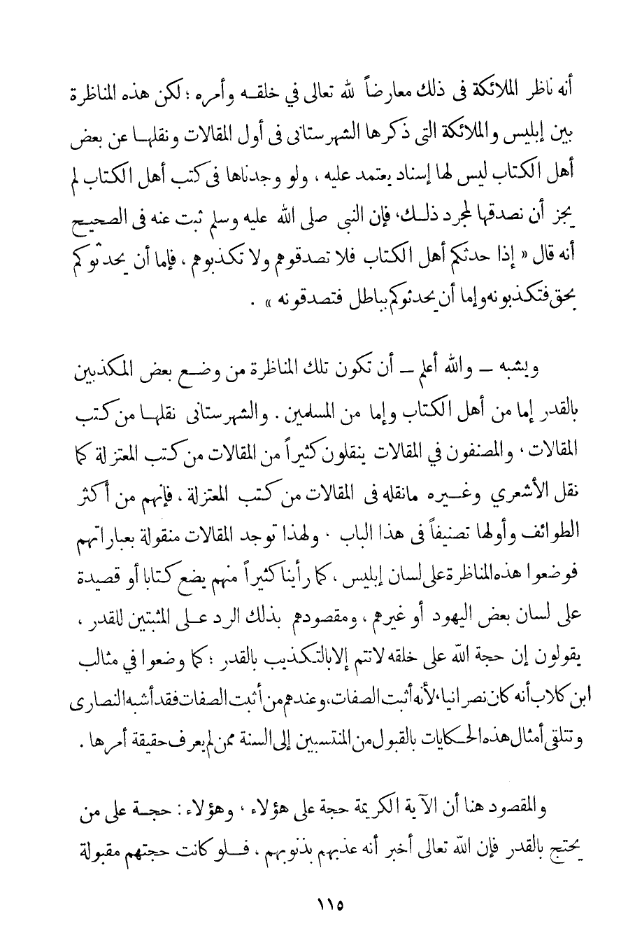 أَنَّهُ نَاظَرَ الْمَلَائِكَةَ فِي ذَلِكَ مُعَارِضًا لِلَّهِ تَعَالَى فِي خَلْقِهِ وَأَمْرِهِ؛ لَكِنَّ هَذِهِ الْمُنَاظَرَةَ بَيْنَ إبْلِيسَ وَالْمَلَائِكَةِ الَّتِي ذَكَرَهَا الشِّهْرِسْتَانِيّ فِي أَوَّلِ الْمَقَالَاتِ وَنَقَلَهَا عَنْ بَعْضِ أَهْلِ الْكِتَابِ لَيْسَ لَهَا إسْنَادٌ يُعْتَمَدُ عَلَيْهِ وَلَوْ وَجَدْنَاهَا فِي كُتُبِ أَهْلِ الْكِتَابِ لَمْ يَجُزْ أَنْ نُصَدِّقَهَا لِمُجَرَّدِ ذَلِكَ فَإِنَّ النَّبِيَّ صَلَّى اللَّهُ عَلَيْهِ وَسَلَّمَ ثَبَتَ عَنْهُ فِي الصَّحِيحِ أَنَّهُ قَالَ {إذَا حَدَّثَكُمْ أَهْلُ الْكِتَابِ فَلَا تُصَدِّقُوهُمْ وَلَا تُكَذِّبُوهُمْ فَإِمَّا أَنْ يُحَدِّثُوكُمْ بِحَقِّ فَتُكَذِّبُونَهُ وَإِمَّا أَنْ يُحَدِّثُوكُمْ بِبَاطِلِ فَتُصَدِّقُونَهُ} . وَيُشْبِهُ - وَاَللَّهُ أَعْلَمُ - أَنْ تَكُونَ تِلْكَ الْمُنَاظَرَةُ مِنْ وَضْعِ بَعْضِ الْمُكَذِّبِينَ بِالْقَدَرِ إمَّا مِنْ أَهْلِ الْكِتَابِ وَإِمَّا مِنْ الْمُسْلِمِينَ. والشَّهْرَستَانِي نَقَلَهَا مِنْ كُتُبِ الْمَقَالَاتِ وَالْمُصَنِّفُونَ فِي الْمَقَالَاتِ يَنْقُلُونَ كَثِيرًا مِنْ الْمَقَالَاتِ مِنْ كُتُبِ الْمُعْتَزِلَةِ كَمَا نَقَلَ الْأَشْعَرِيُّ وَغَيْرُهُ مَا نَقَلَهُ فِي الْمَقَالَاتِ مِنْ كُتُبِ الْمُعْتَزِلَةِ فَإِنَّهُمْ مِنْ أَكْثَرِ الطَّوَائِفِ وَأَوَّلِهَا تَصْنِيفًا فِي هَذَا الْبَابِ وَلِهَذَا تُوجَدُ الْمَقَالَاتُ مَنْقُولَةً بِعِبَارَاتِهِمْ فَوَضَعُوا هَذِهِ الْمُنَاظَرَةَ عَلَى لِسَانِ إبْلِيسَ كَمَا رَأَيْنَا كَثِيرًا مِنْهُمْ يَضَعُ كِتَابًا أَوْ قَصِيدَةً عَلَى لِسَانِ بَعْضِ الْيَهُودِ أَوْ غَيْرِهِمْ وَمَقْصُودُهُمْ بِذَلِكَ الرَّدُّ عَلَى الْمُثْبِتِينَ لِلْقَدَرِ يَقُولُونَ إنَّ حُجَّةَ اللَّهِ عَلَى خَلْقِهِ لَا تَتِمُّ إلَّا بِالتَّكْذِيبِ بِالْقَدَرِ؛ كَمَا وَضَعُوا فِي مَثَالِبِ ابْنِ كُلَّابٍ أَنَّهُ كَانَ نَصْرَانِيًّا لِأَنَّهُ أَثْبَتَ الصِّفَاتِ وَعِنْدَهُمْ مَنْ أَثْبَتَ الصِّفَاتِ فَقَدْ أَشْبَهَ النَّصَارَى وَتُتَلَقَّى أَمْثَالُ هَذِهِ الْحِكَايَاتِ بِالْقَبُولِ مِنْ الْمُنْتَسِبِينَ إلَى السُّنَّةِ مِمَّنْ لَمْ يَعْرِفْ حَقِيقَةَ أَمْرِهَا. وَالْمَقْصُودُ هُنَا أَنَّ الْآيَةَ الْكَرِيمَةَ حُجَّةٌ عَلَى هَؤُلَاءِ وَهَؤُلَاءِ: حُجَّةٌ عَلَى مَنْ يَحْتَجُّ بِالْقَدَرِ فَإِنَّ اللَّهَ تَعَالَى أَخْبَرَ أَنَّهُ عَذَّبَهُمْ بِذُنُوبِهِمْ فَلَوْ كَانَتْ حُجَّتُهُمْ مَقْبُولَةً