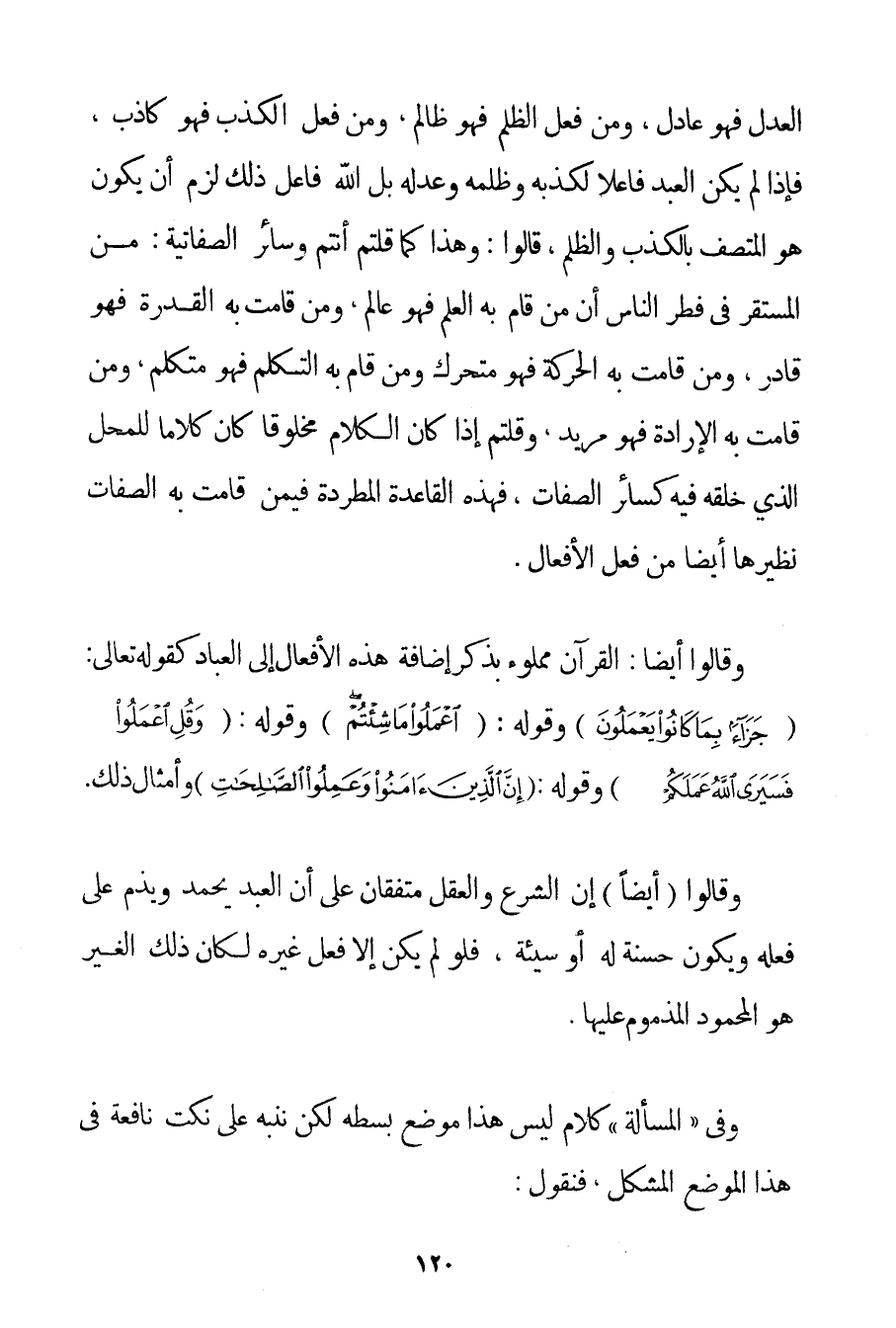 الْعَدْلَ فَهُوَ عَادِلٌ وَمَنْ فَعَلَ الظُّلْمَ فَهُوَ ظَالِمٌ وَمَنْ فَعَلَ الْكَذِبَ فَهُوَ كَاذِبٌ فَإِذَا لَمْ يَكُنْ الْعَبْدُ فَاعِلًا لِكَذِبِهِ وَظُلْمِهِ وَعَدْلِهِ بَلْ اللَّهُ فَاعِلٌ ذَلِكَ لَزِمَ أَنْ يَكُونَ هُوَ الْمُتَّصِفَ بِالْكَذِبِ وَالظُّلْمِ قَالُوا: وَهَذَا كَمَا قُلْتُمْ أَنْتُمْ وَسَائِرُ الصفاتية: مِنْ الْمُسْتَقِرِّ فِي فِطَرِ النَّاسِ أَنَّ مَنْ قَامَ بِهِ الْعِلْمُ فَهُوَ عَالِمٌ وَمَنْ قَامَتْ بِهِ الْقُدْرَةُ فَهُوَ قَادِرٌ وَمَنْ قَامَتْ بِهِ الْحَرَكَةُ فَهُوَ مُتَحَرِّكٌ وَمَنْ قَامَ بِهِ التَّكَلُّمُ فَهُوَ مُتَكَلِّمٌ وَمَنْ قَامَتْ بِهِ الْإِرَادَةُ فَهُوَ مُرِيدٌ وَقُلْتُمْ إذَا كَانَ الْكَلَامُ مَخْلُوقًا كَانَ كَلَامًا لِلْمَحَلِّ الَّذِي خَلَقَهُ فِيهِ كَسَائِرِ الصِّفَاتِ فَهَذِهِ الْقَاعِدَةُ الْمُطَّرِدَةُ فِيمَنْ قَامَتْ بِهِ الصِّفَاتُ نَظِيرُهَا أَيْضًا مَنْ فَعَلَ الْأَفْعَالَ. وَقَالُوا أَيْضًا: الْقُرْآنُ مَمْلُوءٌ بِذِكْرِ إضَافَةِ هَذِهِ الْأَفْعَالِ إلَى الْعِبَادِ كَقَوْلِهِ تَعَالَى: {جَزَاءً بِمَا كَانُوا يَعْمَلُونَ} وَقَوْلِهِ: {اعْمَلُوا مَا شِئْتُمْ} وَقَوْلِهِ: {وَقُلِ اعْمَلُوا فَسَيَرَى اللَّهُ عَمَلَكُمْ} وَقَوْلِهِ: {إنَّ الَّذِينَ آمَنُوا وَعَمِلُوا الصَّالِحَاتِ} وَأَمْثَالِ ذَلِكَ. وَقَالُوا (أَيْضًا إنَّ الشَّرْعَ وَالْعَقْلَ مُتَّفِقَانِ عَلَى أَنَّ الْعَبْدَ يُحْمَدُ وَيُذَمُّ عَلَى فِعْلِهِ وَيَكُونُ حَسَنَةً لَهُ أَوْ سَيِّئَةً فَلَوْ لَمْ يَكُنْ إلَّا فِعْلُ غَيْرِهِ لَكَانَ ذَلِكَ الْغَيْرُ هُوَ الْمَحْمُودَ الْمَذْمُومَ عَلَيْهَا. وَفِي " الْمَسْأَلَةِ " كَلَامٌ لَيْسَ هَذَا مَوْضِعَ بَسْطِهِ لَكِنْ نُنَبِّهُ عَلَى نُكَتٍ نَافِعَةٍ فِي هَذَا الْمَوْضِعِ الْمُشْكِلِ فَنَقُولُ: