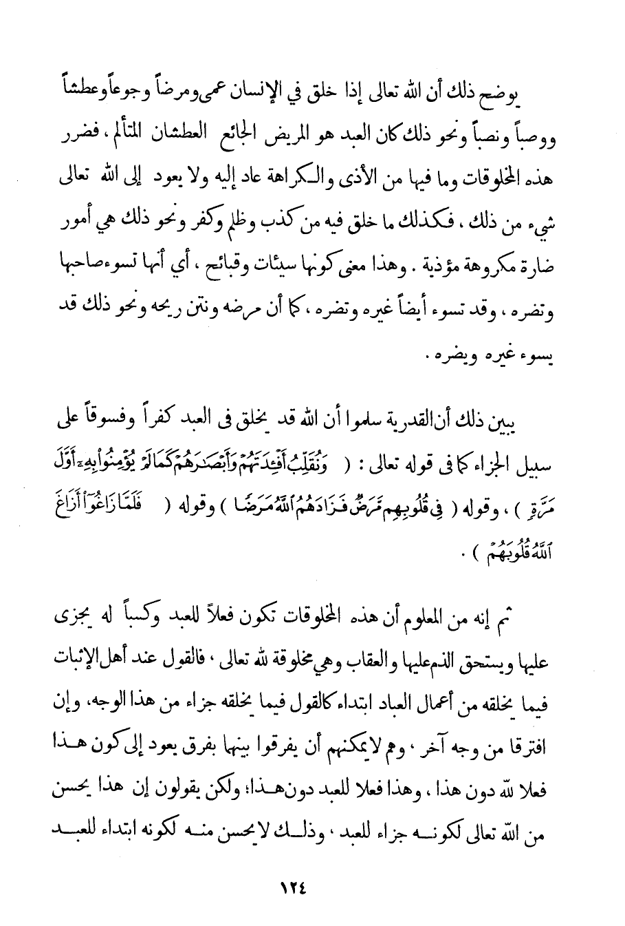 يُوَضِّحُ ذَلِكَ أَنَّ اللَّهَ تَعَالَى إذَا خَلَقَ فِي الْإِنْسَانِ عَمًى وَمَرَضًا وَجُوعًا وَعَطَشًا وَوَصَبًا وَنَصَبًا وَنَحْوَ ذَلِكَ كَانَ الْعَبْدُ هُوَ الْمَرِيضَ الْجَائِعَ الْعَطْشَانَ الْمُتَأَلِّمَ فَضَرَرُ هَذِهِ الْمَخْلُوقَاتِ وَمَا فِيهَا مِنْ الْأَذَى وَالْكَرَاهَةِ عَادَ إلَيْهِ وَلَا يَعُودُ إلَى اللَّهِ تَعَالَى شَيْءٌ مِنْ ذَلِكَ فَكَذَلِكَ مَا خَلَقَ فِيهِ مِنْ كَذِبٍ وَظُلْمٍ وَكُفْرٍ وَنَحْوِ ذَلِكَ هِيَ أُمُورٌ ضَارَّةٌ مَكْرُوهَةٌ مُؤْذِيَةٌ. وَهَذَا مَعْنَى كَوْنِهَا سَيِّئَاتٍ وَقَبَائِحَ أَيْ أَنَّهَا تَسُوءُ صَاحِبَهَا وَتَضُرُّهُ وَقَدْ تَسُوءُ أَيْضًا غَيْرَهُ وَتَضُرُّهُ كَمَا أَنَّ مَرَضَهُ وَنَتَنَ رِيحِهِ وَنَحْوَ ذَلِكَ قَدْ يَسُوءُ غَيْرَهُ وَيَضُرُّهُ. يُبَيِّنُ ذَلِكَ أَنَّ الْقَدَرِيَّةَ سَلَّمُوا أَنَّ اللَّهَ قَدْ يَخْلُقُ فِي الْعَبْدِ كُفْرًا وَفُسُوقًا عَلَى سَبِيلِ الْجَزَاءِ كَمَا فِي قَوْله تَعَالَى {وَنُقَلِّبُ أَفْئِدَتَهُمْ وَأَبْصَارَهُمْ كَمَا لَمْ يُؤْمِنُوا بِهِ أَوَّلَ مَرَّةٍ} وَقَوْلِهِ {فِي قُلُوبِهِمْ مَرَضٌ فَزَادَهُمُ اللَّهُ مَرَضًا} وَقَوْلِهِ {فَلَمَّا زَاغُوا أَزَاغَ اللَّهُ قُلُوبَهُمْ} . ثُمَّ إنَّهُ مِنْ الْمَعْلُومِ أَنَّ هَذِهِ الْمَخْلُوقَاتِ تَكُونُ فِعْلًا لِلْعَبْدِ وَكَسْبًا لَهُ يُجْزَى عَلَيْهَا وَيَسْتَحِقُّ الذَّمَّ عَلَيْهَا وَالْعِقَابَ وَهِيَ مَخْلُوقَةٌ لِلَّهِ تَعَالَى فَالْقَوْلُ عِنْدَ أَهْلِ الْإِثْبَاتِ فِيمَا يَخْلُقُهُ مِنْ أَعْمَالِ الْعِبَادِ ابْتِدَاءً كَالْقَوْلِ فِيمَا يَخْلُقُهُ جَزَاءً مِنْ هَذَا الْوَجْهِ وَإِنْ افْتَرَقَا مِنْ وَجْهٍ آخَرَ وَهُمْ لَا يُمْكِنُهُمْ أَنْ يُفَرِّقُوا بَيْنَهُمَا بِفَرْقِ يَعُودُ إلَى كَوْنِ هَذَا فِعْلًا لِلَّهِ دُونَ هَذَا وَهَذَا فِعْلًا لِلْعَبْدِ دُونَ هَذَا؛ وَلَكِنْ يَقُولُونَ إنَّ هَذَا يَحْسُنُ مِنْ اللَّهِ تَعَالَى لِكَوْنِهِ جَزَاءً لِلْعَبْدِ وَذَلِكَ لَا يَحْسُنُ مِنْهُ لِكَوْنِهِ ابْتِدَاءً لِلْعَبْدِ