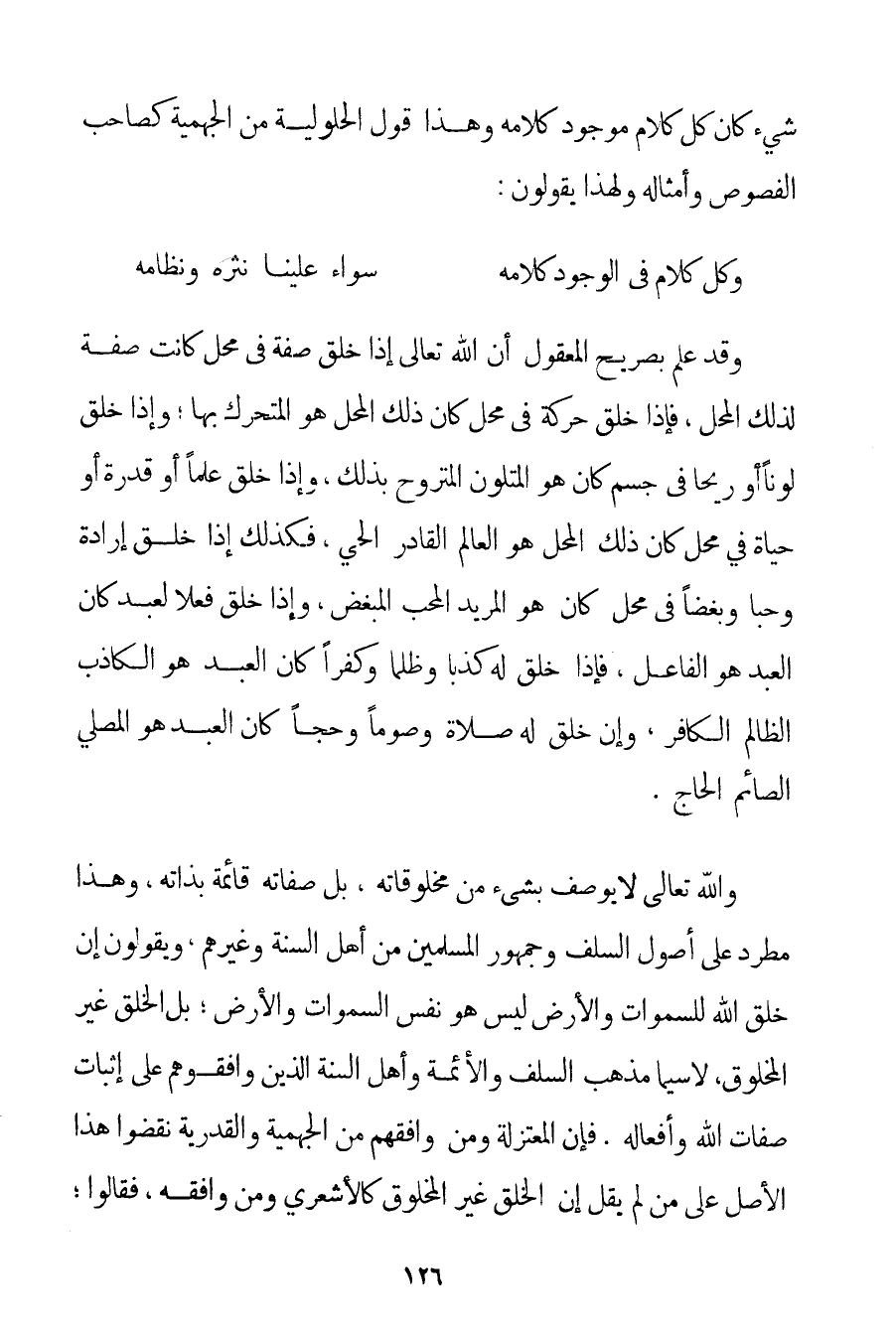 شَيْءٍ كَانَ كُلُّ كَلَامٍ مَوْجُودٍ كَلَامَهُ وَهَذَا قَوْلُ الْحُلُولِيَّةِ مِنْ الْجَهْمِيَّة كَصَاحِبِ الْفُصُوصِ وَأَمْثَالِهِ وَلِهَذَا يَقُولُونَ: وَكُلُّ كَلَامٍ فِي الْوُجُودِ كَلَامُهُ ... سَوَاءٌ عَلَيْنَا نَثْرُهُ وَنِظَامُهُ
