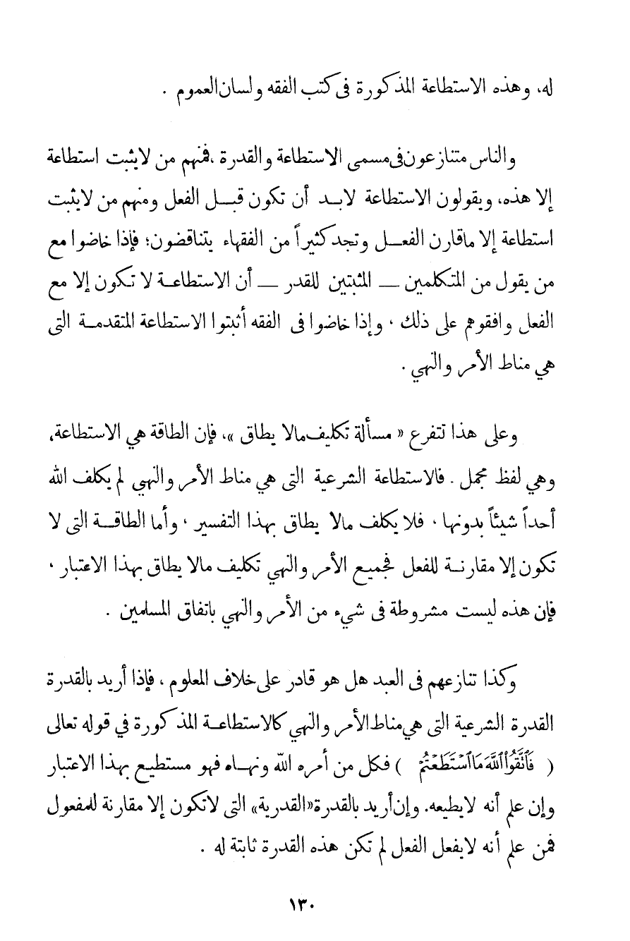 وَالنَّاسُ مُتَنَازِعُونَ فِي مُسَمَّى الِاسْتِطَاعَةِ وَالْقُدْرَةِ فَمِنْهُمْ مَنْ لَا يُثْبِتُ اسْتِطَاعَةً إلَّا هَذِهِ وَيَقُولُونَ الِاسْتِطَاعَةُ لَا بُدَّ أَنْ تَكُونَ قَبْلَ الْفِعْلِ وَمِنْهُمْ مَنْ لَا يُثْبِتُ اسْتِطَاعَةً إلَّا مَا قَارَنَ الْفِعْلَ وَتَجِدُ كَثِيرًا مِنْ الْفُقَهَاءِ يَتَنَاقَضُونَ؛ فَإِذَا خَاضُوا مَعَ مَنْ يَقُولُ مِنْ الْمُتَكَلِّمِينَ - الْمُثْبِتِينَ لِلْقَدَرِ - أَنَّ الِاسْتِطَاعَةَ لَا تَكُونُ إلَّا مَعَ الْفِعْلِ وَافَقُوهُمْ عَلَى ذَلِكَ وَإِذَا خَاضُوا فِي الْفِقْهِ أَثْبَتُوا الِاسْتِطَاعَةَ الْمُتَقَدِّمَةَ الَّتِي هِيَ مَنَاطُ الْأَمْرِ وَالنَّهْيِ. وَعَلَى هَذَا تَتَفَرَّعُ " مَسْأَلَةُ تَكْلِيفِ مَا لَا يُطَاقُ " فَإِنَّ الطَّاقَةَ هِيَ الِاسْتِطَاعَةُ وَهِيَ لَفْظٌ مُجْمَلٌ. فَالِاسْتِطَاعَةُ الشَّرْعِيَّةُ الَّتِي هِيَ مَنَاطُ الْأَمْرِ وَالنَّهْيِ لَمْ يُكَلِّفْ اللَّهُ أَحَدًا شَيْئًا بِدُونِهَا فَلَا يُكَلِّفُ مَا لَا يُطَاقُ بِهَذَا التَّفْسِيرِ وَأَمَّا الطَّاقَةُ الَّتِي لَا تَكُونُ إلَّا مُقَارِنَةً لِلْفِعْلِ فَجَمِيعُ الْأَمْرِ وَالنَّهْيِ تَكْلِيفُ مَا لَا يُطَاقُ بِهَذَا الِاعْتِبَارِ فَإِنَّ هَذِهِ لَيْسَتْ مَشْرُوطَةً فِي شَيْءٍ مِنْ الْأَمْرِ وَالنَّهْيِ بِاتِّفَاقِ الْمُسْلِمِينَ. وَكَذَا تَنَازُعُهُمْ فِي الْعَبْدِ هَلْ هُوَ قَادِرٌ عَلَى خِلَافِ الْمَعْلُومِ فَإِذَا أُرِيدَ بِالْقُدْرَةِ الْقُدْرَةُ الشَّرْعِيَّةُ الَّتِي هِيَ مَنَاطُ الْأَمْرِ وَالنَّهْيِ كَالِاسْتِطَاعَةِ الْمَذْكُورَةِ فِي قَوْله تَعَالَى {فَاتَّقُوا اللَّهَ مَا اسْتَطَعْتُمْ} فَكُلُّ مَنْ أَمَرَهُ اللَّهُ وَنَهَاهُ فَهُوَ مُسْتَطِيعٌ بِهَذَا الِاعْتِبَارِ وَإِنْ عَلِمَ أَنَّهُ لَا يُطِيعُهُ. وَإِنْ أُرِيدَ بِالْقُدْرَةِ " الْقَدَرِيَّةِ " الَّتِي لَا تَكُونُ إلَّا مُقَارِنَةً لِلْمَفْعُولِ فَمَنْ عَلِمَ أَنَّهُ لَا يَفْعَلُ الْفِعْلَ لَمْ تَكُنْ هَذِهِ الْقُدْرَةُ ثَابِتَةً لَهُ.