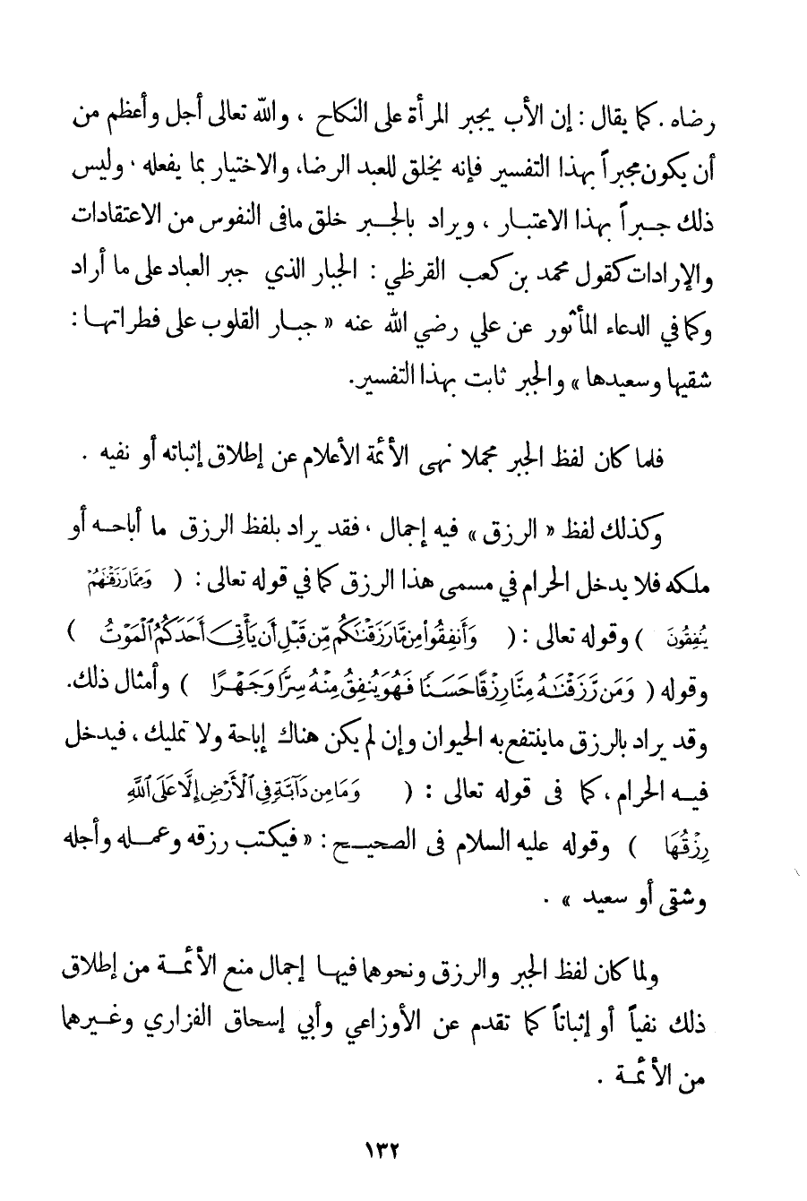 رِضَاهُ كَمَا يُقَالُ: إنَّ الْأَبَ يُجْبِرُ الْمَرْأَةَ عَلَى النِّكَاحِ وَاَللَّهُ تَعَالَى أَجَلُّ وَأَعْظَمُ مِنْ أَنْ يَكُونَ مُجْبِرًا بِهَذَا التَّفْسِيرِ فَإِنَّهُ يَخْلُقُ لِلْعَبْدِ الرِّضَا وَالِاخْتِيَارَ بِمَا يَفْعَلُهُ وَلَيْسَ ذَلِكَ جَبْرًا بِهَذَا الِاعْتِبَارِ وَيُرَادُ بِالْجَبْرِ خَلْقُ مَا فِي النُّفُوسِ مِنْ الِاعْتِقَادَاتِ وَالْإِرَادَاتِ كَقَوْلِ مُحَمَّدِ بْنِ كَعْبٍ القرظي: الْجَبَّارُ الَّذِي جَبَرَ الْعِبَادَ عَلَى مَا أَرَادَ وَكَمَا فِي الدُّعَاءِ الْمَأْثُورِ عَنْ عَلِيٍّ رَضِيَ اللَّهُ عَنْهُ " جَبَّارُ الْقُلُوبِ عَلَى فِطْرَاتِهَا: شَقِيِّهَا وَسَعِيدِهَا " وَالْجَبْرُ ثَابِتٌ بِهَذَا التَّفْسِيرِ. فَلَمَّا كَانَ لَفْظُ الْجَبْرِ مُجْمَلًا نَهَى الْأَئِمَّةُ الْأَعْلَامُ عَنْ إطْلَاقِ إثْبَاتِهِ أَوْ نَفْيِهِ. وَكَذَلِكَ لَفْظُ " الرِّزْقِ " فِيهِ إجْمَالٌ فَقَدْ يُرَادُ بِلَفْظِ الرِّزْقِ مَا أَبَاحَهُ أَوْ مَلَّكَهُ فَلَا يَدْخُلُ الْحَرَامُ فِي مُسَمَّى هَذَا الرِّزْقِ كَمَا فِي قَوْله تَعَالَى {وَمِمَّا رَزَقْنَاهُمْ يُنْفِقُونَ} وقَوْله تَعَالَى {وَأَنْفِقُوا مِنْ مَا رَزَقْنَاكُمْ مِنْ قَبْلِ أَنْ يَأْتِيَ أَحَدَكُمُ الْمَوْتُ} وَقَوْلُهُ {وَمَنْ رَزَقْنَاهُ مِنَّا رِزْقًا حَسَنًا فَهُوَ يُنْفِقُ مِنْهُ سِرًّا وَجَهْرًا} وَأَمْثَالُ ذَلِكَ. وَقَدْ يُرَادُ بِالرِّزْقِ مَا يَنْتَفِعُ بِهِ الْحَيَوَانُ وَإِنْ لَمْ يَكُنْ هُنَاكَ إبَاحَةٌ وَلَا تَمْلِيكٌ فَيَدْخُلُ فِيهِ الْحَرَامُ كَمَا فِي قَوْله تَعَالَى {وَمَا مِنْ دَابَّةٍ فِي الْأَرْضِ إلَّا عَلَى اللَّهِ رِزْقُهَا} وَقَوْلِهِ عَلَيْهِ السَّلَامُ فِي الصَّحِيحِ: {فَيُكْتَبُ رِزْقُهُ وَعَمَلُهُ وَأَجَلُهُ وَشَقِيٌّ أَوْ سَعِيدٌ} . وَلَمَّا كَانَ لَفْظُ الْجَبْرِ وَالرِّزْقِ وَنَحْوِهِمَا فِيهَا إجْمَالٌ مَنَعَ الْأَئِمَّةُ مِنْ إطْلَاقِ ذَلِكَ نَفْيًا أَوْ إثْبَاتًا كَمَا تَقَدَّمَ عَنْ الأوزاعي وَأَبِي إسْحَاقَ الفزاري وَغَيْرِهِمَا مِنْ الْأَئِمَّةِ.
