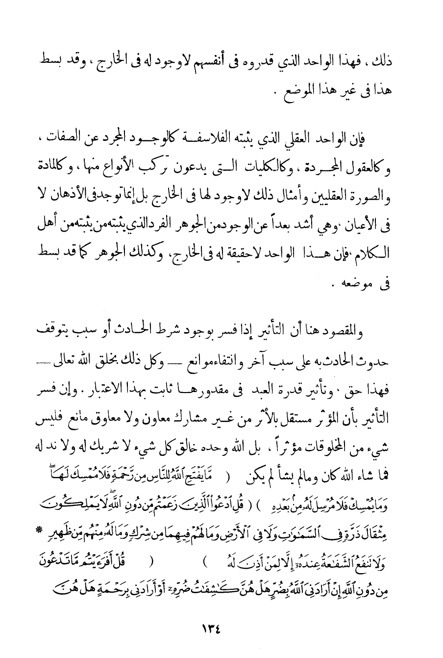 ذَلِكَ فَهَذَا الْوَاحِدُ الَّذِي قَدَّرُوهُ فِي أَنْفُسِهِمْ لَا وُجُودَ لَهُ فِي الْخَارِجِ وَقَدْ بُسِطَ هَذَا فِي غَيْرِ هَذَا الْمَوْضِعِ. فَإِنَّ الْوَاحِدَ الْعَقْلِيَّ الَّذِي يُثْبِتُهُ الْفَلَاسِفَةُ كَالْوُجُودِ الْمُجَرَّدِ عَنْ الصِّفَاتِ وَكَالْعُقُولِ الْمُجَرَّدَةِ وَكَالْكُلِّيَّاتِ الَّتِي يَدَّعُونَ تَرَكُّبَ الْأَنْوَاعِ مِنْهَا وَكَالْمَادَّةِ وَالصُّورَةِ الْعَقْلِيَّيْنِ وَأَمْثَالِ ذَلِكَ لَا وُجُودَ لَهَا فِي الْخَارِجِ بَلْ إنَّمَا تُوجَدُ فِي الْأَذْهَانِ لَا فِي الْأَعْيَانِ وَهِيَ أَشَدُّ بُعْدًا عَنْ الْوُجُودِ مِنْ الْجَوْهَرِ الْفَرْدِ الَّذِي يُثْبِتُهُ مَنْ يُثْبِتُهُ مِنْ أَهْلِ الْكَلَامِ فَإِنَّ هَذَا الْوَاحِدَ لَا حَقِيقَةَ لَهُ فِي الْخَارِجِ وَكَذَلِكَ الْجَوْهَرُ كَمَا قَدْ بُسِطَ فِي مَوْضِعِهِ. وَالْمَقْصُودُ هُنَا أَنَّ التَّأْثِيرَ إذَا فُسِّرَ بِوُجُودِ شَرْطِ الْحَادِثِ أَوْ سَبَبٍ يَتَوَقَّفُ حُدُوثُ الْحَادِثِ بِهِ عَلَى سَبَبٍ آخَرَ وَانْتِفَاءِ مَوَانِعَ - وَكُلُّ ذَلِكَ بِخَلْقِ اللَّهِ تَعَالَى - فَهَذَا حَقٌّ وَتَأْثِيرُ قُدْرَةِ الْعَبْدِ فِي مَقْدُورِهَا ثَابِتٌ بِهَذَا الِاعْتِبَارِ. وَإِنْ فُسِّرَ التَّأْثِيرُ بِأَنَّ الْمُؤَثِّرَ مُسْتَقِلٌّ بِالْأَثَرِ مِنْ غَيْرِ مُشَارِكٍ مُعَاوِنٍ وَلَا مُعَاوِقٍ مَانِعٍ فَلَيْسَ شَيْءٌ مِنْ الْمَخْلُوقَاتِ مُؤَثِّرًا بَلْ اللَّهُ وَحْدَهُ خَالِقُ كُلِّ شَيْءٍ لَا شَرِيكَ لَهُ وَلَا نِدَّ لَهُ فَمَا شَاءَ اللَّهُ كَانَ وَمَا لَمْ يَشَأْ لَمْ يَكُنْ {مَا يَفْتَحِ اللَّهُ لِلنَّاسِ مِنْ رَحْمَةٍ فَلَا مُمْسِكَ لَهَا وَمَا يُمْسِكْ فَلَا مُرْسِلَ لَهُ مِنْ بَعْدِهِ} {قُلِ ادْعُوا الَّذِينَ زَعَمْتُمْ مِنْ دُونِ اللَّهِ لَا يَمْلِكُونَ مِثْقَالَ ذَرَّةٍ فِي السَّمَاوَاتِ وَلَا فِي الْأَرْضِ وَمَا لَهُمْ فِيهِمَا مِنْ شِرْكٍ وَمَا لَهُ مِنْهُمْ مِنْ ظَهِيرٍ} {وَلَا تَنْفَعُ الشَّفَاعَةُ عِنْدَهُ إلَّا لِمَنْ أَذِنَ لَهُ} {قُلْ أَفَرَأَيْتُمْ مَا تَدْعُونَ مِنْ دُونِ اللَّهِ إنْ أَرَادَنِيَ اللَّهُ بِضُرٍّ هَلْ هُنَّ كَاشِفَاتُ ضُرِّهِ أَوْ أَرَادَنِي بِرَحْمَةٍ هَلْ هُنَّ