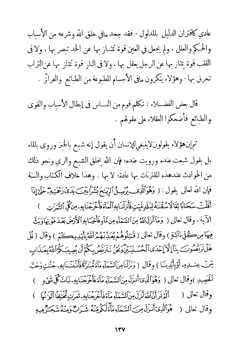 عَادِيٍّ كَاقْتِرَانِ الدَّلِيلِ بِالْمَدْلُولِ فَقَدْ جَحَدَ مَا فِي خَلْقِ اللَّهِ وَشَرْعِهِ مِنْ الْأَسْبَابِ وَالْحِكَمِ وَالْعِلَلِ وَلَمْ يَجْعَلْ فِي الْعَيْنِ قُوَّةً تَمْتَازُ بِهَا عَنْ الْخَدِّ تُبْصِرُ بِهَا وَلَا فِي الْقَلْبِ قُوَّةً يَمْتَازُ بِهَا عَنْ الرَّجُلِ يَعْقِلُ بِهَا وَلَا فِي النَّارِ قُوَّةً تَمْتَازُ بِهَا عَنْ التُّرَابِ تُحْرِقُ بِهَا وَهَؤُلَاءِ يُنْكِرُونَ مَا فِي الْأَجْسَامِ الْمَطْبُوعَةِ مِنْ الطَّبَائِعِ وَالْغَرَائِزِ. قَالَ بَعْضُ الْفُضَلَاءِ: تَكَلَّمَ قَوْمٌ مِنْ النَّاسِ فِي إبْطَالِ الْأَسْبَابِ وَالْقُوَى وَالطَّبَائِعِ فَأَضْحَكُوا الْعُقَلَاءَ عَلَى عُقُولِهِمْ. ثُمَّ إنَّ هَؤُلَاءِ يَقُولُونَ لَا يَنْبَغِي لِلْإِنْسَانِ أَنْ يَقُولَ إنَّهُ شَبِعَ بِالْخُبْزِ وَرُوِيَ بِالْمَاءِ بَلْ يَقُولُ شَبِعْت عِنْدَهُ وَرُوِيت عِنْدَهُ؛ فَإِنَّ اللَّهَ يَخْلُقُ الشِّبَعَ وَالرِّيَّ وَنَحْوَ ذَلِكَ مِنْ الْحَوَادِثِ عِنْدَ هَذِهِ الْمُقْتَرِنَاتِ بِهَا عَادَةً؛ لَا بِهَا. وَهَذَا خِلَافُ الْكِتَابِ وَالسُّنَّةِ فَإِنَّ اللَّهَ تَعَالَى يَقُولُ: {وَهُوَ الَّذِي يُرْسِلُ الرِّيَاحَ بُشْرًا بَيْنَ يَدَيْ رَحْمَتِهِ حَتَّى إذَا أَقَلَّتْ سَحَابًا ثِقَالًا سُقْنَاهُ لِبَلَدٍ مَيِّتٍ فَأَنْزَلْنَا بِهِ الْمَاءَ فَأَخْرَجْنَا بِهِ مِنْ كُلِّ الثَّمَرَاتِ} الْآيَةَ وَقَالَ تَعَالَى {وَمَا أَنْزَلَ اللَّهُ مِنَ السَّمَاءِ مِنْ مَاءٍ فَأَحْيَا بِهِ الْأَرْضَ بَعْدَ مَوْتِهَا وَبَثَّ فِيهَا مِنْ كُلِّ دَابَّةٍ} وَقَالَ تَعَالَى {قَاتِلُوهُمْ يُعَذِّبْهُمُ اللَّهُ بِأَيْدِيكُمْ} وَقَالَ {قُلْ هَلْ تَرَبَّصُونَ بِنَا إلَّا إحْدَى الْحُسْنَيَيْنِ وَنَحْنُ نَتَرَبَّصُ بِكُمْ أَنْ يُصِيبَكُمُ اللَّهُ بِعَذَابٍ مِنْ عِنْدِهِ أَوْ بِأَيْدِينَا} وَقَالَ {وَنَزَّلْنَا مِنَ السَّمَاءِ مَاءً مُبَارَكًا فَأَنْبَتْنَا بِهِ جَنَّاتٍ وَحَبَّ الْحَصِيدِ} وَقَالَ تَعَالَى {وَهُوَ الَّذِي أَنْزَلَ مِنَ السَّمَاءِ مَاءً فَأَخْرَجْنَا بِهِ نَبَاتَ كُلِّ شَيْءٍ} وَقَالَ تَعَالَى {أَلَمْ تَرَ أَنَّ اللَّهَ أَنْزَلَ مِنَ السَّمَاءِ مَاءً فَأَخْرَجْنَا بِهِ ثَمَرَاتٍ مُخْتَلِفًا أَلْوَانُهَا} وَقَالَ تَعَالَى {هُوَ الَّذِي أَنْزَلَ مِنَ السَّمَاءِ مَاءً لَكُمْ مِنْهُ شَرَابٌ وَمِنْهُ شَجَرٌ فِيهِ