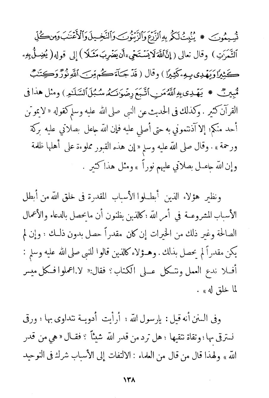 تُسِيمُونَ} {يُنْبِتُ لَكُمْ بِهِ الزَّرْعَ وَالزَّيْتُونَ وَالنَّخِيلَ وَالْأَعْنَابَ وَمِنْ كُلِّ الثَّمَرَاتِ} وَقَالَ تَعَالَى {إنَّ اللَّهَ لَا يَسْتَحْيِي أَنْ يَضْرِبَ مَثَلًا} - إلَى قَوْلِهِ - {يُضِلُّ بِهِ كَثِيرًا وَيَهْدِي بِهِ كَثِيرًا} وَقَالَ {قَدْ جَاءَكُمْ مِنَ اللَّهِ نُورٌ وَكِتَابٌ مُبِينٌ} {يَهْدِي بِهِ اللَّهُ مَنِ اتَّبَعَ رِضْوَانَهُ سُبُلَ السَّلَامِ} وَمِثْلُ هَذَا فِي الْقُرْآنِ كَثِيرٌ. وَكَذَلِكَ فِي الْحَدِيثِ عَنْ النَّبِيِّ صَلَّى اللَّهُ عَلَيْهِ وَسَلَّمَ كَقَوْلِهِ {لَا يَمُوتَنَّ أَحَدٌ مِنْكُمْ؛ إلَّا آذَنْتُمُونِي بِهِ حَتَّى أُصَلِّيَ عَلَيْهِ فَإِنَّ اللَّهَ جَاعِلٌ بِصَلَاتِي عَلَيْهِ بَرَكَةً وَرَحْمَةً} . وَقَالَ صَلَّى اللَّهُ عَلَيْهِ وَسَلَّمَ {إنَّ هَذِهِ الْقُبُورَ مَمْلُوءَةٌ عَلَى أَهْلِهَا ظُلْمَةً وَإِنَّ اللَّهَ جَاعِلٌ بِصَلَاتِي عَلَيْهِمْ نُورًا} وَمِثْلُ هَذَا كَثِيرٌ. وَنَظِيرُ هَؤُلَاءِ الَّذِينَ أَبْطَلُوا الْأَسْبَابَ الْمُقَدَّرَةَ فِي خَلْقِ اللَّهِ مَنْ أَبْطَلَ الْأَسْبَابَ الْمَشْرُوعَةَ فِي أَمْرِ اللَّهِ؛ كَاَلَّذِينَ يَظُنُّونَ أَنَّ مَا يَحْصُلُ بِالدُّعَاءِ وَالْأَعْمَالِ الصَّالِحَةِ وَغَيْرِ ذَلِكَ مِنْ الْخَيْرَاتِ إنْ كَانَ مُقَدَّرًا حَصَلَ بِدُونِ ذَلِكَ. وَإِنْ لَمْ يَكُنْ مُقَدَّرًا لَمْ يَحْصُلْ بِذَلِكَ. وَهَؤُلَاءِ كَاَلَّذِينَ قَالُوا لِلنَّبِيِّ صَلَّى اللَّهُ عَلَيْهِ وَسَلَّمَ {أَفَلَا نَدَعُ الْعَمَلَ وَنَتَّكِلُ عَلَى الْكِتَابِ؟ فَقَالَ لَا. اعْمَلُوا فَكُلٌّ مُيَسَّرٌ لِمَا خُلِقَ لَهُ} . وَفِي السُّنَنِ أَنَّهُ {قِيلَ: يَا رَسُولَ اللَّهِ؛ أَرَأَيْت أَدْوِيَةً نَتَدَاوَى بِهَا، وَرُقًى نسترقي بِهَا؛ وَتُقَاةً نَتَّقِيهَا؛ هَلْ تَرُدُّ مِنْ قَدَرِ اللَّهِ شَيْئًا؟ فَقَالَ هِيَ مِنْ قَدَرِ اللَّهِ} وَلِهَذَا قَالَ مَنْ قَالَ مِنْ الْعُلَمَاءِ: الِالْتِفَاتُ إلَى الْأَسْبَابِ شِرْكٌ فِي التَّوْحِيدِ