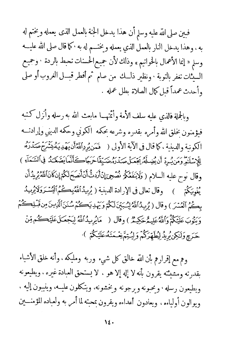 فَبَيَّنَ صَلَّى اللَّهُ عَلَيْهِ وَسَلَّمَ أَنَّ هَذَا يَدْخُلُ الْجَنَّةَ بِالْعَمَلِ الَّذِي يَعْمَلُهُ وَيُخْتَمُ لَهُ بِهِ وَهَذَا يَدْخُلُ النَّارَ بِالْعَمَلِ الَّذِي يَعْمَلُهُ وَيُخْتَمُ لَهُ بِهِ كَمَا قَالَ صَلَّى اللَّهُ عَلَيْهِ وَسَلَّمَ {إنَّمَا الْأَعْمَالُ بِالْخَوَاتِيمِ} وَذَلِكَ لِأَنَّ جَمِيعَ الْحَسَنَاتِ تُحْبَطُ بِالرِّدَّةِ وَجَمِيعُ السَّيِّئَاتِ تُغْفَرُ بِالتَّوْبَةِ وَنَظِيرُ ذَلِكَ مَنْ صَامَ ثُمَّ أَفْطَرَ قَبْلَ الْغُرُوبِ أَوْ صَلَّى وَأَحْدَثَ عَمْدًا قَبْلَ كَمَالِ الصَّلَاةِ بَطَلَ عَمَلُهُ. وَبِالْجُمْلَةِ فَاَلَّذِي عَلَيْهِ سَلَفُ الْأُمَّةِ وَأَئِمَّتُهَا مَا بَعَثَ اللَّهُ بِهِ رُسُلَهُ وَأَنْزَلَ كُتُبَهُ فَيُؤْمِنُونَ بِخَلْقِ اللَّهِ وَأَمْرِهِ بِقَدَرِهِ وَشَرْعِهِ بِحُكْمِهِ الْكَوْنِيِّ وَحُكْمِهِ الدِّينِيِّ وَإِرَادَتِهِ الْكَوْنِيَّةِ وَالدِّينِيَّةِ كَمَا قَالَ فِي الْآيَةِ الْأُولَى {فَمَنْ يُرِدِ اللَّهُ أَنْ يَهدِيَهُ يَشْرَحْ صَدْرَهُ لِلْإِسْلَامِ وَمَنْ يُرِدْ أَنْ يُضِلَّهُ يَجْعَلْ صَدْرَهُ ضَيِّقًا حَرَجًا كَأَنَّمَا يَصَّعَّدُ فِي السَّمَاءِ} وَقَالَ نُوحٌ عَلَيْهِ السَّلَامُ {وَلَا يَنْفَعُكُمْ نُصْحِي إنْ أَرَدْتُ أَنْ أَنْصَحَ لَكُمْ إنْ كَانَ اللَّهُ يُرِيدُ أَنْ يُغْوِيَكُمْ} وَقَالَ تَعَالَى فِي الْإِرَادَةِ الدِّينِيَّةِ {يُرِيدُ اللَّهُ بِكُمُ الْيُسْرَ وَلَا يُرِيدُ بِكُمُ الْعُسْرَ} وَقَالَ {يُرِيدُ اللَّهُ لِيُبَيِّنَ لَكُمْ وَيَهْدِيَكُمْ سُنَنَ الَّذِينَ مِنْ قَبْلِكُمْ وَيَتُوبَ عَلَيْكُمْ وَاللَّهُ عَلِيمٌ حَكِيمٌ} وَقَالَ {مَا يُرِيدُ اللَّهُ لِيَجْعَلَ عَلَيْكُمْ مِنْ حَرَجٍ وَلَكِنْ يُرِيدُ لِيُطَهِّرَكُمْ وَلِيُتِمَّ نِعْمَتَهُ عَلَيْكُمْ} . وَهُمْ مَعَ إقْرَارِهِمْ بِأَنَّ اللَّهَ خَالِقُ كُلِّ شَيْءٍ وَرَبُّهُ وَمَلِيكُهُ وَأَنَّهُ خَلَقَ الْأَشْيَاءَ بِقُدْرَتِهِ وَمَشِيئَتِهِ يُقِرُّونَ بِأَنَّهُ لَا إلَهَ إلَّا هُوَ لَا يَسْتَحِقُّ الْعِبَادَةَ غَيْرُهُ وَيُطِيعُونَهُ وَيُطِيعُونَ رُسُلَهُ وَيُحِبُّونَهُ وَيَرْجُونَهُ وَيَخْشَوْنَهُ وَيَتَّكِلُونَ عَلَيْهِ وَيُنِيبُونَ إلَيْهِ وَيُوَالُونَ أَوْلِيَاءَهُ وَيُعَادُونَ أَعْدَاءَهُ وَيُقِرُّونَ بِمَحَبَّتِهِ لِمَا أَمَرَ بِهِ وَلِعِبَادِهِ الْمُؤْمِنِينَ