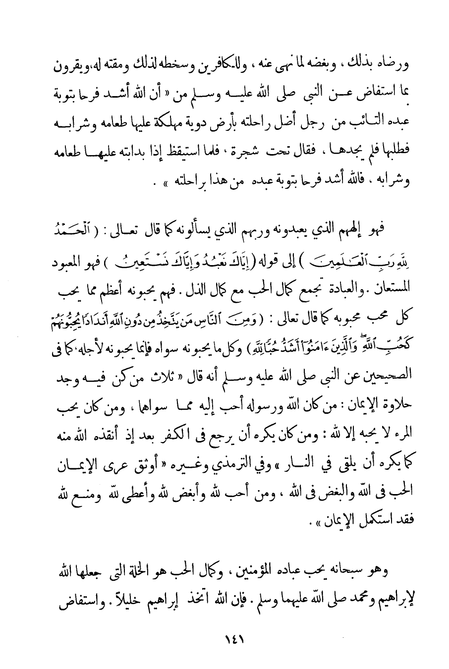 وَرِضَاهُ بِذَلِكَ وَبُغْضِهِ لِمَا نَهَى عَنْهُ وَلِلْكَافِرِينَ وَسُخْطِهِ لِذَلِكَ وَمَقْتِهِ لَهُ وَيُقِرُّونَ بِمَا اسْتَفَاضَ عَنْ النَّبِيِّ صَلَّى اللَّهُ عَلَيْهِ وَسَلَّمَ مِنْ {أَنَّ اللَّهَ أَشَدُّ فَرَحًا بِتَوْبَةِ عَبْدِهِ التَّائِبِ مِنْ رَجُلٍ أَضَلَّ رَاحِلَتَهُ بِأَرْضِ دَوِيَّةٍ مُهْلِكَةٍ عَلَيْهَا طَعَامُهُ وَشَرَابُهُ فَطَلَبَهَا فَلَمْ يَجِدْهَا فَقَالَ تَحْتَ شَجَرَةٍ فَلَمَّا اسْتَيْقَظَ إذَا بِدَابَّتِهِ عَلَيْهَا طَعَامُهُ وَشَرَابُهُ فَاَللَّهُ أَشَدُّ فَرَحًا بِتَوْبَةِ عَبْدِهِ مِنْ هَذَا بِرَاحِلَتِهِ} . فَهُوَ إلَهُهُمْ الَّذِي يَعْبُدُونَهُ وَرَبُّهُمْ الَّذِي يَسْأَلُونَهُ كَمَا قَالَ تَعَالَى: {الْحَمْدُ لِلَّهِ رَبِّ الْعَالَمِينَ} إلَى قَوْلِهِ {إيَّاكَ نَعْبُدُ وَإِيَّاكَ نَسْتَعِينُ} فَهُوَ الْمَعْبُودُ الْمُسْتَعَانُ. وَالْعِبَادَةُ تَجْمَعُ كَمَالَ الْحُبِّ مَعَ كَمَالِ الذُّلِّ. فَهُمْ يُحِبُّونَهُ أَعْظَمَ مِمَّا يُحِبُّ كُلُّ مُحِبٍّ مَحْبُوبَهُ كَمَا قَالَ تَعَالَى: {وَمِنَ النَّاسِ مَنْ يَتَّخِذُ مِنْ دُونِ اللَّهِ أَنْدَادًا يُحِبُّونَهُمْ كَحُبِّ اللَّهِ وَالَّذِينَ آمَنُوا أَشَدُّ حُبًّا لِلَّهِ} وَكُلُّ مَا يُحِبُّونَهُ سِوَاهُ فَإِنَّمَا يُحِبُّونَهُ لِأَجْلِهِ كَمَا فِي الصَّحِيحَيْنِ عَنْ النَّبِيِّ صَلَّى اللَّهُ عَلَيْهِ وَسَلَّمَ أَنَّهُ قَالَ {ثَلَاثٌ مَنْ كُنَّ فِيهِ وَجَدَ حَلَاوَةَ الْإِيمَانِ: مَنْ كَانَ اللَّهُ وَرَسُولُهُ أَحَبَّ إلَيْهِ مِمَّا سِوَاهُمَا وَمَنْ كَانَ يُحِبُّ الْمَرْءَ لَا يُحِبُّهُ إلَّا لِلَّهِ: وَمَنْ كَانَ يَكْرَهُ أَنْ يَرْجِعَ فِي الْكُفْرِ بَعْدَ إذْ أَنْقَذَهُ اللَّهُ مِنْهُ كَمَا يَكْرَهُ أَنْ يُلْقَى فِي النَّارِ} وَفِي التِّرْمِذِيِّ وَغَيْرِهِ {أَوْثَقُ عُرَى الْإِيمَانِ الْحُبُّ فِي اللَّهِ وَالْبُغْضُ فِي اللَّهِ وَمَنْ أَحَبَّ لِلَّهِ وَأَبْغَضَ لِلَّهِ وَأَعْطَى لِلَّهِ وَمَنَعَ لِلَّهِ فَقَدْ اسْتَكْمَلَ الْإِيمَانَ} . وَهُوَ سُبْحَانَهُ يُحِبُّ عِبَادَهُ الْمُؤْمِنِينَ وَكَمَالُ الْحُبِّ هُوَ الْخِلَّةُ الَّتِي جَعَلَهَا اللَّهُ لِإِبْرَاهِيمَ وَمُحَمَّدٍ صَلَّى اللَّهُ عَلَيْهِمَا وَسَلَّمَ. فَإِنَّ اللَّهَ اتَّخَذَ إبْرَاهِيمَ خَلِيلًا. وَاسْتَفَاضَ