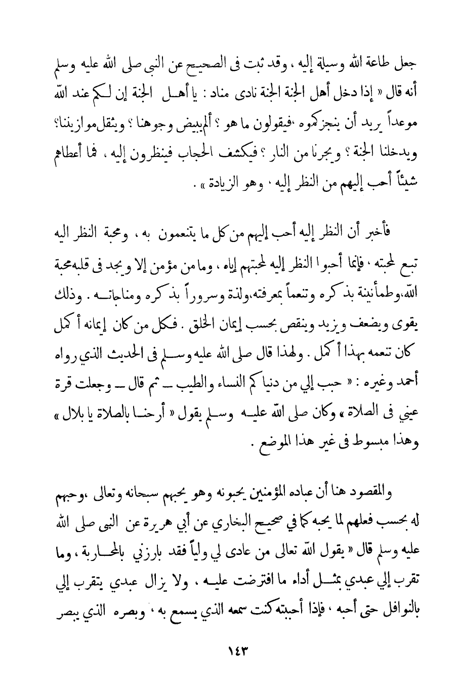 جَعَلَ طَاعَةَ اللَّهِ وَسِيلَةً إلَيْهِ وَقَدْ ثَبَتَ فِي الصَّحِيحِ عَنْ النَّبِيِّ صَلَّى اللَّهُ عَلَيْهِ وَسَلَّمَ أَنَّهُ قَالَ {إذَا دَخَلَ أَهْلُ الْجَنَّةِ الْجَنَّةَ نَادَى مُنَادٍ: يَا أَهْلَ الْجَنَّةِ إنَّ لَكُمْ عِنْدَ اللَّهِ مَوْعِدًا يُرِيدُ أَنْ ينجزكموه فَيَقُولُونَ مَا هُوَ؟ أَلَمْ يُبَيِّضْ وُجُوهَنَا؟ وَيُثَقِّلْ مَوَازِينَنَا؟ وَيُدْخِلْنَا الْجَنَّةَ؟ وَيُجِرْنَا مِنْ النَّارِ؟ فَيُكْشَفُ الْحِجَابُ فَيَنْظُرُونَ إلَيْهِ فَمَا أَعْطَاهُمْ شَيْئًا أَحَبَّ إلَيْهِمْ مِنْ النَّظَرِ إلَيْهِ وَهُوَ الزِّيَادَةُ} ". فَأَخْبَرَ أَنَّ النَّظَرَ إلَيْهِ أَحَبُّ إلَيْهِمْ مِنْ كُلِّ مَا يَتَنَعَّمُونَ بِهِ وَمَحَبَّةُ النَّظَرِ إلَيْهِ تَبَعٌ لِمَحَبَّتِهِ فَإِنَّمَا أَحَبُّوا النَّظَرَ إلَيْهِ لِمَحَبَّتِهِمْ إيَّاهُ وَمَا مِنْ مُؤْمِنٍ إلَّا وَيَجِدُ فِي قَلْبِهِ مَحَبَّةَ اللَّهِ وَطُمَأْنِينَةً بِذِكْرِهِ وَتَنَعُّمًا بِمَعْرِفَتِهِ وَلَذَّةً وَسُرُورًا بِذِكْرِهِ وَمُنَاجَاتِهِ. وَذَلِكَ يَقْوَى وَيَضْعُفُ وَيَزِيدُ وَيَنْقُصُ بِحَسَبِ إيمَانِ الْخَلْقِ. فَكُلُّ مَنْ كَانَ إيمَانُهُ أَكْمَلَ كَانَ تَنَعُّمُهُ بِهَذَا أَكْمَلَ. وَلِهَذَا قَالَ صَلَّى اللَّهُ عَلَيْهِ وَسَلَّمَ فِي الْحَدِيثِ الَّذِي رَوَاهُ أَحْمَد وَغَيْرُهُ: {حُبِّبَ إلَيَّ مِنْ دُنْيَاكُمْ النِّسَاءُ وَالطِّيبُ - ثُمَّ قَالَ - وَجُعِلَتْ قُرَّةُ عَيْنِي فِي الصَّلَاةِ} وَكَانَ صَلَّى اللَّهُ عَلَيْهِ وَسَلَّمَ يَقُولُ {أَرِحْنَا بِالصَّلَاةِ يَا بِلَالُ} وَهَذَا مَبْسُوطٌ فِي غَيْرِ هَذَا الْمَوْضِعِ. وَالْمَقْصُودُ هُنَا أَنَّ عِبَادَهُ الْمُؤْمِنِينَ يُحِبُّونَهُ وَهُوَ يُحِبُّهُمْ سُبْحَانَهُ وَتَعَالَى وَحُبُّهُمْ لَهُ بِحَسَبِ فِعْلِهِمْ لِمَا يُحِبُّهُ كَمَا فِي صَحِيحِ الْبُخَارِيِّ عَنْ أَبِي هُرَيْرَةَ عَنْ النَّبِيِّ صَلَّى اللَّهُ عَلَيْهِ وَسَلَّمَ قَالَ {يَقُولُ اللَّهُ تَعَالَى مَنْ عَادَى لِي وَلِيًّا فَقَدْ بَارَزَنِي بِالْمُحَارَبَةِ وَمَا تَقَرَّبَ إلَيَّ عَبْدِي بِمِثْلِ أَدَاءِ مَا افْتَرَضْت عَلَيْهِ وَلَا يَزَالُ عَبْدِي يَتَقَرَّبُ إلَيَّ بِالنَّوَافِلِ حَتَّى أُحِبَّهُ فَإِذَا أَحْبَبْته كُنْت سَمْعَهُ الَّذِي يَسْمَعُ بِهِ وَبَصَرَهُ الَّذِي يُبْصِرُ