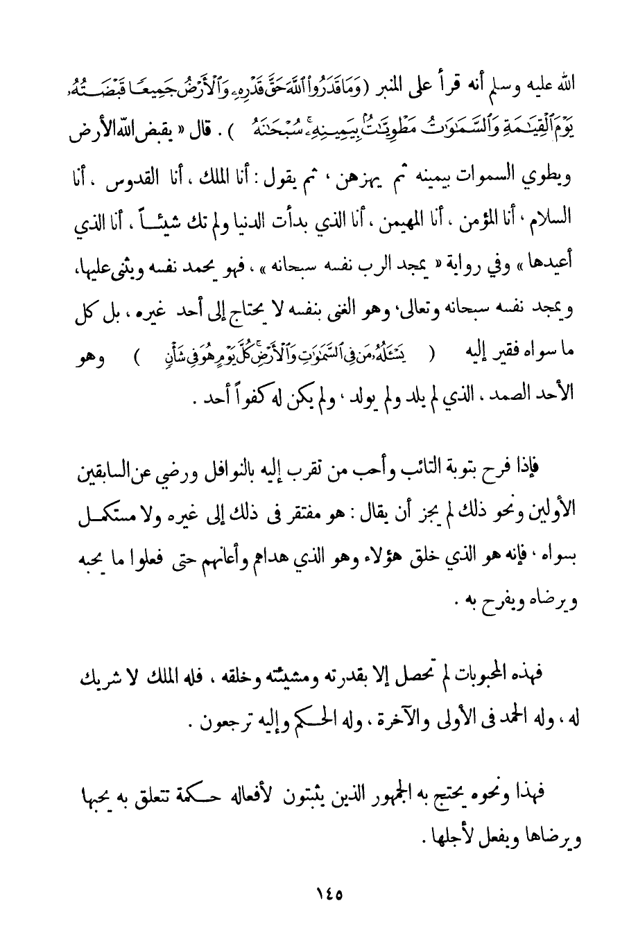 {أَنَّهُ قَرَأَ عَلَى الْمِنْبَرِ {وَمَا قَدَرُوا اللَّهَ حَقَّ قَدْرِهِ وَالْأَرْضُ جَمِيعًا قَبْضَتُهُ يَوْمَ الْقِيَامَةِ وَالسَّماوَاتُ مَطْوِيَّاتٌ بِيَمِينِهِ سُبْحَانَهُ} . قَالَ يَقْبِضُ اللَّهُ الْأَرْضَ وَيَطْوِي السَّمَوَاتِ بِيَمِينِهِ ثُمَّ يَهُزُّهُنَّ ثُمَّ يَقُولُ: أَنَا الْمَلِكُ أَنَا الْقُدُّوسُ أَنَا السَّلَامُ أَنَا الْمُؤْمِنُ أَنَا الْمُهَيْمِنُ أَنَا الَّذِي بَدَأْت الدُّنْيَا وَلَمْ تَكُ شَيْئًا أَنَا الَّذِي أُعِيدُهَا} وَفِي رِوَايَةٍ {يُمَجِّدُ الرَّبُّ نَفْسَهُ سُبْحَانَهُ} فَهُوَ يَحْمَدُ نَفْسَهُ وَيُثْنِي عَلَيْهَا وَيُمَجِّدُ نَفْسَهُ سُبْحَانَهُ وَتَعَالَى وَهُوَ الْغَنِيُّ بِنَفْسِهِ لَا يَحْتَاجُ إلَى أَحَدٍ غَيْرِهِ بَلْ كُلُّ مَا سِوَاهُ فَقِيرٌ إلَيْهِ {يَسْأَلُهُ مَنْ فِي السَّمَاوَاتِ وَالْأَرْضِ كُلَّ يَوْمٍ هُوَ فِي شَأْنٍ} وَهُوَ الْأَحَدُ الصَّمَدُ الَّذِي لَمْ يَلِدْ وَلَمْ يُولَدْ وَلَمْ يَكُنْ لَهُ كُفُوًا أَحَدٌ. فَإِذَا فَرِحَ بِتَوْبَةِ التَّائِبِ وَأَحَبَّ مَنْ تَقَرَّبَ إلَيْهِ بِالنَّوَافِلِ وَرَضِيَ عَنْ السَّابِقِينَ الْأَوَّلِينَ وَنَحْوِ ذَلِكَ لَمْ يَجُزْ أَنْ يُقَالَ: هُوَ مُفْتَقِرٌ فِي ذَلِكَ إلَى غَيْرِهِ وَلَا مُسْتَكْمَلٌ بِسِوَاهُ فَإِنَّهُ هُوَ الَّذِي خَلَقَ هَؤُلَاءِ وَهُوَ الَّذِي هَدَاهُمْ وَأَعَانَهُمْ حَتَّى فَعَلُوا مَا يُحِبُّهُ وَيَرْضَاهُ وَيَفْرَحُ بِهِ. فَهَذِهِ الْمَحْبُوبَاتُ لَمْ تَحْصُلْ إلَّا بِقُدْرَتِهِ وَمَشِيئَتِهِ وَخَلْقِهِ فَلَهُ الْمُلْكُ لَا شَرِيكَ لَهُ وَلَهُ الْحَمْدُ فِي الْأُولَى وَالْآخِرَةِ وَلَهُ الْحُكْمُ وَإِلَيْهِ تُرْجَعُونَ. فَهَذَا وَنَحْوُهُ يَحْتَجُّ بِهِ الْجُمْهُورُ الَّذِينَ يُثْبِتُونَ لِأَفْعَالِهِ حِكْمَةً تَتَعَلَّقُ بِهِ يُحِبُّهَا وَيَرْضَاهَا وَيَفْعَلُ لِأَجْلِهَا.