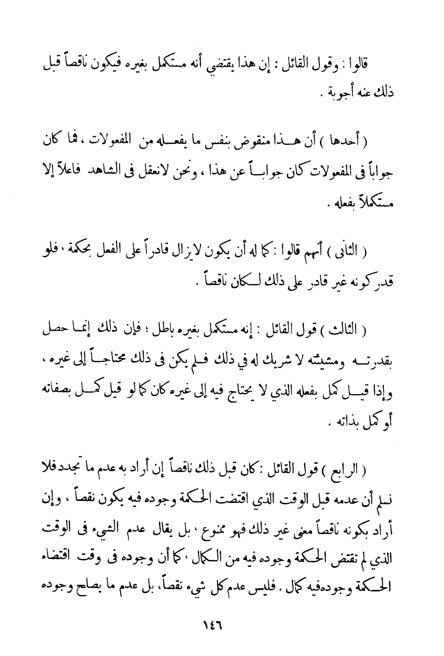 أَحَدُهَا: أَنَّ هَذَا مَنْقُوضٌ بِنَفْسِ مَا يَفْعَلُهُ مِنْ الْمَفْعُولَاتِ فَمَا كَانَ جَوَابًا فِي الْمَفْعُولَاتِ كَانَ جَوَابًا عَنْ هَذَا وَنَحْنُ لَا نَعْقِلُ فِي الشَّاهِدِ فَاعِلًا إلَّا مُسْتَكْمَلًا بِفِعْلِهِ. الثَّانِي أَنَّهُمْ قَالُوا: كَمَا لَهُ أَنْ يَكُونَ لَا يَزَالُ قَادِرًا عَلَى الْفِعْلِ بِحِكْمَةِ فَلَوْ قُدِّرَ كَوْنُهُ غَيْرَ قَادِرٍ عَلَى ذَلِكَ لَكَانَ نَاقِصًا. الثَّالِثُ قَوْلُ الْقَائِلِ: إنَّهُ مُسْتَكْمَلٌ بِغَيْرِهِ بَاطِلٌ؛ فَإِنَّ ذَلِكَ إنَّمَا حَصَلَ بِقُدْرَتِهِ وَمَشِيئَتِهِ لَا شَرِيكَ لَهُ فِي ذَلِكَ فَلَمْ يَكُنْ فِي ذَلِكَ مُحْتَاجًا إلَى غَيْرِهِ وَإِذَا قِيلَ كَمُلَ بِفِعْلِهِ الَّذِي لَا يُحْتَاجُ فِيهِ إلَى غَيْرِهِ كَانَ كَمَا لَوْ قِيلَ كَمُلَ بِصِفَاتِهِ أَوْ كَمُلَ بِذَاتِهِ. الرَّابِعُ قَوْلُ الْقَائِلِ: كَانَ قَبْلَ ذَلِكَ نَاقِصًا إنْ أَرَادَ بِهِ عَدَمَ مَا تَجَدَّدَ فَلَا نُسَلِّمُ أَنَّ عَدَمَهُ قَبْلَ الْوَقْتِ الَّذِي اقْتَضَتْ الْحِكْمَةُ وُجُودَهُ فِيهِ يَكُونُ نَقْصًا وَإِنْ أَرَادَ بِكَوْنِهِ نَاقِصًا مَعْنًى غَيْرَ ذَلِكَ فَهُوَ مَمْنُوعٌ بَلْ يُقَالُ عَدَمُ الشَّيْءِ فِي الْوَقْتِ الَّذِي لَمْ تَقْتَضِ الْحِكْمَةُ وُجُودَهُ فِيهِ مِنْ الْكَمَالِ كَمَا أَنَّ وُجُودَهُ فِي وَقْتِ اقْتِضَاءِ الْحِكْمَةِ وُجُودُهُ فِيهِ كَمَالٌ. فَلَيْسَ عَدَمُ كُلِّ شَيْءٍ نَقْصًا بَلْ عَدَمُ مَا يَصْلُحُ وُجُودُهُ