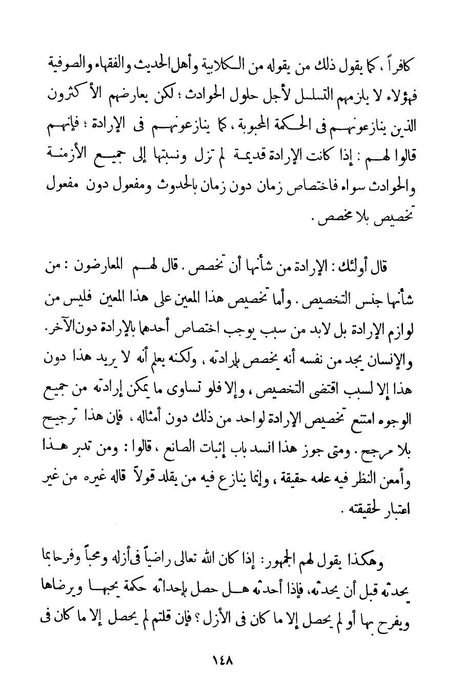 كَافِرًا كَمَا يَقُولُ ذَلِكَ مَنْ يَقُولُهُ مِنْ الْكُلَّابِيَة وَأَهْلِ الْحَدِيثِ وَالْفُقَهَاءِ وَالصُّوفِيَّةِ فَهَؤُلَاءِ لَا يَلْزَمُهُمْ التَّسَلْسُلُ لِأَجْلِ حُلُولِ الْحَوَادِثِ؛ لَكِنْ يُعَارِضُهُمْ الْأَكْثَرُونَ الَّذِينَ يُنَازِعُونَهُمْ فِي الْحِكْمَةِ الْمَحْبُوبَةِ كَمَا يُنَازِعُونَهُمْ فِي الْإِرَادَةِ؛ فَإِنَّهُمْ قَالُوا لَهُمْ: إذَا كَانَتْ الْإِرَادَةُ قَدِيمَةً لَمْ تَزَلْ وَنِسْبَتُهَا إلَى جَمِيعِ الْأَزْمِنَةِ وَالْحَوَادِثِ سَوَاءٌ فَاخْتِصَاصُ زَمَانٍ دُونَ زَمَانٍ بِالْحُدُوثِ وَمَفْعُولٍ دُونَ مَفْعُولٍ تَخْصِيصٌ بِلَا مُخَصِّصٍ. قَالَ أُولَئِكَ: الْإِرَادَةُ مِنْ شَأْنِهَا أَنْ تُخَصَّصَ. قَالَ لَهُمْ الْمُعَارِضُونَ: مِنْ شَأْنِهَا جِنْسُ التَّخْصِيصِ. وَأَمَّا تَخْصِيصُ هَذَا الْمُعَيَّنِ عَلَى هَذَا الْمُعَيَّنِ فَلَيْسَ مِنْهُ لَوَازِمُ الْإِرَادَةِ بَلْ لَا بُدَّ مِنْ سَبَبٍ يُوجِبُ اخْتِصَاصَ أَحَدِهِمَا بِالْإِرَادَةِ دُونَ الْآخَرِ. وَالْإِنْسَانُ يَجِدُ مِنْ نَفْسِهِ أَنَّهُ يُخَصَّصُ بِإِرَادَتِهِ وَلَكِنَّهُ يَعْلَمُ أَنَّهُ لَا يُرِيدُ هَذَا دُونَ هَذَا إلَّا لِسَبَبِ اقْتَضَى التَّخْصِيصَ وَإِلَّا فَلَوْ تَسَاوَى مَا يُمْكِنُ إرَادَتُهُ مِنْ جَمِيعِ الْوُجُوهِ امْتَنَعَ تَخْصِيصُ الْإِرَادَةِ لِوَاحِدِ مِنْ ذَلِكَ دُونَ أَمْثَالِهِ فَإِنَّ هَذَا تَرْجِيحٌ بِلَا مُرَجِّحٍ. وَمَتَى جُوِّزَ هَذَا انْسَدَّ بَابُ إثْبَاتِ الصَّانِعِ قَالُوا: وَمَنْ تَدَبَّرَ هَذَا وَأَمْعَنَ النَّظَرَ فِيهِ عَلِمَهُ حَقِيقَةً وَإِنَّمَا يُنَازِعُ فِيهِ مَنْ يُقَلِّدُ قَوْلًا قَالَهُ غَيْرُهُ مِنْ غَيْرِ اعْتِبَارٍ لِحَقِيقَتِهِ. وَهَكَذَا يَقُولُ لَهُمْ الْجُمْهُورُ: إذَا كَانَ اللَّهُ تَعَالَى رَاضِيًا فِي أَزَلِهِ وَمُحِبًّا وَفَرِحًا بِمَا يُحْدِثُهُ قَبْلَ أَنْ يُحْدِثَهُ فَإِذَا أَحْدَثَهُ هَلْ حَصَلَ بِإِحْدَاثِهِ حِكْمَةٌ يُحِبُّهَا وَيَرْضَاهَا وَيَفْرَحُ بِهَا أَوْ لَمْ يَحْصُلْ إلَّا مَا كَانَ فِي الْأَزَلِ؟ فَإِنْ قُلْتُمْ لَمْ يَحْصُلْ إلَّا مَا كَانَ فِي