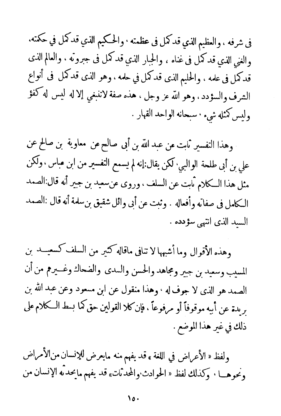 فِي شَرَفِهِ وَالْعَظِيمُ الَّذِي قَدْ كَمُلَ فِي عَظَمَتِهِ وَالْحَكِيمُ الَّذِي قَدْ كَمُلَ فِي حِكْمَتِهِ وَالْغَنِيُّ الَّذِي قَدْ كَمُلَ فِي غِنَاهُ وَالْجَبَّارُ الَّذِي قَدْ كَمُلَ فِي جَبَرُوتِهِ وَالْعَالِمُ الَّذِي قَدْ كَمُلَ فِي عِلْمِهِ وَالْحَلِيمُ الَّذِي قَدْ كَمُلَ فِي حِلْمِهِ وَهُوَ الَّذِي قَدْ كَمُلَ فِي أَنْوَاعِ الشَّرَفِ وَالسُّؤْدُدِ وَهُوَ اللَّهُ عَزَّ وَجَلَّ هَذِهِ صِفَةٌ لَا تَنْبَغِي إلَّا لَهُ لَيْسَ لَهُ كُفُؤٌ وَلَيْسَ كَمِثْلِهِ شَيْءٌ سُبْحَانَهُ الْوَاحِدُ الْقَهَّارُ. وَهَذَا التَّفْسِيرُ ثَابِتٌ عَنْ عَبْدِ اللَّهِ بْنِ أَبِي صَالِحٍ عَنْ مُعَاوِيَةَ بْنِ صَالِحٍ عَنْ عَلِيِّ بْنِ أَبِي طَلْحَةَ الوالبي لَكِنْ يُقَالُ: إنَّهُ لَمْ يُسْمَعْ التَّفْسِيرُ مِنْ ابْنِ عَبَّاسٍ وَلَكِنْ مِثْلُ هَذَا الْكَلَامِ ثَابِتٌ عَنْ السَّلَفِ وَرُوِيَ عَنْ سَعِيدِ بْنِ جُبَيْرٍ أَنَّهُ قَالَ: الصَّمَدُ الْكَامِلُ فِي صِفَاتِهِ وَأَفْعَالِهِ. وَثَبَتَ عَنْ أَبِي وَائِلٍ شَقِيقِ بْنِ سَلَمَةَ أَنَّهُ قَالَ: الصَّمَدُ السَّيِّدُ الَّذِي انْتَهَى سُؤْدُدُهُ. وَهَذِهِ الْأَقْوَالُ وَمَا أَشْبَهَهَا لَا تُنَافِي مَا قَالَهُ كَثِيرٌ مِنْ السَّلَفِ كَسَعِيدِ بْنِ الْمُسَيِّبِ وَسَعِيدِ بْنِ جُبَيْرٍ وَمُجَاهِدٍ وَالْحَسَنِ والسدي وَالضَّحَّاكِ وَغَيْرِهِمْ مِنْ أَنَّ الصَّمَدَ هُوَ الَّذِي لَا جَوْفَ لَهُ وَهَذَا مَنْقُولٌ عَنْ ابْنِ مَسْعُودٍ وَعَنْ عَبْدِ اللَّهِ بْنِ بريدة عَنْ أَبِيهِ مَوْقُوفًا أَوْ مَرْفُوعًا فَإِنَّ كِلَا الْقَوْلَيْنِ حَقٌّ كَمَا بُسِطَ الْكَلَامُ عَلَى ذَلِكَ فِي غَيْرِ هَذَا الْمَوْضِعِ. وَلَفْظُ " الْأَعْرَاضِ فِي اللُّغَةِ " قَدْ يُفْهَمُ مِنْهُ مَا يَعْرِضُ لِلْإِنْسَانِ مِنْ الْأَمْرَاضِ وَنَحْوِهَا وَكَذَلِكَ لَفْظُ " الْحَوَادِثِ وَالْمُحْدَثَاتِ " قَدْ يُفْهَمُ مَا يُحْدِثُهُ الْإِنْسَانُ