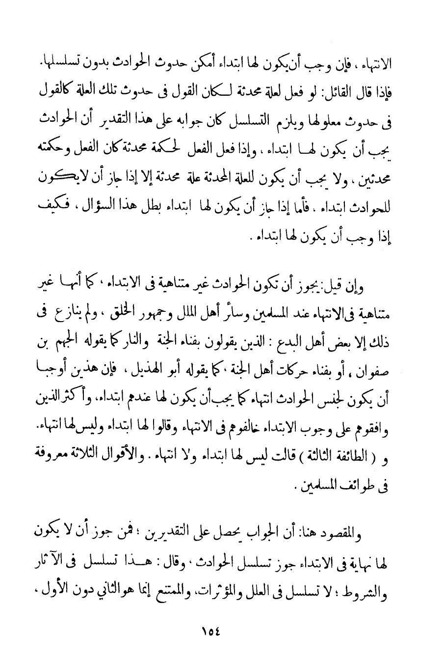 الِانْتِهَاءِ فَإِنْ وَجَبَ أَنْ يَكُونَ لَهَا ابْتِدَاءٌ أَمْكَنَ حُدُوثُ الْحَوَادِثِ بِدُونِ تَسَلْسُلِهَا فَإِذَا قَالَ الْقَائِلُ: لَوْ فَعَلَ لِعِلَّةِ مُحْدَثَةٍ لَكَانَ الْقَوْلُ فِي حُدُوثِ تِلْكَ الْعِلَّةِ كَالْقَوْلِ فِي حُدُوثِ مَعْلُولِهَا وَيَلْزَمُ التَّسَلْسُلُ كَانَ جَوَابُهُ عَلَى هَذَا التَّقْدِيرِ أَنَّ الْحَوَادِثَ يَجِبُ أَنْ يَكُونَ لَهَا ابْتِدَاءٌ وَإِذَا فَعَلَ الْفِعْلَ لِحِكْمَةِ مُحْدَثَةٍ كَانَ الْفِعْلُ وَحِكْمَتُهُ مُحْدَثَيْنِ وَلَا يَجِبُ أَنْ يَكُونَ لِلْعِلَّةِ الْمُحْدَثَةِ عِلَّةٌ مُحْدَثَةٌ إلَّا إذَا جَازَ أَنْ لَا يَكُونَ لِلْحَوَادِثِ ابْتِدَاءٌ. فَأَمَّا إذَا جَازَ أَنْ يَكُونَ لَهَا ابْتِدَاءٌ بَطَلَ هَذَا السُّؤَالُ فَكَيْفَ إذَا وَجَبَ أَنْ يَكُونَ لَهُمَا ابْتِدَاءٌ. وَإِنْ قِيلَ: يَجُوزُ أَنْ يَكُونَ الْحَوَادِثُ غَيْرَ مُتَنَاهِيَةٍ فِي الِابْتِدَاءِ كَمَا أَنَّهَا غَيْرُ مُتَنَاهِيَةٍ فِي الِانْتِهَاءِ عِنْدَ الْمُسْلِمِينَ وَسَائِرِ أَهْلِ الْمِلَلِ وَجُمْهُورِ الْخَلْقِ وَلَمْ يُنَازِعْ فِي ذَلِكَ إلَّا بَعْضُ أَهْلِ الْبِدَعِ: الَّذِينَ يَقُولُونَ بِفَنَاءِ الْجَنَّةِ وَالنَّارِ كَمَا يَقُولُهُ الْجَهْمُ بْنُ صَفْوَانَ أَوْ بِفَنَاءِ حَرَكَاتِ أَهْلِ الْجَنَّةِ كَمَا يَقُولُهُ أَبُو الهذيل فَإِنَّ هَذَيْنِ أَوْجَبَا أَنْ يَكُونَ لِجِنْسِ الْحَوَادِثِ انْتِهَاءٌ كَمَا يَجِبُ أَنْ يَكُونَ لَهَا عِنْدَهُمْ ابْتِدَاءٌ وَأَكْثَرُ الَّذِينَ وَافَقُوهُمْ عَلَى وُجُوبِ الِابْتِدَاءِ خَالَفُوهُمْ فِي الِانْتِهَاءِ وَقَالُوا لَهَا ابْتِدَاءٌ وَلَيْسَ لَهَا انْتِهَاءٌ. وَالطَّائِفَةُ الثَّالِثَةُ قَالَتْ لَيْسَ لَهَا ابْتِدَاءٌ وَلَا انْتِهَاءٌ. وَالْأَقْوَالُ الثَّلَاثَةُ مَعْرُوفَةٌ فِي طَوَائِفِ الْمُسْلِمِينَ. وَالْمَقْصُودُ هُنَا: أَنَّ الْجَوَابَ يَحْصُلُ عَلَى التَّقْدِيرَيْنِ؛ فَمَنْ جَوَّزَ أَنْ لَا يَكُونَ لَهَا نِهَايَةٌ فِي الِابْتِدَاءِ جَوَّزَ تَسَلْسُلَ الْحَوَادِثِ وَقَالَ: هَذَا تَسَلْسُلٌ فِي الْآثَارِ وَالشُّرُوطِ؛ لَا تَسَلْسُلٌ فِي الْعِلَلِ وَالْمُؤَثِّرَاتِ وَالْمُمْتَنِعُ إنَّمَا هُوَ الثَّانِي دُونَ الْأَوَّلِ
