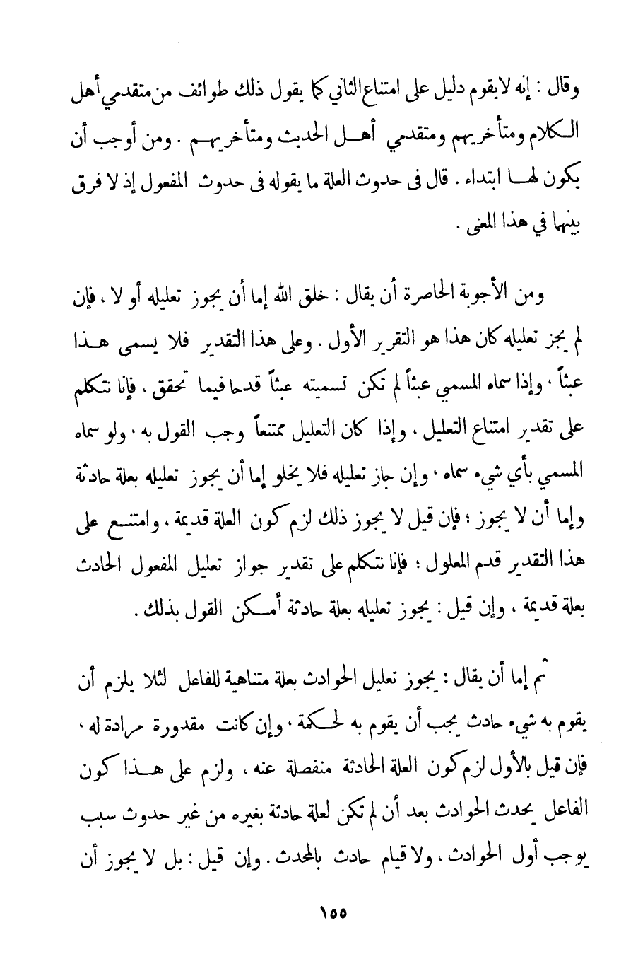 وَقَالَ: إنَّهُ لَا يَقُومُ دَلِيلٌ عَلَى امْتِنَاعِ الثَّانِي كَمَا يَقُولُ ذَلِكَ طَوَائِفُ مِنْ مُتَقَدِّمِي أَهْلِ الْكَلَامِ وَمُتَأَخِّرِيهِمْ وَمُتَقَدِّمِي أَهْلِ الْحَدِيثِ وَمُتَأَخِّرِيهِمْ. وَمَنْ أَوْجَبَ أَنْ يَكُونَ لَهَا ابْتِدَاءٌ. قَالَ فِي حُدُوثِ الْعِلَّةِ مَا يَقُولُهُ فِي حُدُوثِ الْمَفْعُولِ إذْ لَا فَرْقَ بَيْنَهُمَا فِي هَذَا الْمَعْنَى. وَمِنْ الْأَجْوِبَةِ الْحَاصِرَةِ أَنْ يُقَالَ: خَلْقُ اللَّهِ إمَّا أَنْ يَجُوزَ تَعْلِيلُهُ أَوْ لَا فَإِنْ لَمْ يَجُزْ تَعْلِيلُهُ كَانَ هَذَا هُوَ التَّقْرِيرَ الْأَوَّلَ. وَعَلَى هَذَا التَّقْدِيرِ فَلَا يُسَمَّى هَذَا عَبَثًا وَإِذَا سَمَّاهُ الْمُسَمِّي عَبَثًا لَمْ تَكُنْ تَسْمِيَتُهُ عَبَثًا قَدْحًا فِيمَا تَحَقَّقَ فَإِنَّا نَتَكَلَّمُ عَلَى تَقْدِيرِ امْتِنَاعِ التَّعْلِيلِ وَإِذَا كَانَ التَّعْلِيلُ مُمْتَنِعًا وَجَبَ الْقَوْلُ بِهِ وَلَوْ سَمَّاهُ الْمُسَمِّي بِأَيِّ شَيْءٍ سَمَّاهُ وَإِنْ جَازَ تَعْلِيلُهُ فَلَا يَخْلُو إمَّا أَنْ يَجُوزَ تَعْلِيلُهُ بِعِلَّةِ حَادِثَةٍ وَإِمَّا أَنْ لَا يَجُوزَ؛ فَإِنْ قِيلَ لَا يَجُوزُ ذَلِكَ لَزِمَ كَوْنُ الْعِلَّةِ قَدِيمَةً وَامْتَنَعَ عَلَى هَذَا التَّقْدِيرِ قِدَمُ الْمَعْلُولِ؛ فَإِنَّا نَتَكَلَّمُ عَلَى تَقْدِيرِ جَوَازِ تَعْلِيلِ الْمَفْعُولِ الْحَادِثِ بِعِلَّةِ قَدِيمَةٍ وَإِنْ قِيلَ: يَجُوزُ تَعْلِيلُهُ بِعِلَّةِ حَادِثَةٍ أَمْكَنَ الْقَوْلُ بِذَلِكَ. ثُمَّ إمَّا أَنْ يُقَالَ: يَجُوزُ تَعْلِيلُ الْحَوَادِثِ بِعِلَّةِ مُتَنَاهِيَةٍ لِلْفَاعِلِ لِئَلَّا يَلْزَمَ أَنْ يَقُومَ بِهِ شَيْءٌ حَادِثٌ يَجِبُ أَنْ يَقُومَ بِهِ لِحِكْمَةِ وَإِنْ كَانَتْ مَقْدُورَةً مُرَادَةً لَهُ فَإِنْ قِيلَ بِالْأَوَّلِ لَزِمَ كَوْنُ الْعِلَّةِ الْحَادِثَةِ مُنْفَصِلَةً عَنْهُ وَلَزِمَ عَلَى هَذَا كَوْنُ الْفَاعِلِ يُحْدِثُ الْحَوَادِثَ بَعْدَ أَنْ لَمْ تَكُنْ لِعِلَّةِ حَادِثَةٍ بِغَيْرِهِ مِنْ غَيْرِ حُدُوثِ سَبَبٍ يُوجِبُ أَوَّلَ الْحَوَادِثِ وَلَا قِيَامَ لِحَادِثِ بِالْمُحْدَثِ. وَإِنْ قِيلَ: بَلْ لَا يَجُوزُ أَنْ