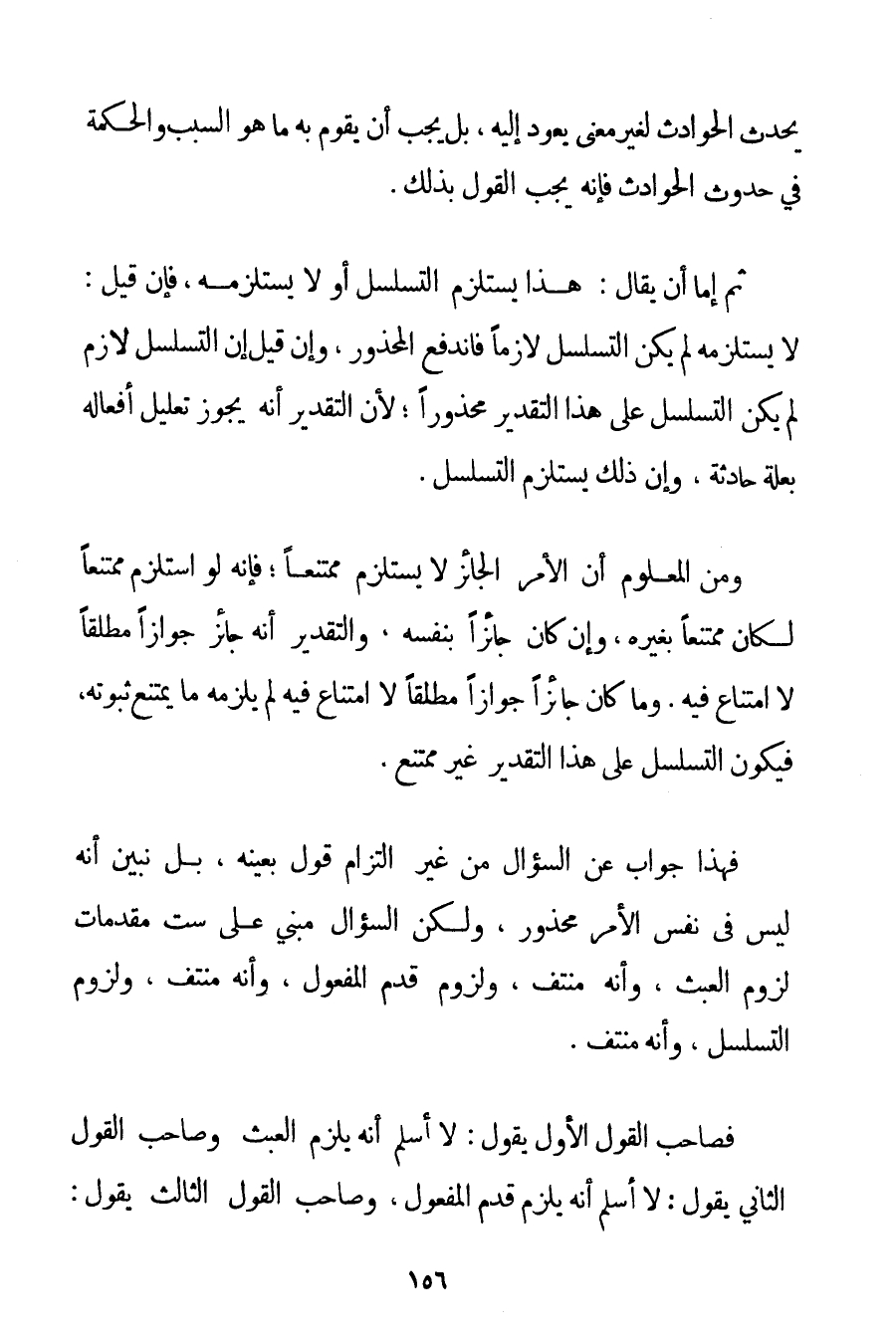 يُحْدِثَ الْحَوَادِثَ لِغَيْرِ مَعْنًى يَعُودُ إلَيْهِ بَلْ يَجِبُ أَنْ يَقُومَ بِهِ مَا هُوَ السَّبَبُ وَالْحِكْمَةُ فِي حُدُوثِ الْحَوَادِثِ فَإِنَّهُ يَجِبُ الْقَوْلُ بِذَلِكَ. ثُمَّ إمَّا أَنْ يُقَالَ: هَذَا يَسْتَلْزِمُ التَّسَلْسُلَ أَوْ لَا يَسْتَلْزِمُهُ فَإِنْ قِيلَ لَا يَسْتَلْزِمُهُ لَمْ يَكُنْ التَّسَلْسُلُ لَازِمًا فَانْدَفَعَ الْمَحْذُورُ وَإِنْ قِيلَ إنَّ التَّسَلْسُلَ لَازِمٌ لَمْ يَكُنْ التَّسَلْسُلُ عَلَى هَذَا التَّقْدِيرِ مَحْذُورًا؛ لِأَنَّ التَّقْدِيرَ أَنَّهُ يَجُوزُ تَعْلِيلُ أَفْعَالِهِ بِعِلَّةِ حَادِثَةٍ. وَأَنَّ ذَلِكَ يَسْتَلْزِمُ التَّسَلْسُلَ. وَمِنْ الْمَعْلُومِ أَنَّ الْأَمْرَ الْجَائِزَ لَا يَسْتَلْزِمُ مُمْتَنِعًا؛ فَإِنَّهُ لَوْ اسْتَلْزَمَ مُمْتَنِعًا لَكَانَ مُمْتَنِعًا بِغَيْرِهِ وَإِنْ كَانَ جَائِزًا بِنَفْسِهِ وَالتَّقْدِيرُ أَنَّهُ جَائِزٌ جَوَازًا مُطْلَقًا لَا امْتِنَاعَ فِيهِ. وَمَا كَانَ جَائِزًا جَوَازًا مُطْلَقًا لَا امْتِنَاعَ فِيهِ لَمْ يَلْزَمْهُ مَا يَمْتَنِعُ ثُبُوتُهُ فَيَكُونُ التَّسَلْسُلُ عَلَى هَذَا التَّقْدِيرِ غَيْرَ مُمْتَنِعٍ. فَهَذَا جَوَابٌ عَنْ السُّؤَالِ مِنْ غَيْرِ الْتِزَامِ قَوْلٍ بِعَيْنِهِ بَلْ نُبَيِّنُ أَنَّهُ لَيْسَ فِي نَفْسِ الْأَمْرِ مَحْذُورًا وَلَكِنَّ السُّؤَالَ مَبْنِيٌّ عَلَى سِتِّ مُقَدِّمَاتٍ لُزُومُ الْعَبَثِ وَأَنَّهُ مُنْتَفٍ وَلُزُومُ قِدَمِ الْمَفْعُولِ وَأَنَّهُ مُنْتَفٍ وَلُزُومُ التَّسَلْسُلِ وَأَنَّهُ مُنْتَفٍ. فَصَاحِبُ الْقَوْلِ الْأَوَّلِ يَقُولُ: لَا أُسَلِّمُ أَنَّهُ يَلْزَمُ الْعَبَثُ وَصَاحِبُ الْقَوْلِ الثَّانِي يَقُولُ: لَا أُسَلِّمُ أَنَّهُ يَلْزَمُ قِدَمُ الْمَفْعُولِ وَصَاحِبُ الْقَوْلِ الثَّالِثِ يَقُولُ: