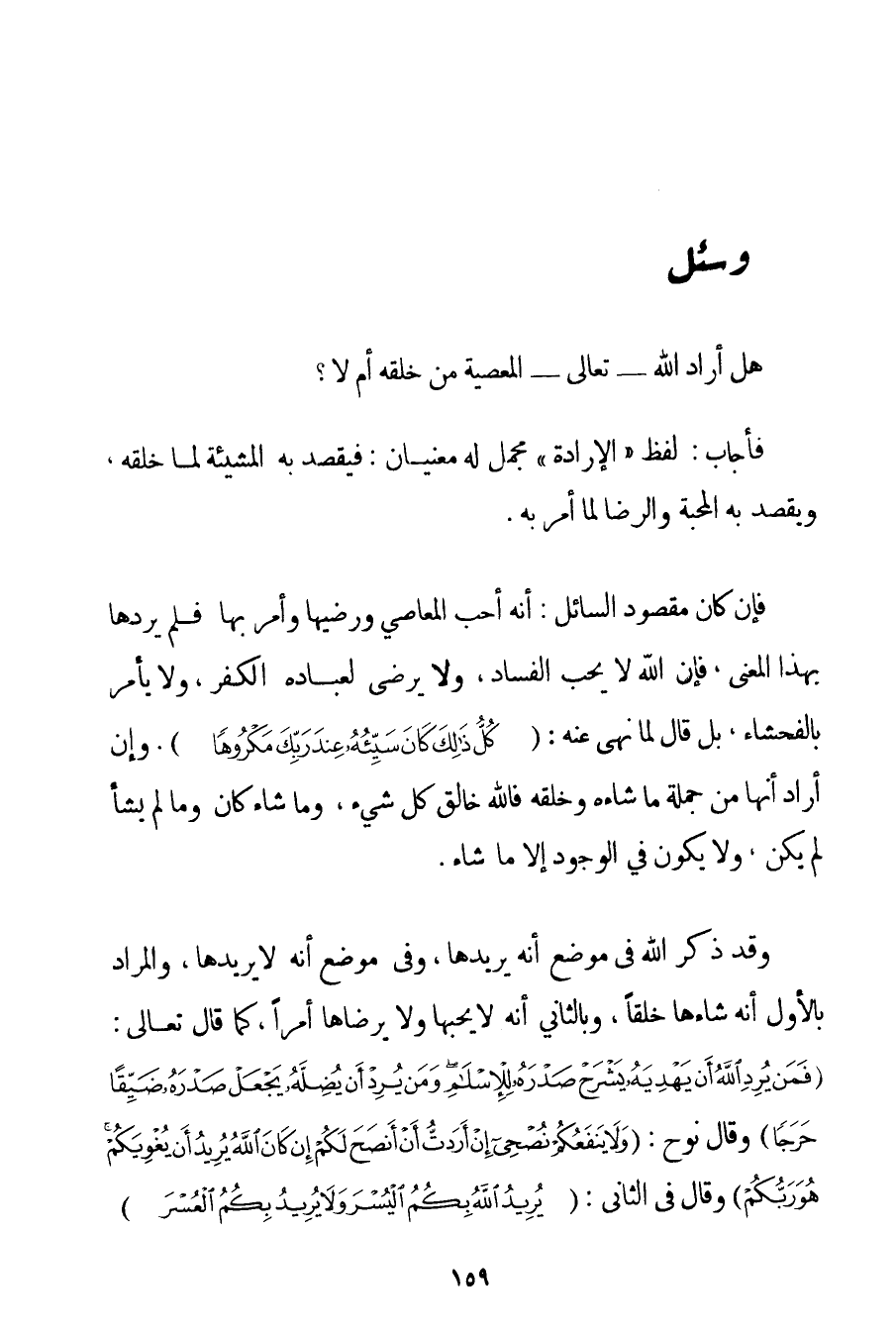 لَفْظُ " الْإِرَادَةِ " مُجْمَلٌ لَهُ مَعْنَيَانِ: فَيُقْصَدُ بِهِ الْمَشِيئَةُ لِمَا خَلَقَهُ وَيُقْصَدُ بِهِ الْمَحَبَّةُ وَالرِّضَا لِمَا أَمَرَ بِهِ. فَإِنْ كَانَ مَقْصُودُ السَّائِلِ: أَنَّهُ أَحَبَّ الْمَعَاصِيَ وَرَضِيَهَا وَأَمَرَ بِهَا فَلَمْ يُرِدْهَا بِهَذَا الْمَعْنَى فَإِنَّ اللَّهَ لَا يُحِبُّ الْفَسَادَ وَلَا يَرْضَى لِعِبَادِهِ الْكُفْرَ وَلَا يَأْمُرُ بِالْفَحْشَاءِ بَلْ قَالَ لِمَا نَهَى عَنْهُ: {كُلُّ ذَلِكَ كَانَ سَيِّئُهُ عِنْدَ رَبِّكَ مَكْرُوهًا} . وَإِنْ أَرَادَ أَنَّهَا مِنْ جُمْلَةِ مَا شَاءَهُ وَخَلَقَهُ فَاَللَّهُ خَالِقُ كُلِّ شَيْءٍ وَمَا شَاءَ كَانَ وَمَا لَمْ يَشَأْ لَمْ يَكُنْ وَلَا يَكُونُ فِي الْوُجُودِ إلَّا مَا شَاءَ. وَقَدْ ذَكَرَ اللَّهُ فِي مَوْضِعٍ أَنَّهُ يُرِيدُهَا وَفِي مَوْضِعٍ أَنَّهُ لَا يُرِيدُهَا وَالْمُرَادُ بِالْأَوَّلِ أَنَّهُ شَاءَهَا خَلْقًا وَبِالثَّانِي أَنَّهُ لَا يُحِبُّهَا وَلَا يَرْضَاهَا أَمْرًا كَمَا قَالَ تَعَالَى: {فَمَنْ يُرِدِ اللَّهُ أَنْ يَهدِيَهُ يَشْرَحْ صَدْرَهُ لِلْإِسْلَامِ وَمَنْ يُرِدْ أَنْ يُضِلَّهُ يَجْعَلْ صَدْرَهُ ضَيِّقًا حَرَجًا} وَقَالَ نُوحٌ: {وَلَا يَنْفَعُكُمْ نُصْحِي إنْ أَرَدْتُ أَنْ أَنْصَحَ لَكُمْ إنْ كَانَ اللَّهُ يُرِيدُ أَنْ يُغْوِيَكُمْ هُوَ رَبُّكُمْ} وَقَالَ فِي الثَّانِي: {يُرِيدُ اللَّهُ بِكُمُ الْيُسْرَ وَلَا يُرِيدُ بِكُمُ