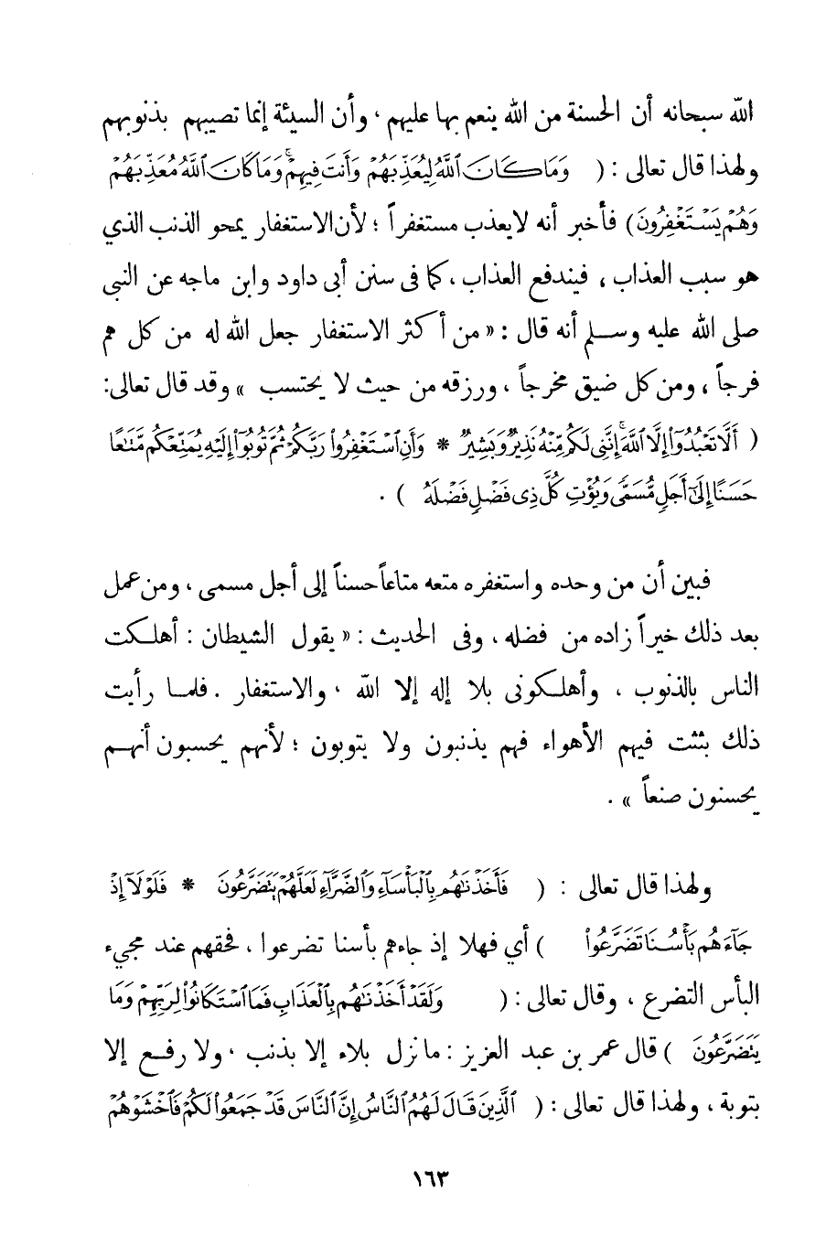 اللَّهُ سُبْحَانَهُ أَنَّ الْحَسَنَةَ مِنْ اللَّهِ يُنْعِمُ بِهَا عَلَيْهِمْ وَأَنَّ السَّيِّئَةَ إنَّمَا تُصِيبُهُمْ بِذُنُوبِهِمْ وَلِهَذَا قَالَ تَعَالَى: {وَمَا كَانَ اللَّهُ لِيُعَذِّبَهُمْ وَأَنْتَ فِيهِمْ وَمَا كَانَ اللَّهُ مُعَذِّبَهُمْ وَهُمْ يَسْتَغْفِرُونَ} فَأَخْبَرَ أَنَّهُ لَا يُعَذِّبُ مُسْتَغْفِرًا؛ لِأَنَّ الِاسْتِغْفَارَ يَمْحُو الذَّنْبَ الَّذِي هُوَ سَبَبُ الْعَذَابِ فَيَنْدَفِعُ الْعَذَابُ كَمَا فِي سُنَنِ أَبِي دَاوُد وَابْنِ مَاجَه عَنْ النَّبِيِّ صَلَّى اللَّهُ عَلَيْهِ وَسَلَّمَ أَنَّهُ قَالَ: {مَنْ أَكْثَرَ الِاسْتِغْفَارَ جَعَلَ اللَّهُ لَهُ مِنْ كُلِّ هَمٍّ فَرَجًا وَمِنْ كُلِّ ضِيقٍ مَخْرَجًا وَرَزَقَهُ مِنْ حَيْثُ لَا يَحْتَسِبُ} وَقَدْ قَالَ تَعَالَى: {أَلَّا تَعْبُدُوا إلَّا اللَّهَ إنَّنِي لَكُمْ مِنْهُ نَذِيرٌ وَبَشِيرٌ} {وَأَنِ اسْتَغْفِرُوا رَبَّكُمْ ثُمَّ تُوبُوا إلَيْهِ يُمَتِّعْكُمْ مَتَاعًا حَسَنًا إلَى أَجَلٍ مُسَمًّى وَيُؤْتِ كُلَّ ذِي فَضْلٍ فَضْلَهُ} . فَبَيَّنَ أَنَّ مَنْ وَحَّدَهُ وَاسْتَغْفَرَهُ مَتَّعَهُ مَتَاعًا حَسَنًا إلَى أَجَلٍ مُسَمًّى وَمَنْ عَمِلَ بَعْدَ ذَلِكَ خَيْرًا زَادَهُ مِنْ فَضْلِهِ وَفِي الْحَدِيثِ: {يَقُولُ الشَّيْطَانُ: أَهْلَكْتُ النَّاسَ بِالذُّنُوبِ وَأَهْلَكُونِي بِلَا إلَهَ إلَّا اللَّهُ وَالِاسْتِغْفَارِ. فَلَمَّا رَأَيْتُ ذَلِكَ بَثَثْتُ فِيهِمْ الْأَهْوَاءَ فَهُمْ يُذْنِبُونَ وَلَا يَتُوبُونَ؛ لِأَنَّهُمْ يَحْسَبُونَ أَنَّهُمْ يُحْسِنُونَ صُنْعًا} . وَلِهَذَا قَالَ تَعَالَى: {فَأَخَذْنَاهُمْ بِالْبَأْسَاءِ وَالضَّرَّاءِ لَعَلَّهُمْ يَتَضَرَّعُونَ} {فَلَوْلَا إذْ جَاءَهُمْ بَأْسُنَا تَضَرَّعُوا} أَيْ فَهَلَّا إذْ جَاءَهُمْ بَأْسُنَا تَضَرَّعُوا فَحَقُّهُمْ عِنْدَ مَجِيءِ الْبَأْسِ التَّضَرُّعُ وَقَالَ تَعَالَى: {وَلَقَدْ أَخَذْنَاهُمْ بِالْعَذَابِ فَمَا اسْتَكَانُوا لِرَبِّهِمْ وَمَا يَتَضَرَّعُونَ} قَالَ عُمَرُ بْنُ عَبْدِ الْعَزِيزِ: مَا نَزَلَ بَلَاءٌ إلَّا بِذَنْبِ وَلَا رُفِعَ إلَّا بِتَوْبَةِ وَلِهَذَا قَالَ تَعَالَى: {الَّذِينَ قَالَ لَهُمُ النَّاسُ إنَّ النَّاسَ قَدْ جَمَعُوا لَكُمْ