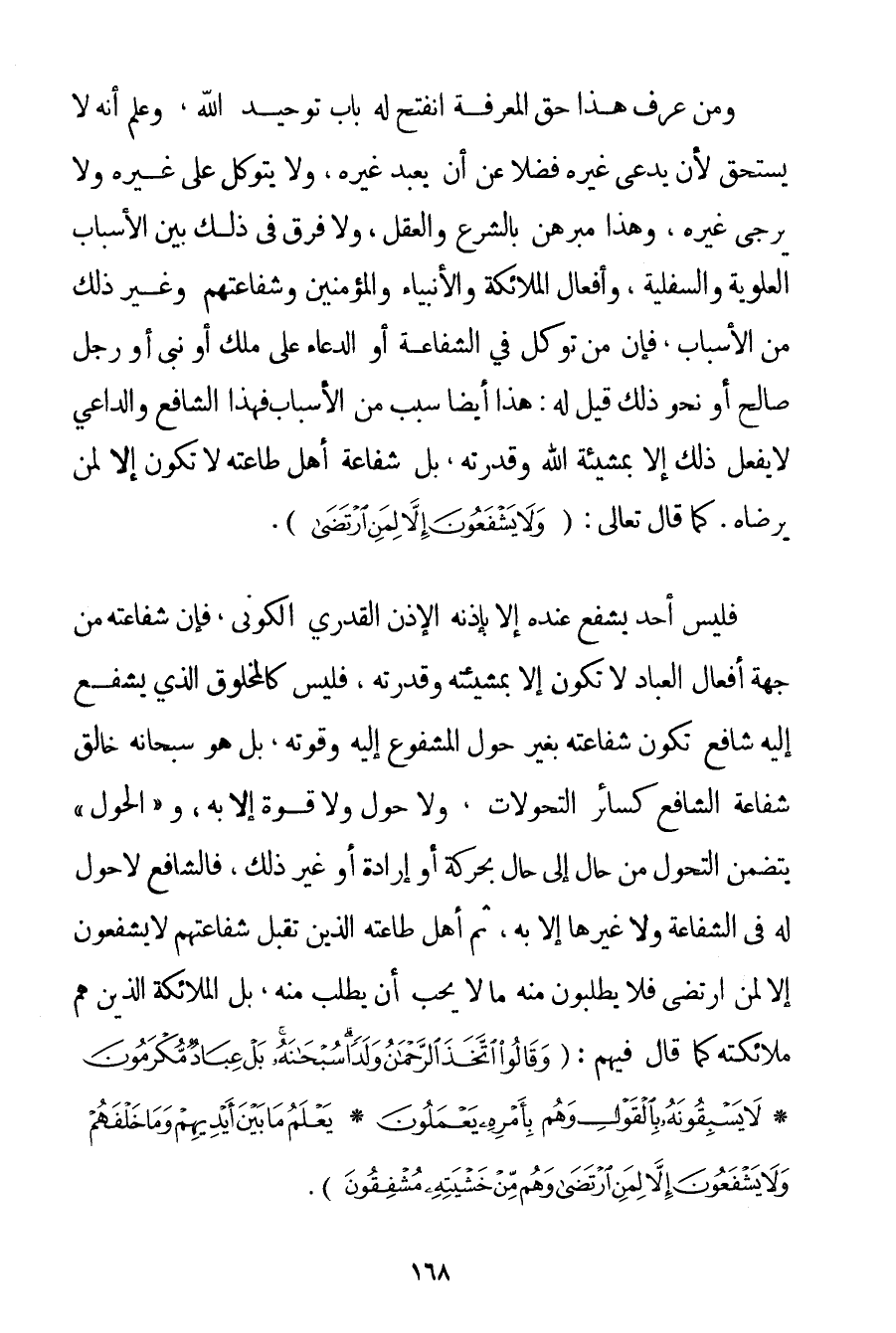 وَمَنْ عَرَفَ هَذَا حَقَّ الْمَعْرِفَةِ انْفَتَحَ لَهُ بَابُ تَوْحِيدِ اللَّهِ وَعَلِمَ أَنَّهُ لَا يَسْتَحِقُّ لِأَنْ يُدْعَى غَيْرُهُ فَضْلًا عَنْ أَنْ يُعْبَدَ غَيْرُهُ وَلَا يُتَوَكَّلَ عَلَى غَيْرِهِ وَلَا يُرْجَى غَيْرُهُ وَهَذَا مُبَرْهَنٌ بِالشَّرْعِ وَالْعَقْلِ وَلَا فَرْقَ فِي ذَلِكَ بَيْنَ الْأَسْبَابِ الْعُلْوِيَّةِ وَالسُّفْلِيَّةِ وَأَفْعَالِ الْمَلَائِكَةِ وَالْأَنْبِيَاءِ وَالْمُؤْمِنِينَ وَشَفَاعَتِهِمْ وَغَيْرِ ذَلِكَ مِنْ الْأَسْبَابِ فَإِنَّ مَنْ تَوَكَّلَ فِي الشَّفَاعَةِ أَوْ الدُّعَاءِ عَلَى مَلَكٍ أَوْ نَبِيٍّ أَوْ رَجُلٍ صَالِحٍ أَوْ نَحْوِ ذَلِكَ قِيلَ لَهُ: هَذَا أَيْضًا سَبَبٌ مِنْ الْأَسْبَابِ فَهَذَا الشَّافِعُ وَالدَّاعِي لَا يَفْعَلُ ذَلِكَ إلَّا بِمَشِيئَةِ اللَّهِ وَقُدْرَتِهِ بَلْ شَفَاعَةُ أَهْلِ طَاعَتِهِ لَا تَكُونُ إلَّا لِمَنْ يَرْضَاهُ. كَمَا قَالَ تَعَالَى: {وَلَا يَشْفَعُونَ إلَّا لِمَنِ ارْتَضَى} . فَلَيْسَ أَحَدٌ يَشْفَعُ عِنْدَهُ إلَّا بِإِذْنِهِ الْإِذْنَ الْقَدَرِيَّ الْكَوْنِيَّ فَإِنَّ شَفَاعَتَهُ مِنْ جِهَةِ أَفْعَالِ الْعِبَادِ لَا تَكُونُ إلَّا بِمَشِيئَتِهِ وَقُدْرَتِهِ فَلَيْسَ كَالْمَخْلُوقِ الَّذِي يَشْفَعُ إلَيْهِ شَافِعٌ تَكُونُ شَفَاعَتُهُ بِغَيْرِ حَوْلِ الْمَشْفُوعِ إلَيْهِ وَقُوَّتِهِ بَلْ هُوَ سُبْحَانَهُ خَالِقُ شَفَاعَةِ الشَّافِعِ كَسَائِرِ التَّحَوُّلَاتِ وَلَا حَوْلَ وَلَا قُوَّةَ إلَّا بِهِ و " الْحَوْلُ " يَتَضَمَّنُ التَّحَوُّلَ مِنْ حَالٍ إلَى حَالٍ بِحَرَكَةِ أَوْ إرَادَةٍ أَوْ غَيْرِ ذَلِكَ فَالشَّافِعُ لَا حَوْلَ لَهُ فِي الشَّفَاعَةِ وَلَا غَيْرِهَا إلَّا بِهِ ثُمَّ أَهْلُ طَاعَتِهِ الَّذِينَ تُقْبَلُ شَفَاعَتُهُمْ لَا يَشْفَعُونَ إلَّا لِمَنْ ارْتَضَى فَلَا يَطْلُبُونَ مِنْهُ مَا لَا يُحِبُّ أَنْ يُطْلَبَ مِنْهُ بَلْ الْمَلَائِكَةُ الَّذِينَ هُمْ مَلَائِكَتُهُ كَمَا قَالَ فِيهِمْ: {وَقَالُوا اتَّخَذَ الرَّحْمَنُ وَلَدًا سُبْحَانَهُ بَلْ عِبَادٌ مُكْرَمُونَ} {لَا يَسْبِقُونَهُ بِالْقَوْلِ وَهُمْ بِأَمْرِهِ يَعْمَلُونَ} {يَعْلَمُ مَا بَيْنَ أَيْدِيهِمْ وَمَا خَلْفَهُمْ وَلَا يَشْفَعُونَ إلَّا لِمَنِ ارْتَضَى وَهُمْ مِنْ خَشْيَتِهِ مُشْفِقُونَ} .